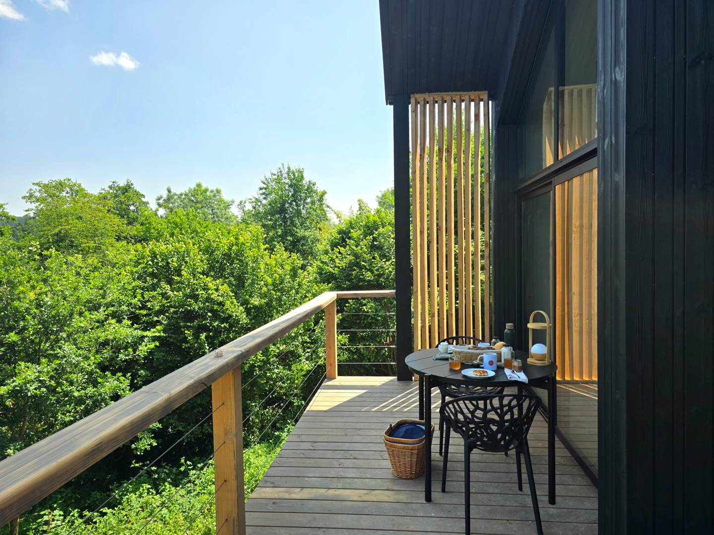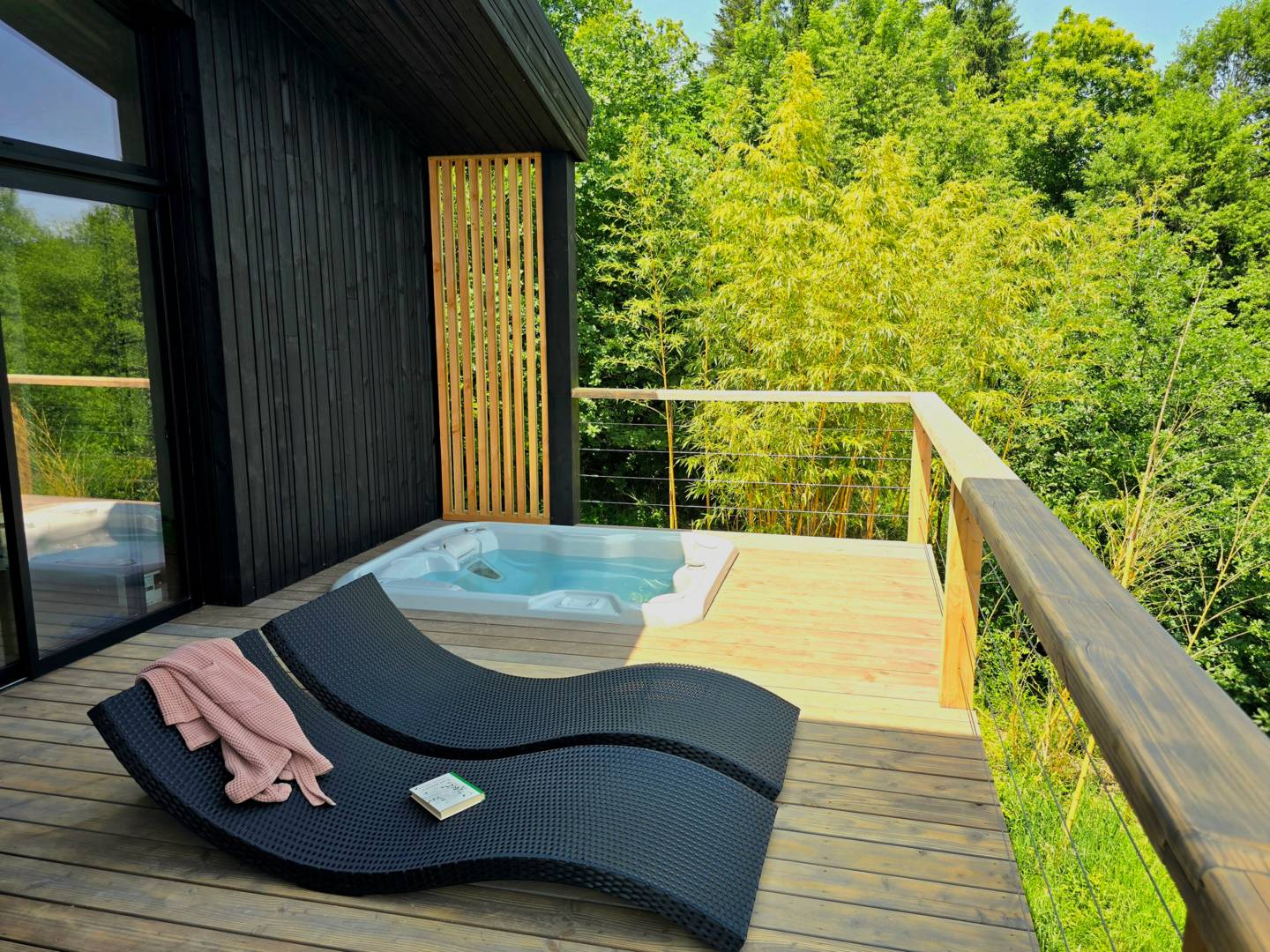 Nichée dans les arbres, la cabane Petite Ourse vous offre une parenthèse intime et design, avec bardage noir, baies vitrées, terrasse perchée et jacuzzi massant. Vivez une nuit en pleine nature, sans compromis sur le confort et la qualité.