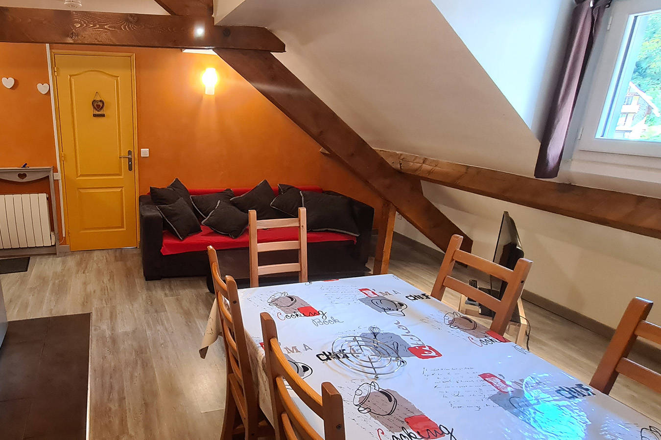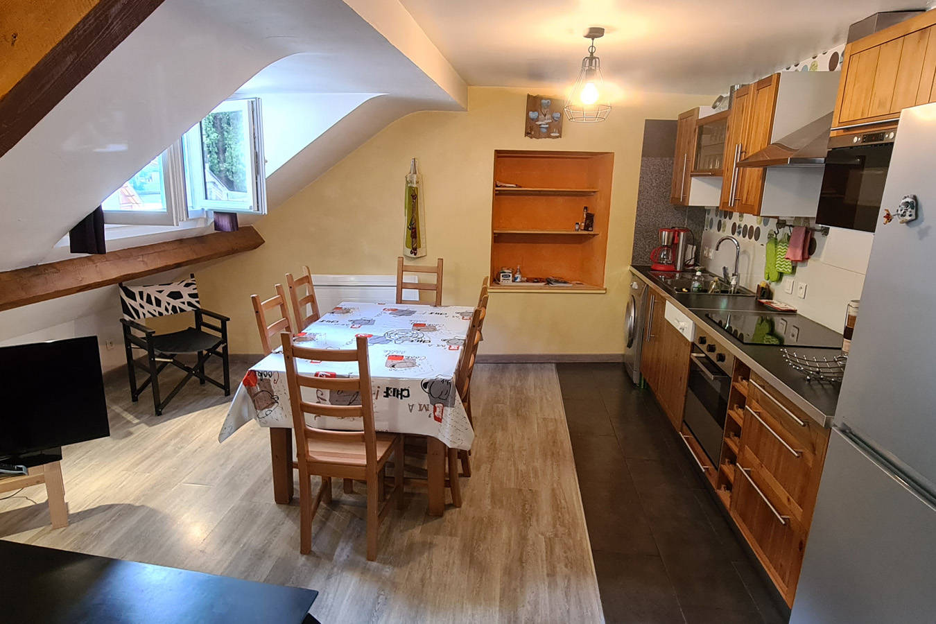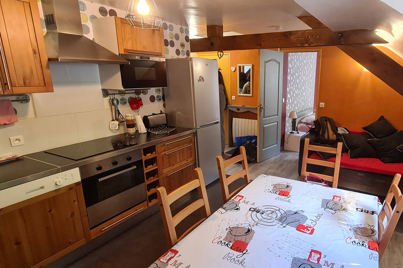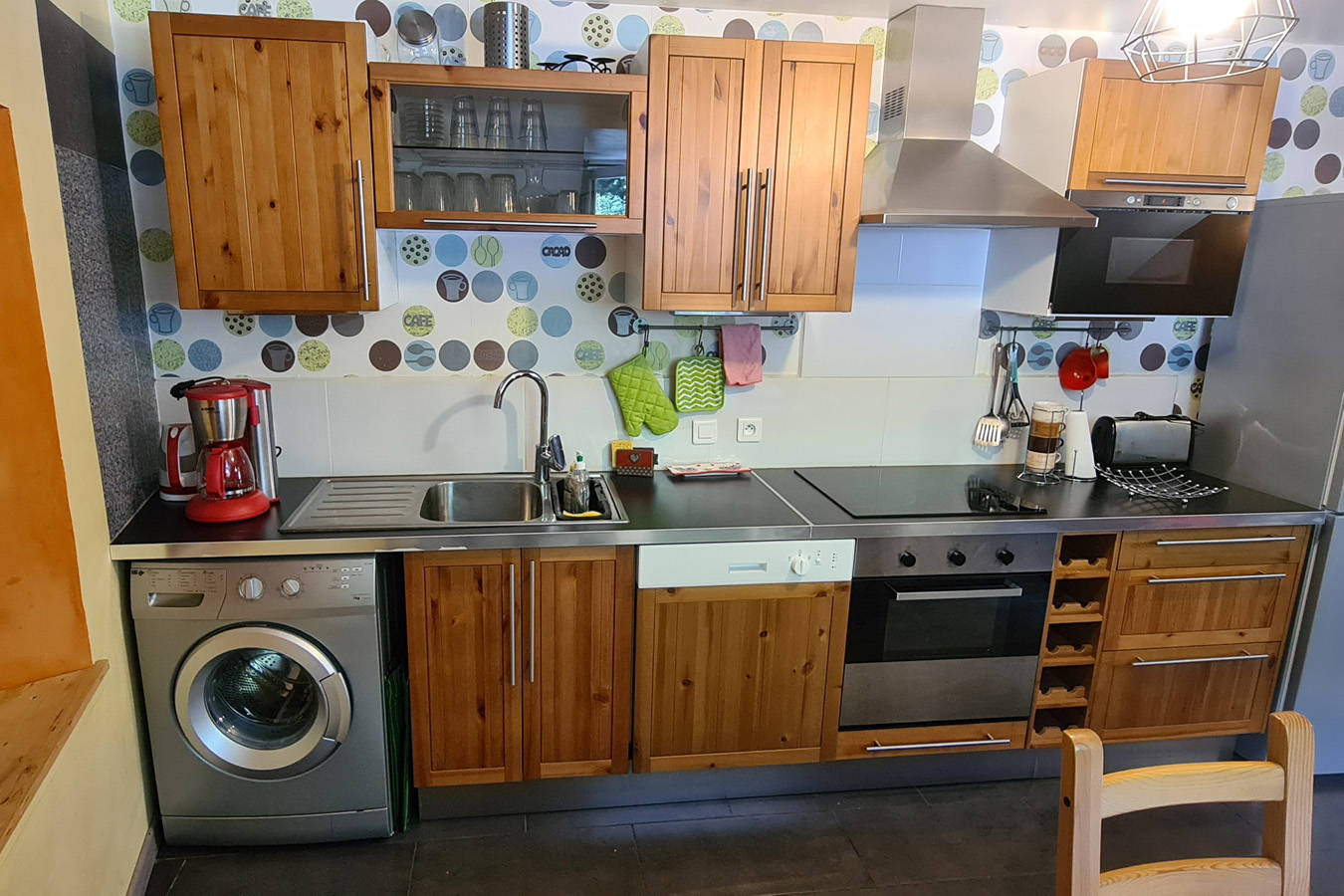 Pièce à vivre avec coin cuisine (lave-vaisselle, plaques à induction, cafetière, bouilloire, grille pain, appareil à raclette, four, micro-ondes, congélateur, réfrigérateur, lave-linge, canapé, fauteuil).