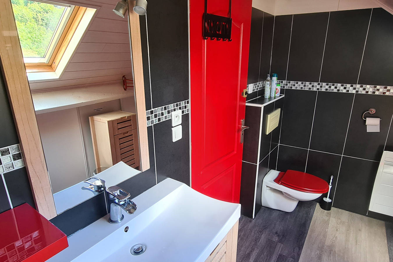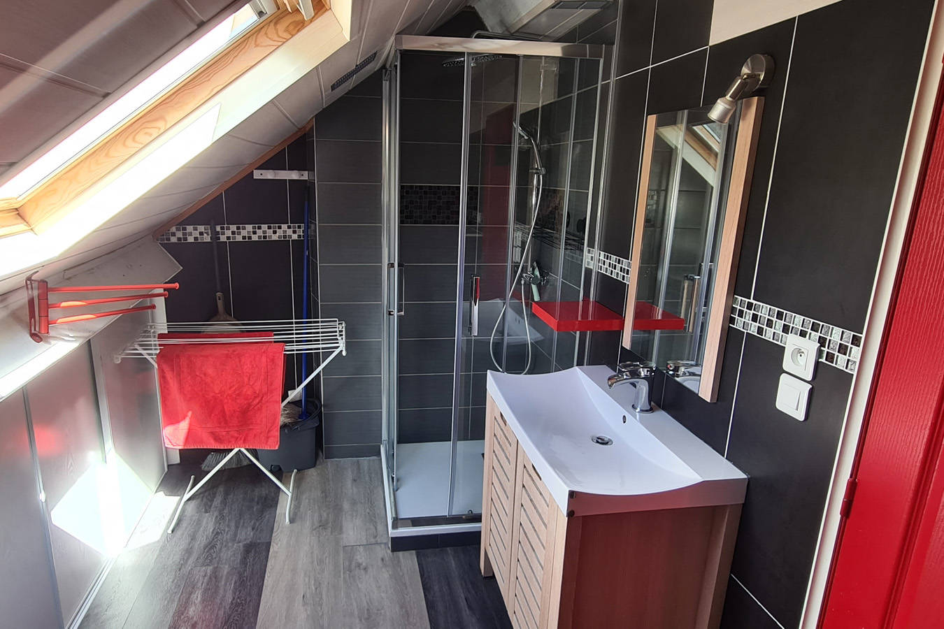 Salle d’eau avec douche, sèche-cheveux, toilettes.