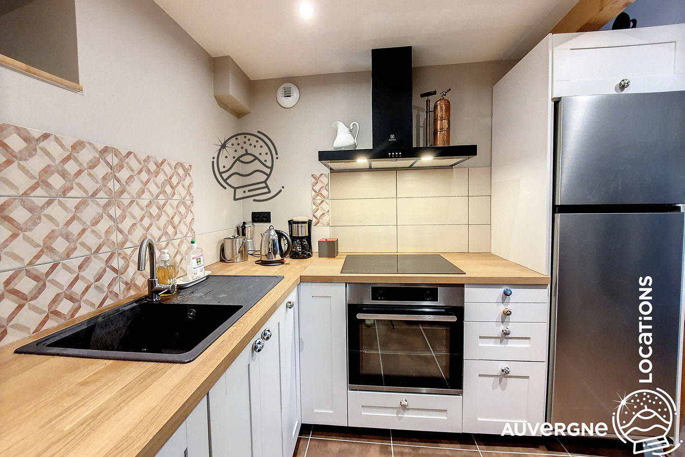 Auvergne Locations vous propose ce gîte disposant d’une grande pièce de vie salon/salle à manger avec son coin cuisine équipée. Attenante, vous trouverez une chambre double avec un lit de 180 cm ainsi qu’une salle de douche.