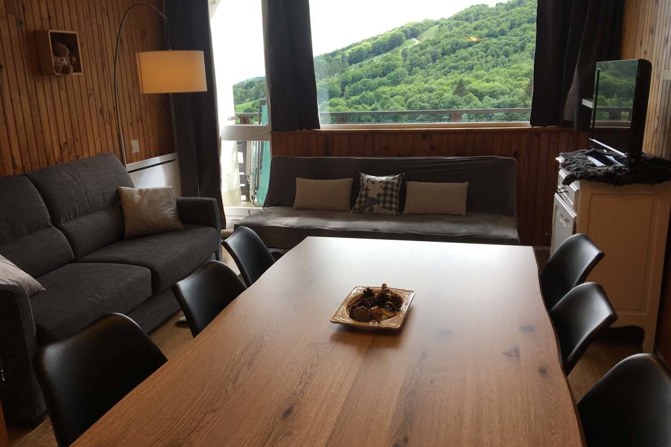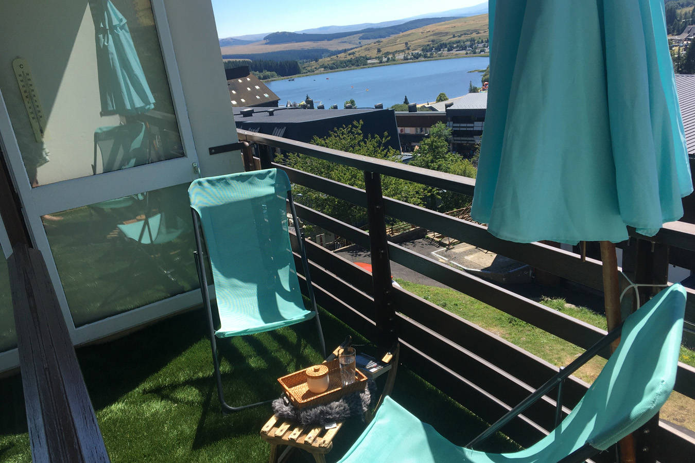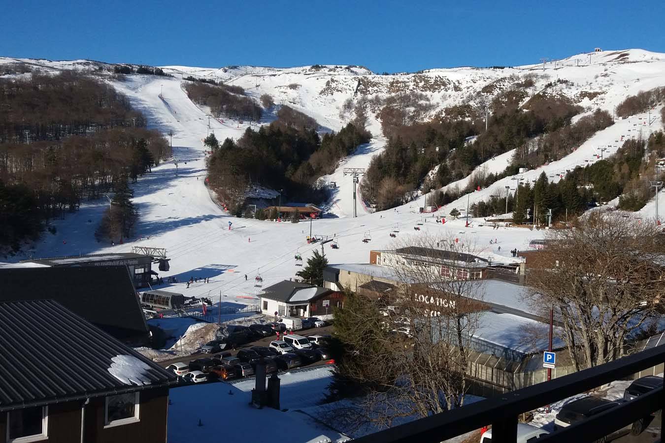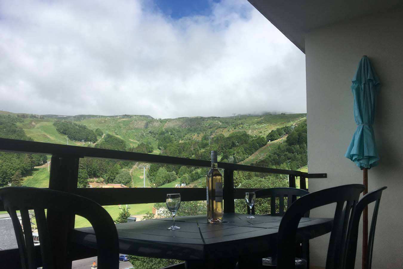 – un balcon avec vue magnifique sur les pistes, le lac des Hermines et les Monts du Cantal, équipé d’un salon de jardin.