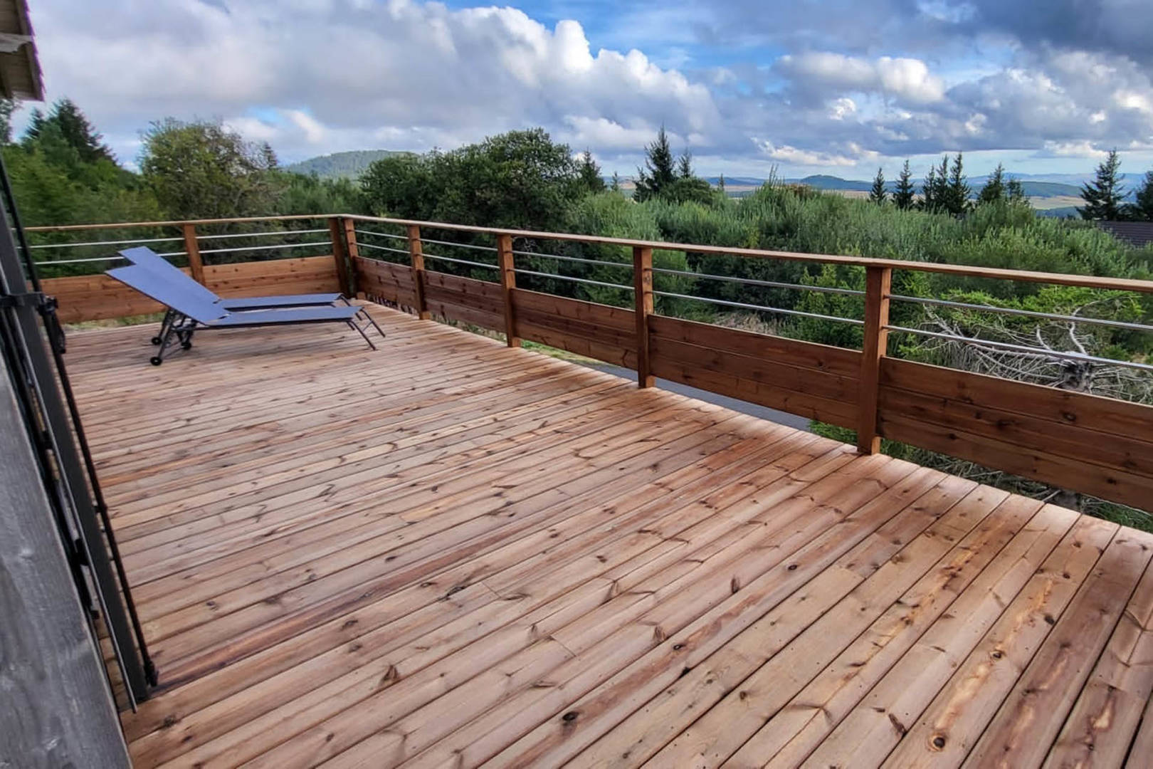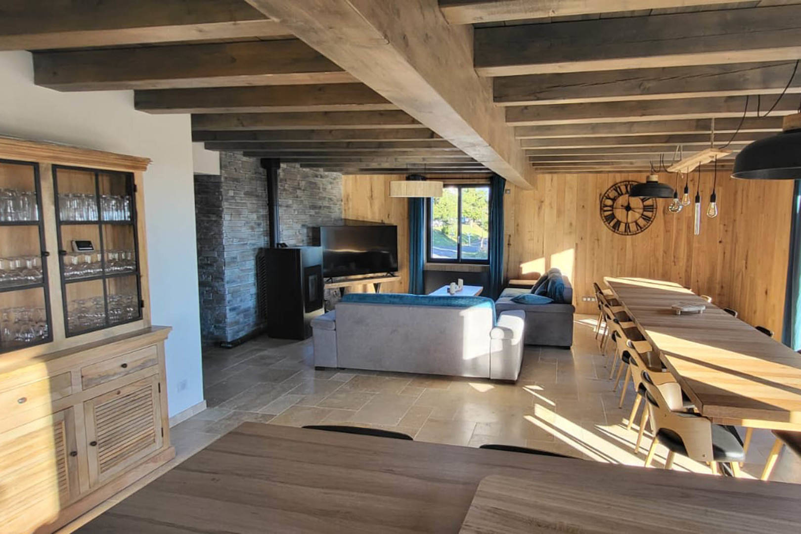 Grand séjour plein sud, écran plat avec 2 canapés et superbe vue sur les monts du Cantal