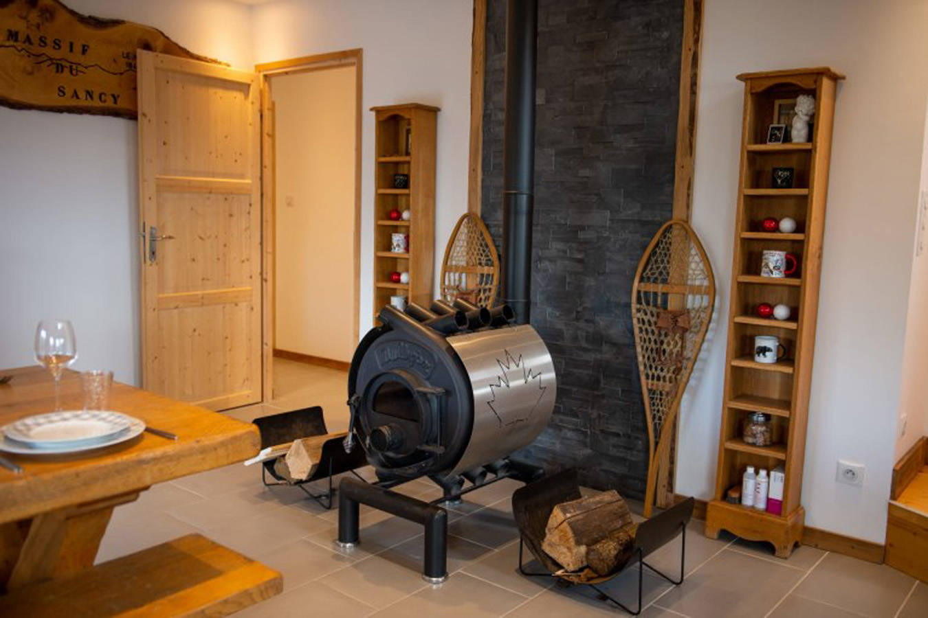 – Salon avec télé satellite et console, avec un grand poêle à buches de bois canadien