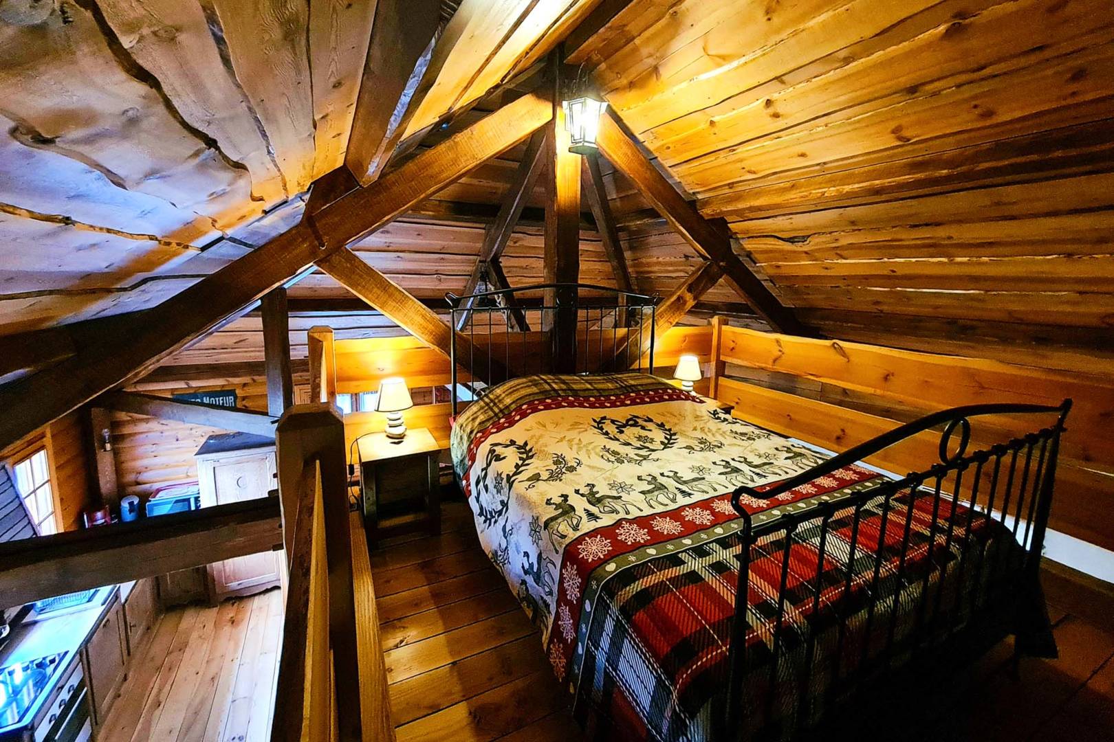 À l’étage, la chambre “Le Chamara”, nichée sous la charpente, invite à des nuits douces et insolites. Vous trouverez également une salle d’eau avec douche, WC séparé et lave-linge pour plus de confort.