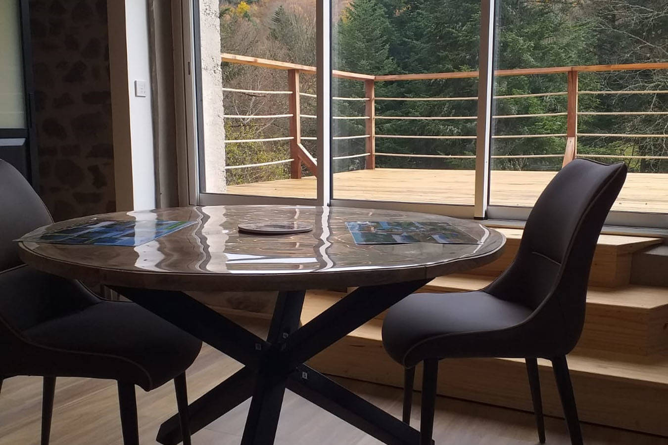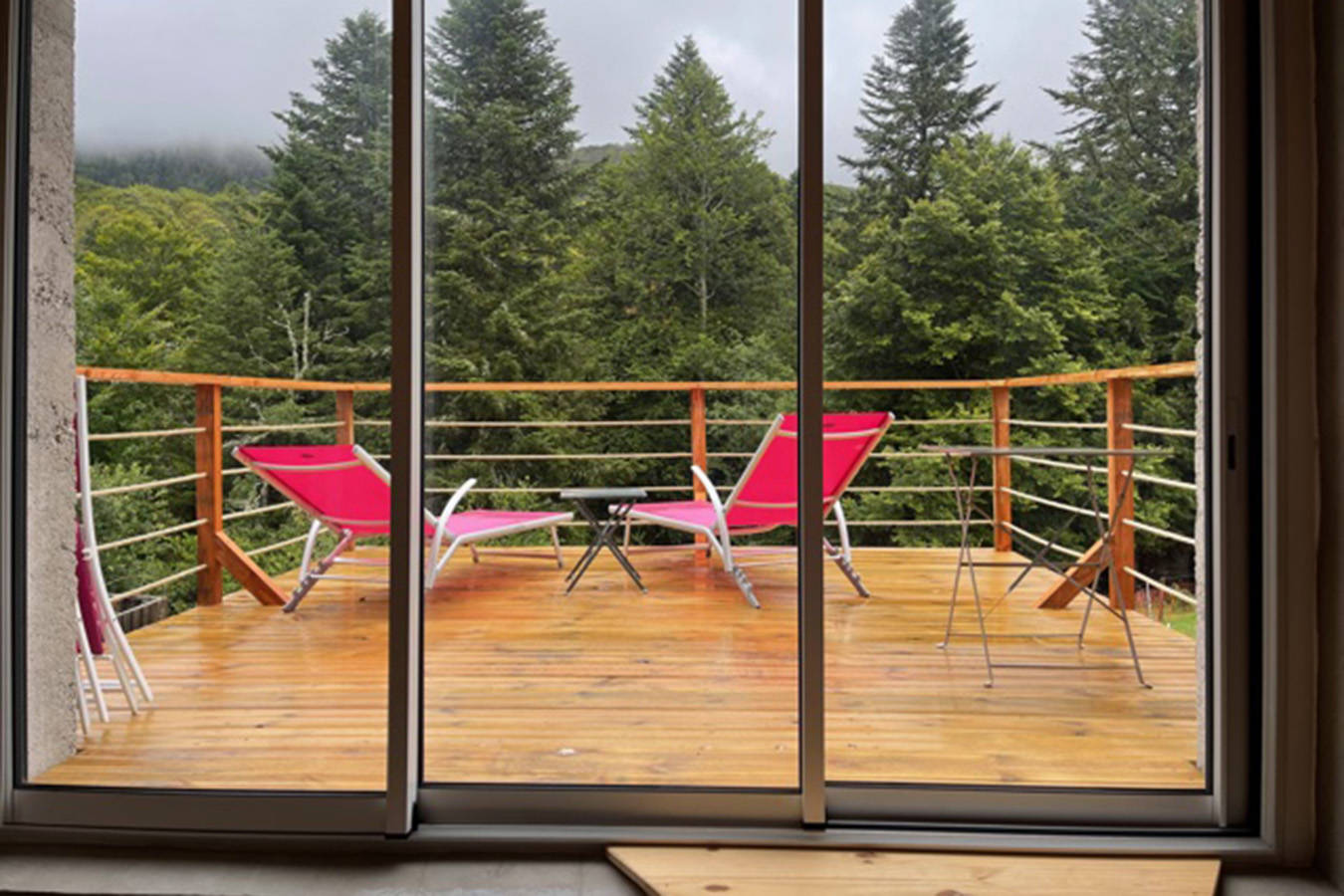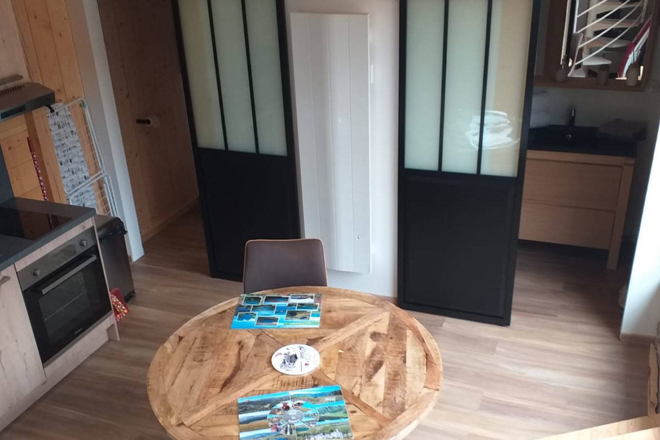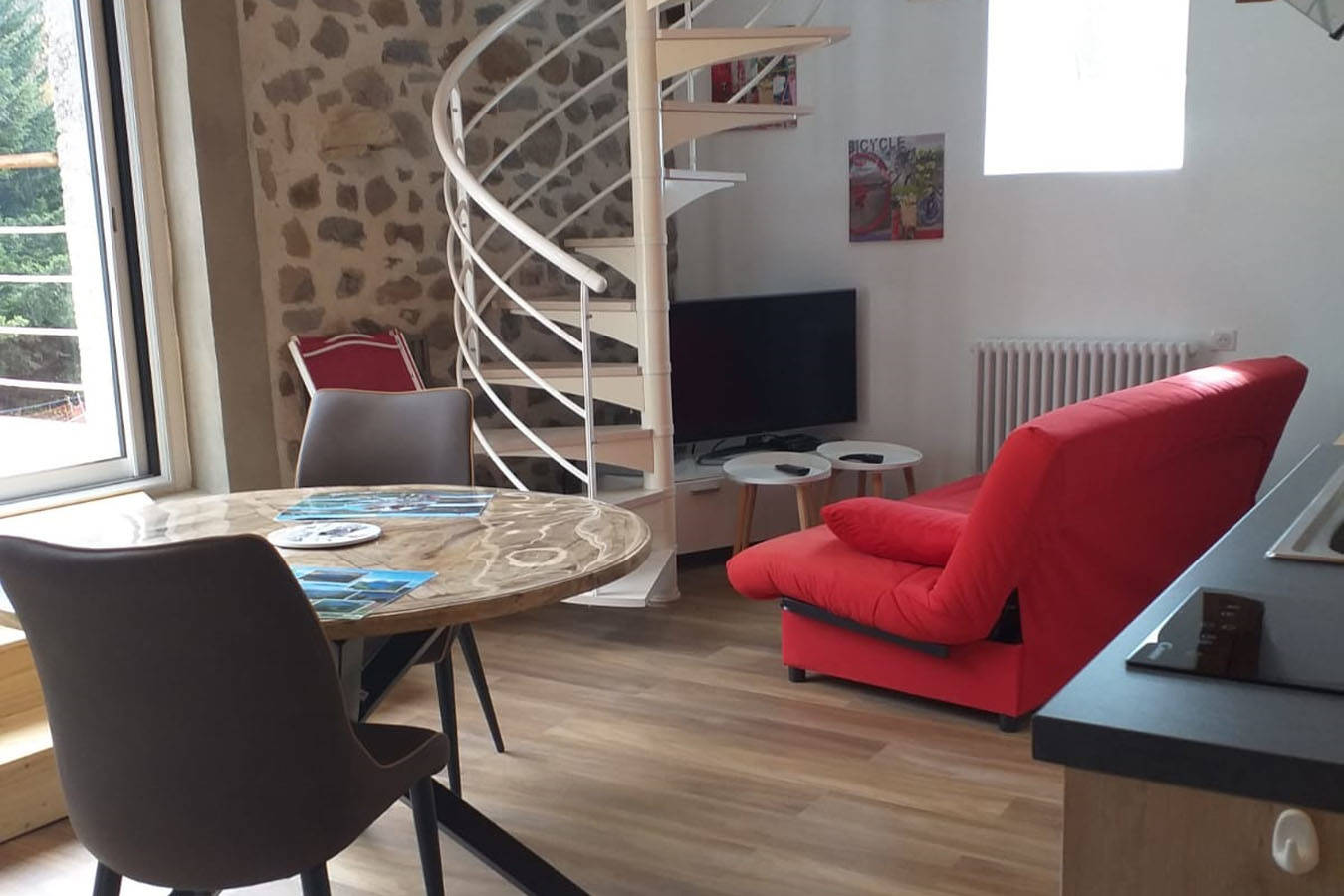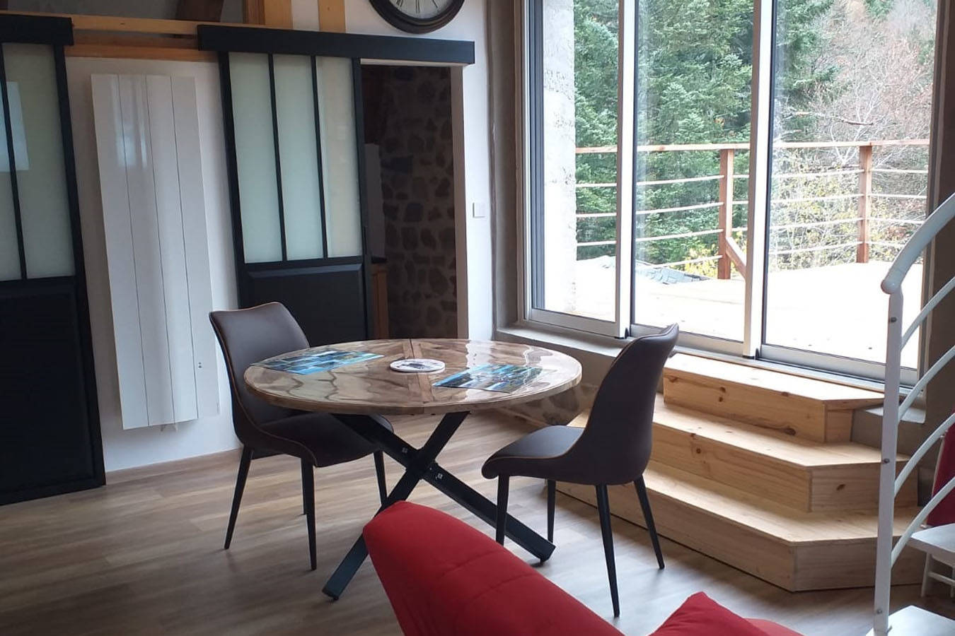 Appartement nature « Le Chevreuil ». Pour 2 personnes, il offre une grande baie vitrée donnant sur une terrasse avec une vue sur le cours d’eau et les sapins. Il est confortable, équipé : – d’une kitchenette avec four, lave-vaisselle, plaque induction, hotte, micro-ondes, réfrigérateur congélateur, cafetière électrique, grille pain, appareil à(…)