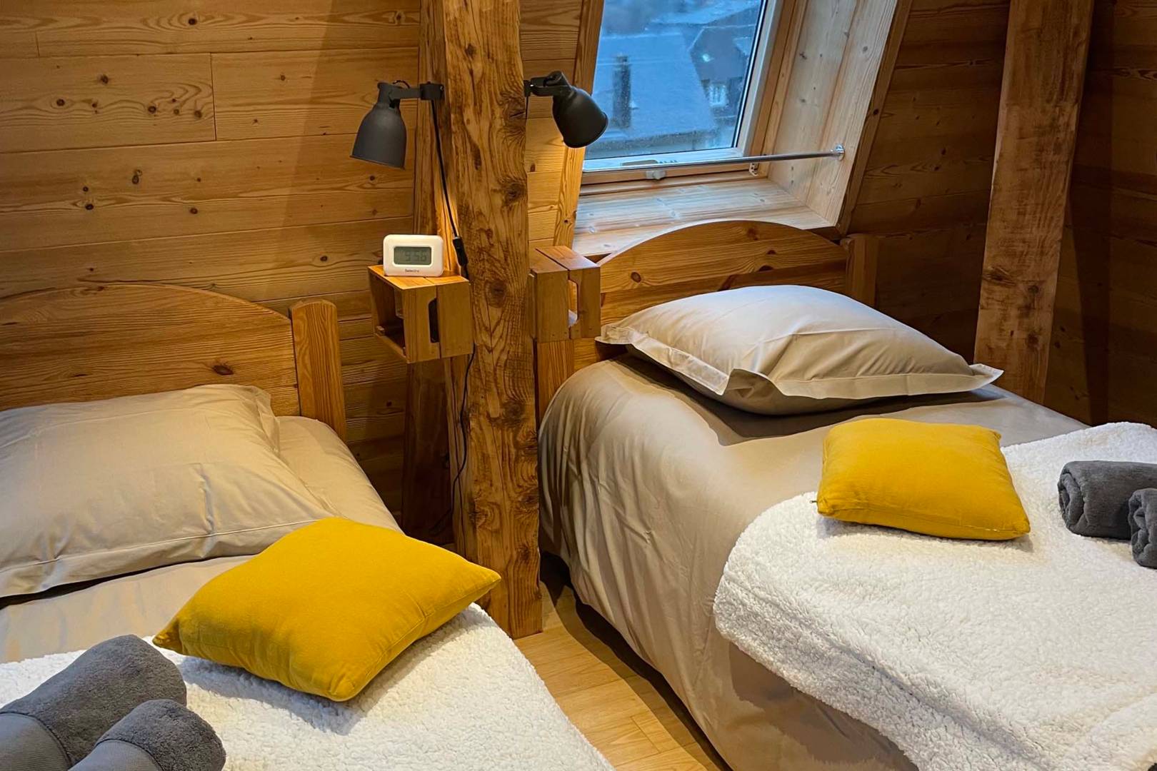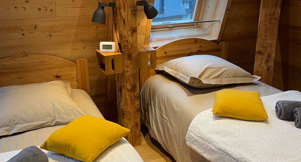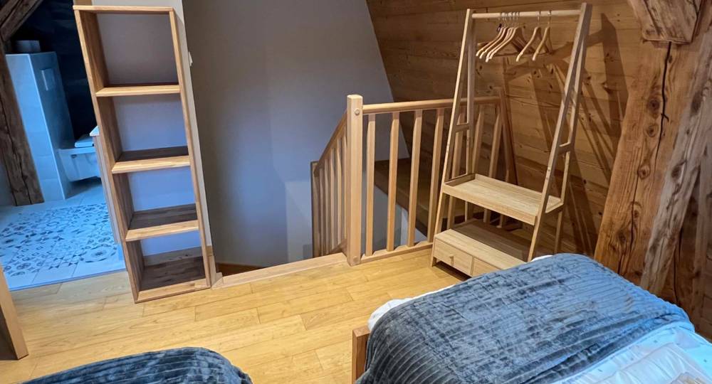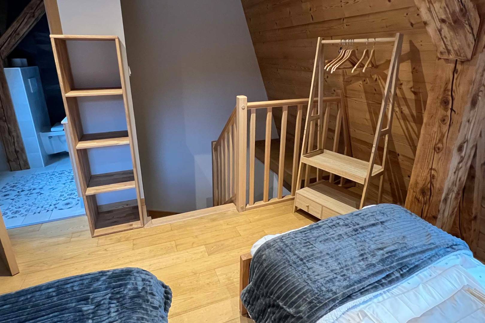 Un espace nuit mezzanine avec deux lits simples de 90 cm et rangements,