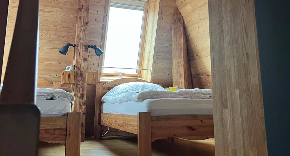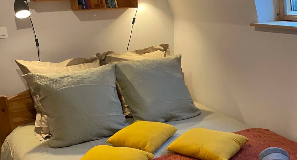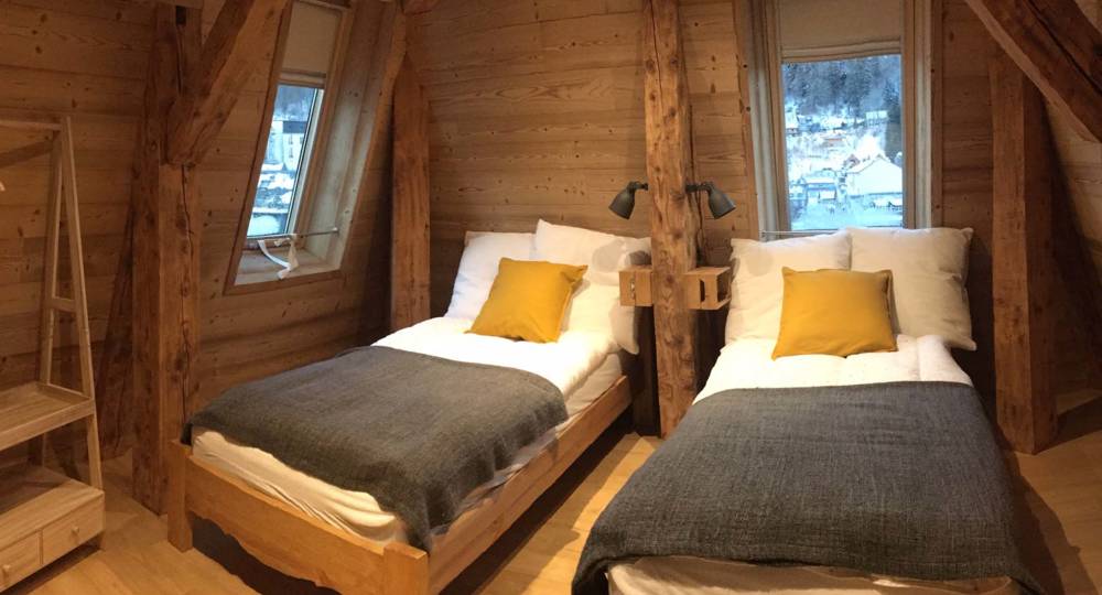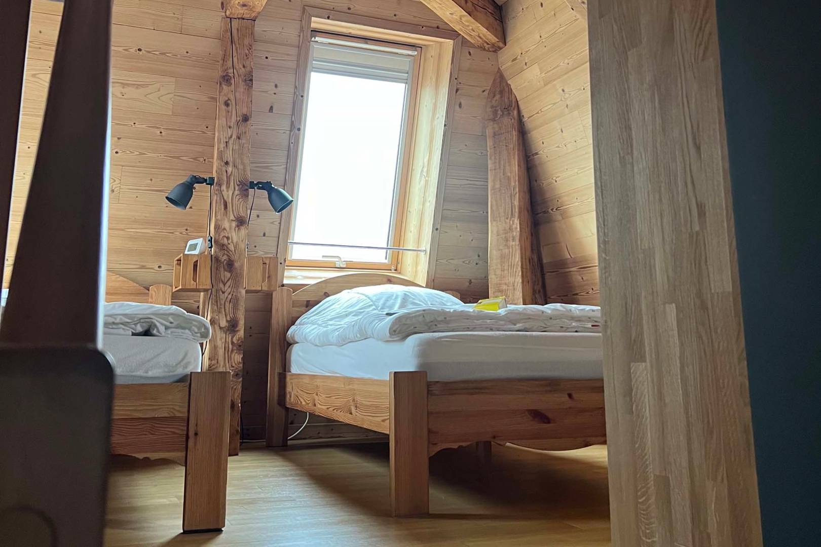 Un espace nuit mezzanine avec deux lits simples de 90 cm et rangements,