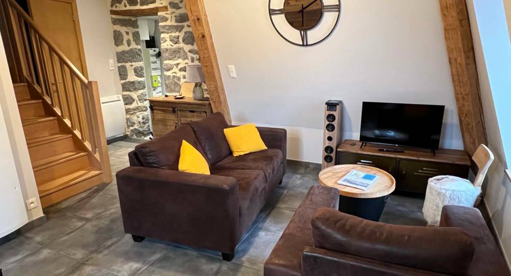 Un espace de vie cosy avec canapé, fauteuil, table basse, TV connectée, « chaine Bluetooth » Wi-Fi et coin repas.
