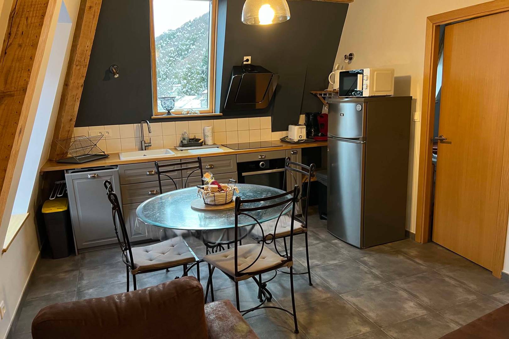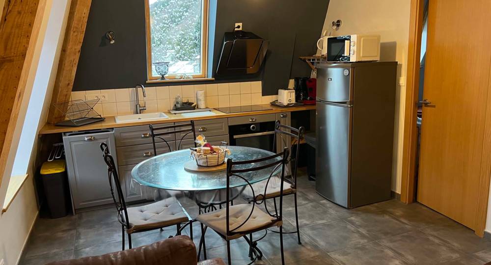 Une cuisine entièrement équipée ouverte sur le séjour (four micro-onde, four, plaques de cuisson à induction, hotte aspirante, réfrigérateur/congélateur, lave-vaisselle, cafetière, cafetière Senseo, bouilloire, grille-pain…).