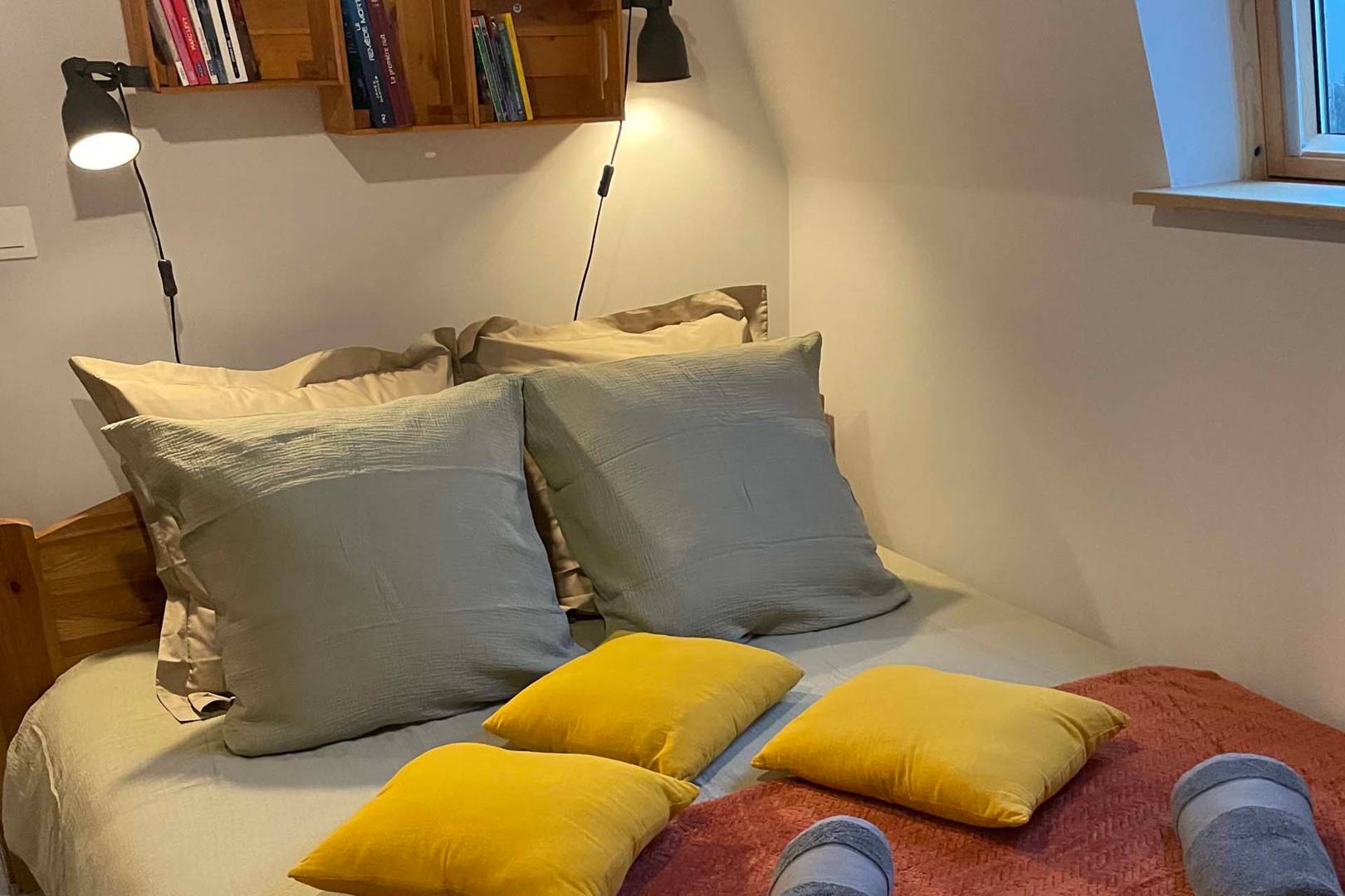 Une chambre avec un lit double de 160 cm, dressing et salle d’eau privative avec douche.