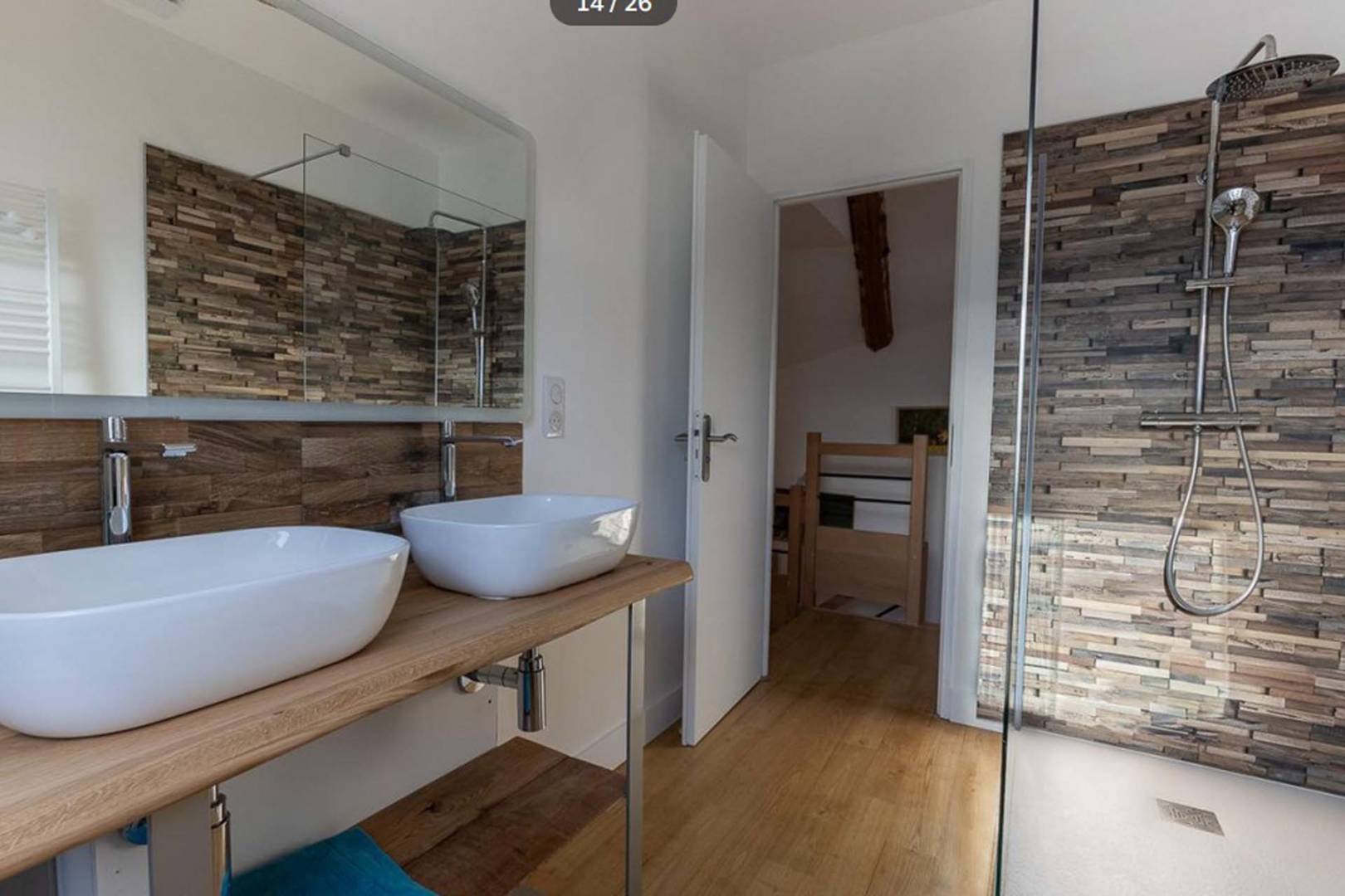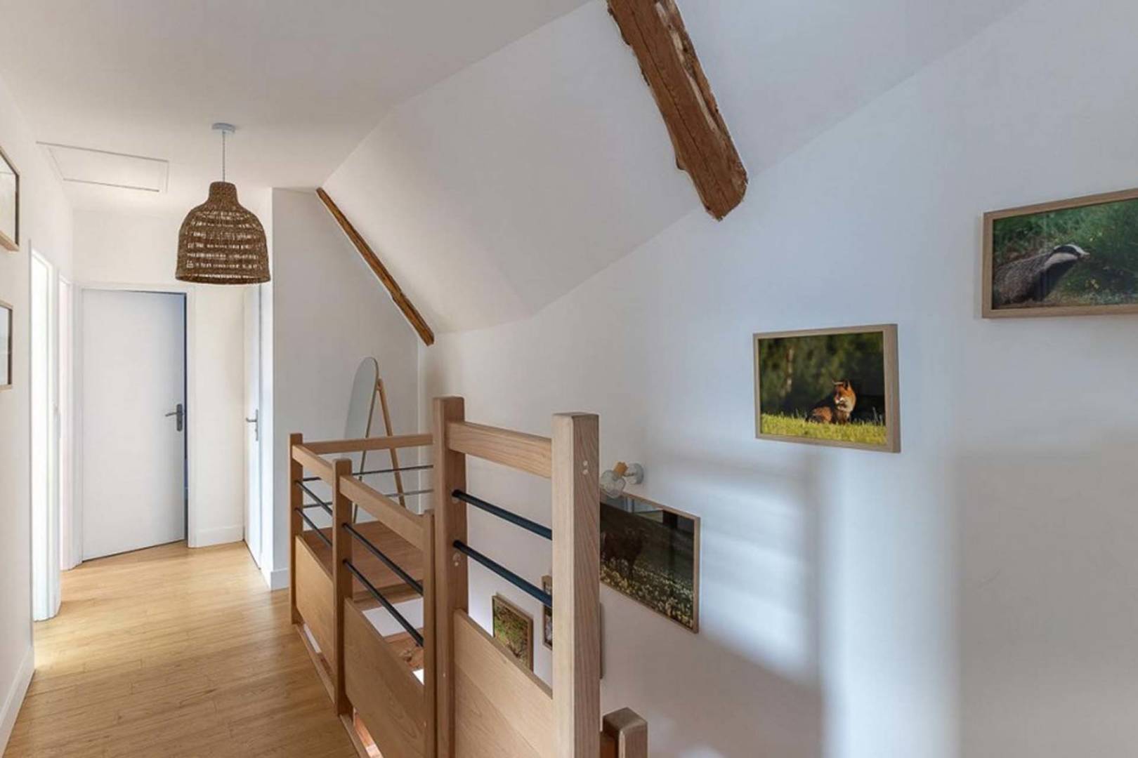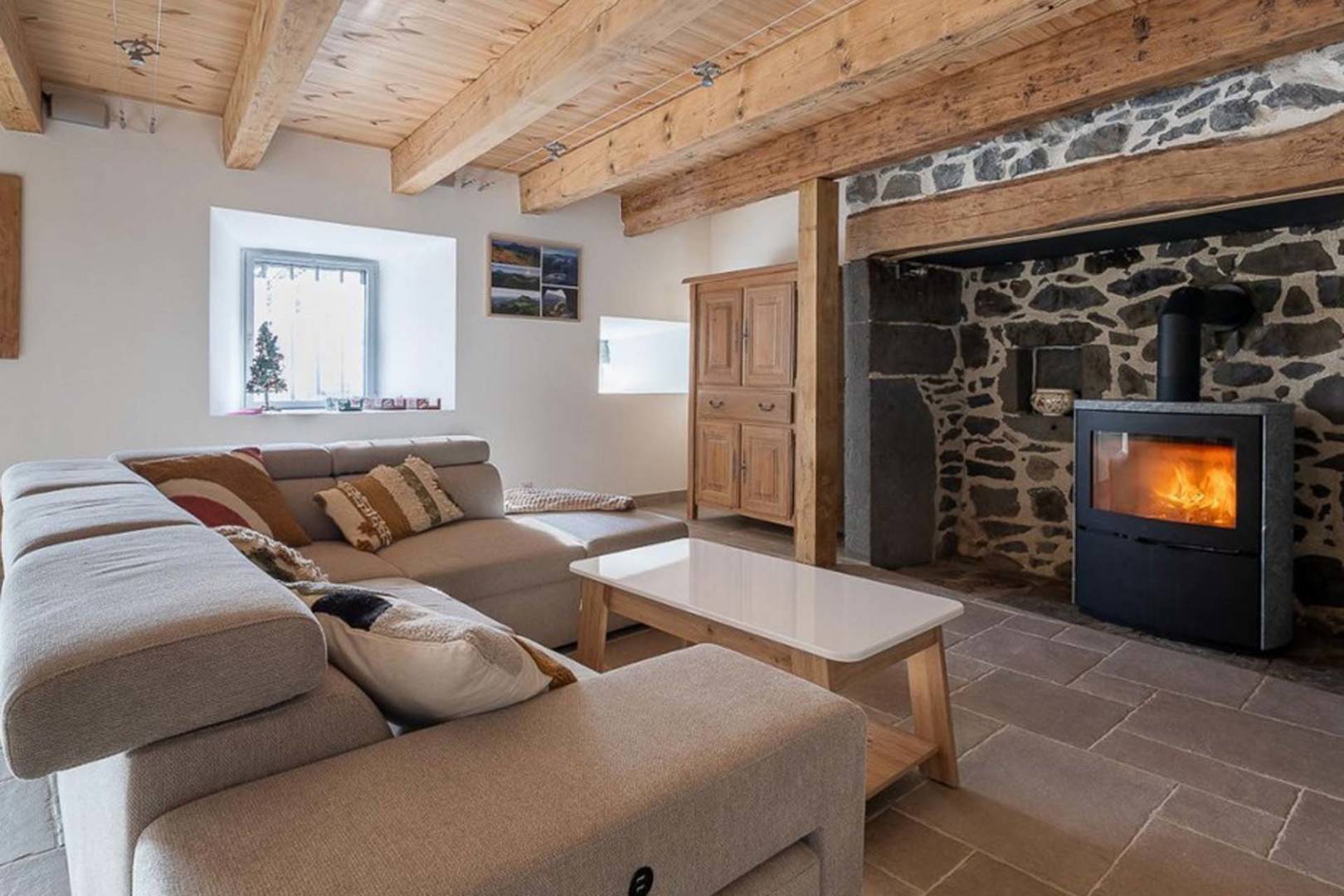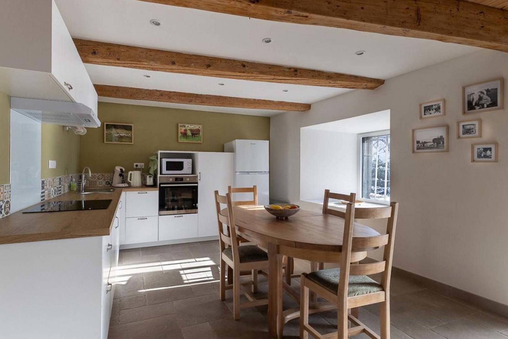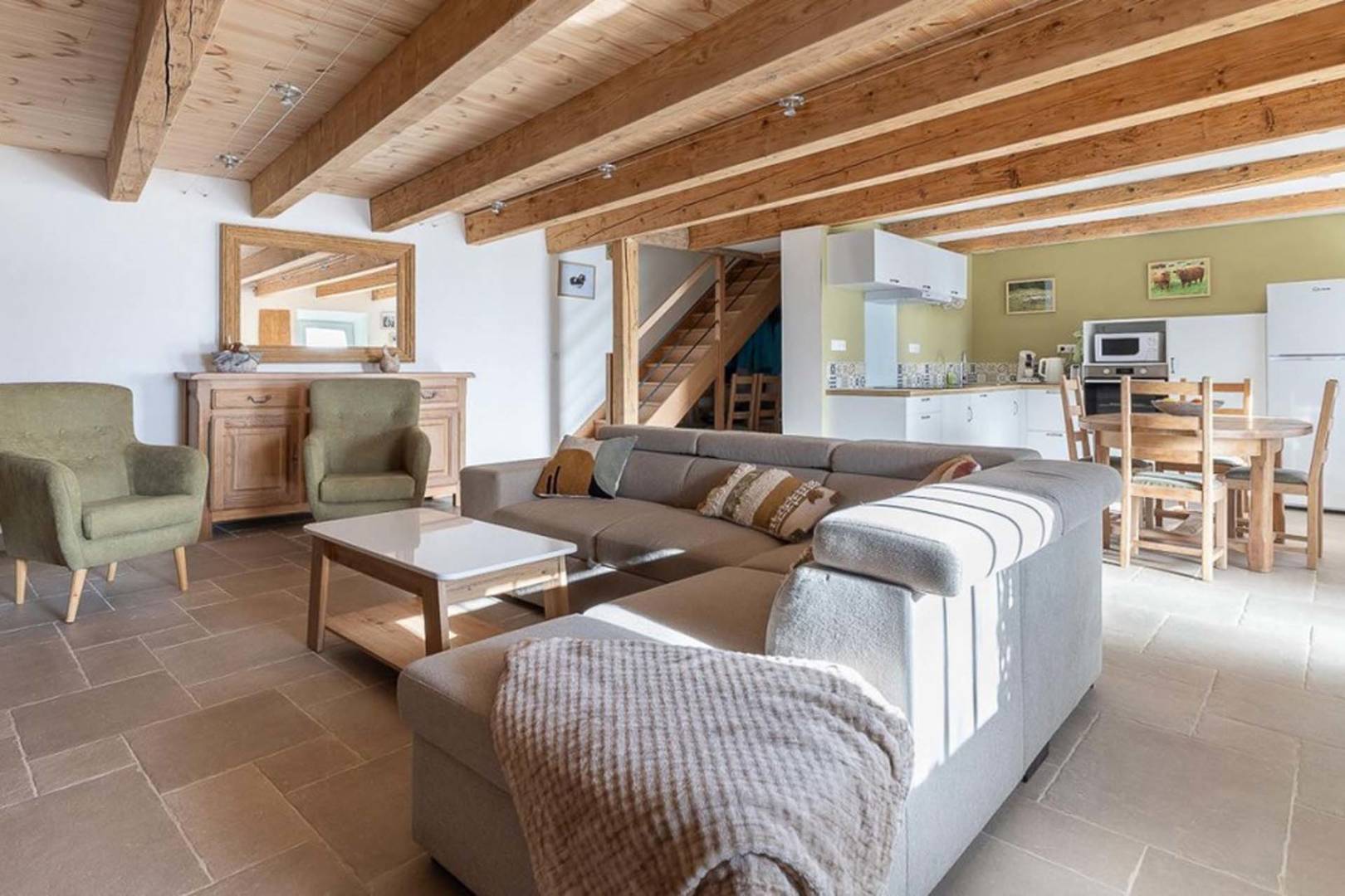 Le vaste salon avec sa cheminée en pierre et ses poutres apparentes invite à la convivialité, tandis que la cuisine entièrement équipée et la salle à manger offrent un espace idéal pour partager des repas chaleureux.