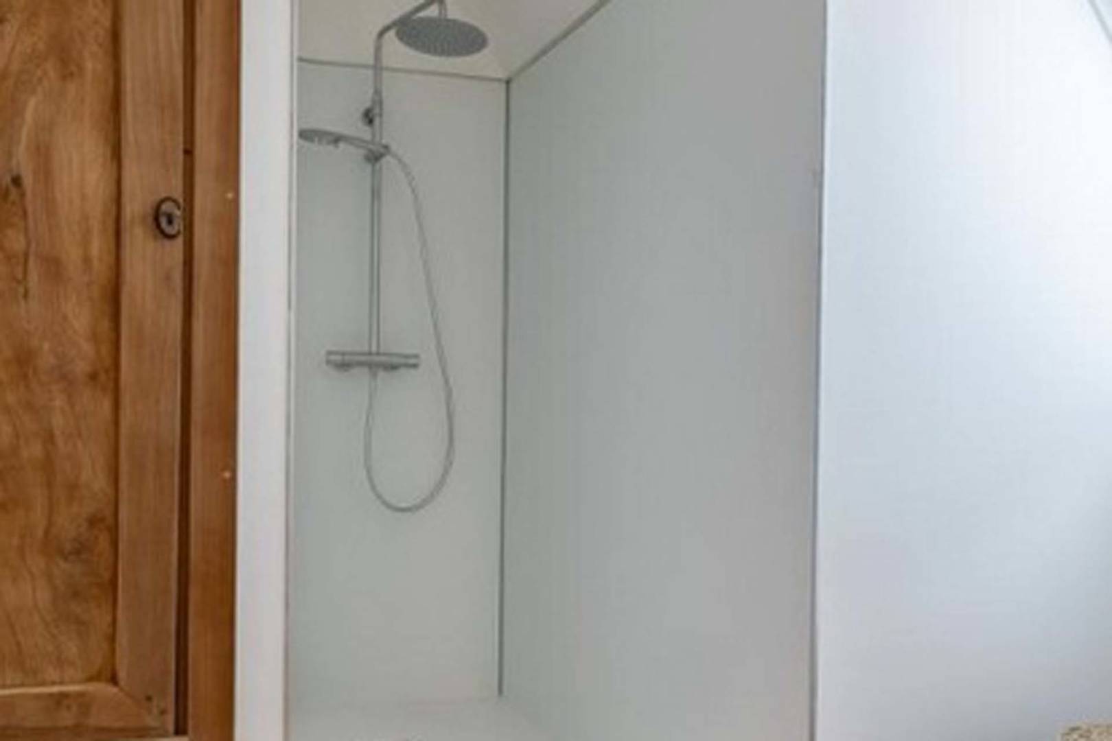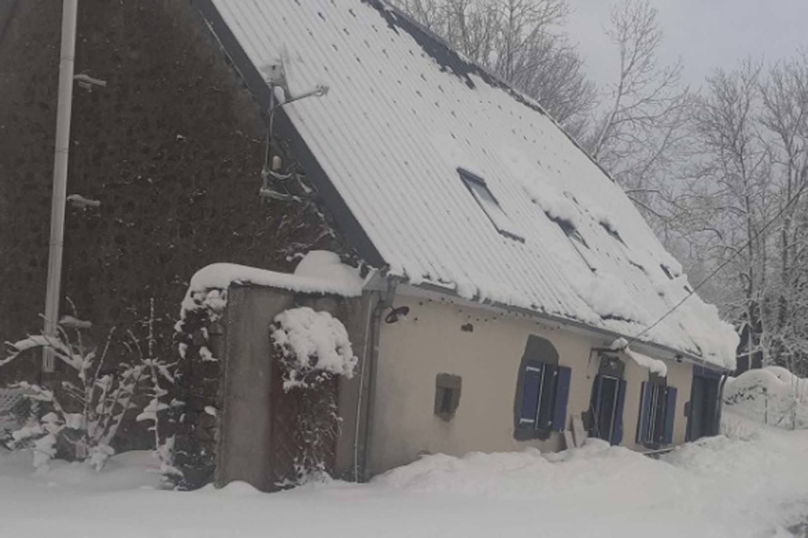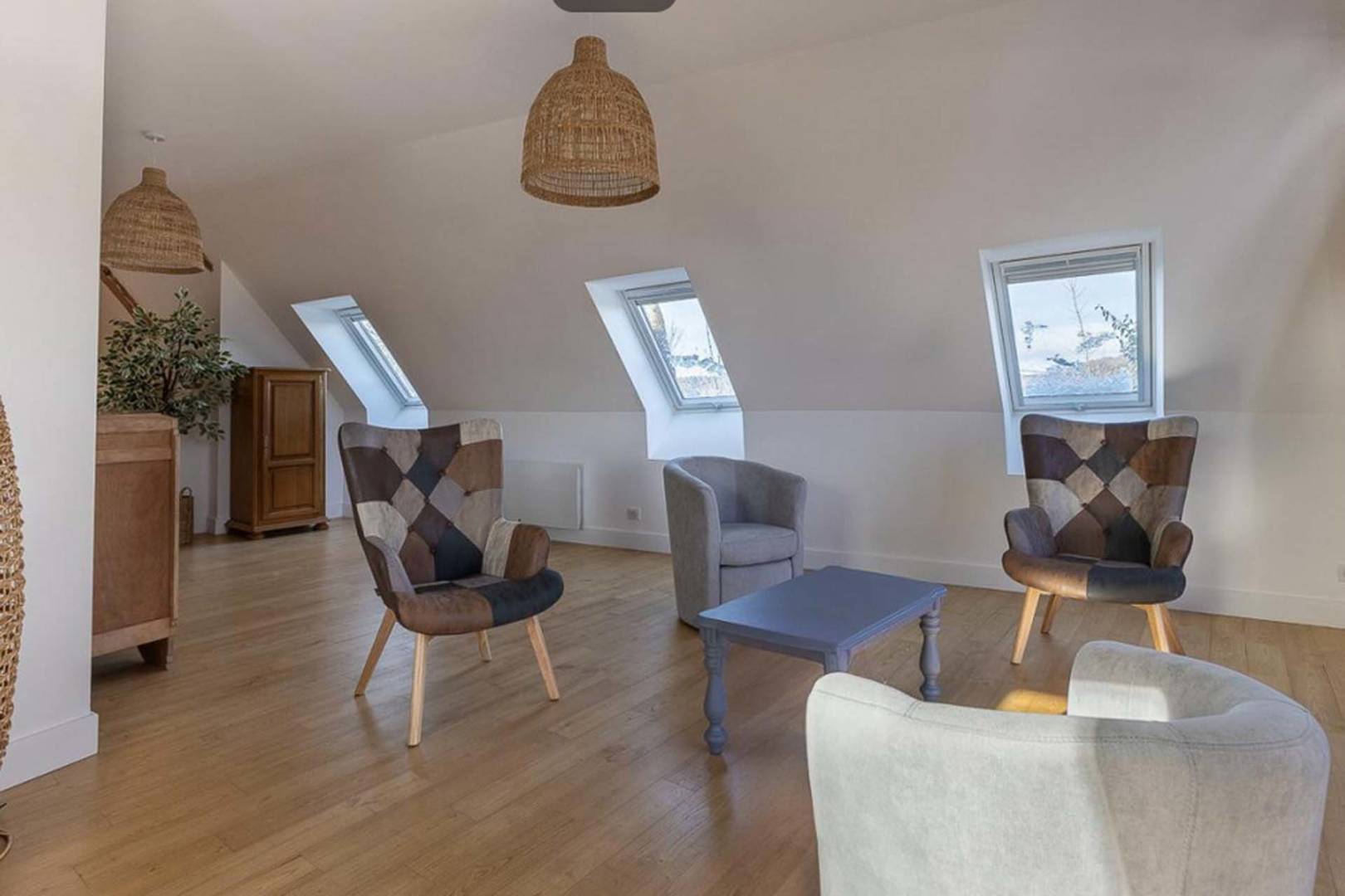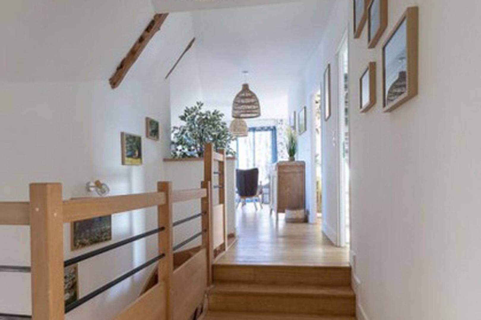 Le vaste salon avec sa cheminée en pierre et ses poutres apparentes invite à la convivialité, tandis que la cuisine entièrement équipée et la salle à manger offrent un espace idéal pour partager des repas chaleureux.