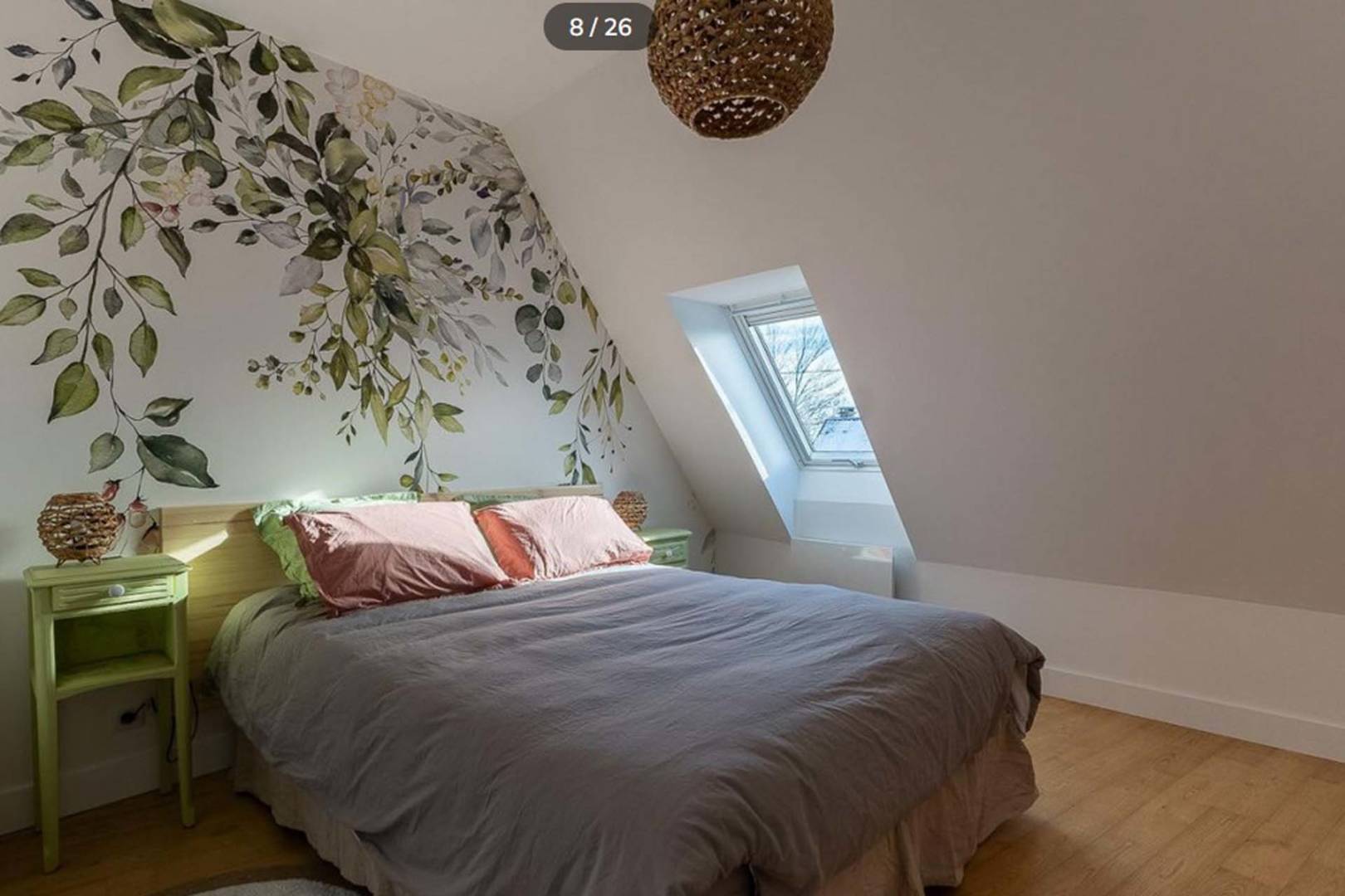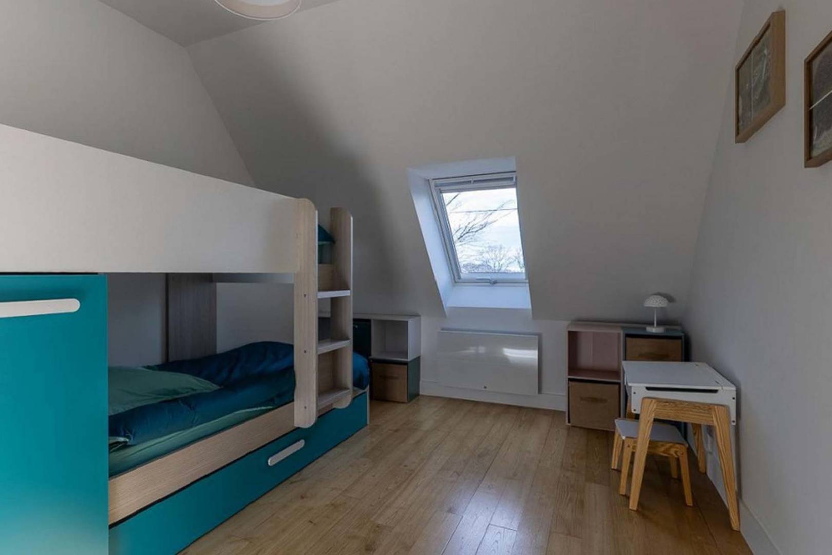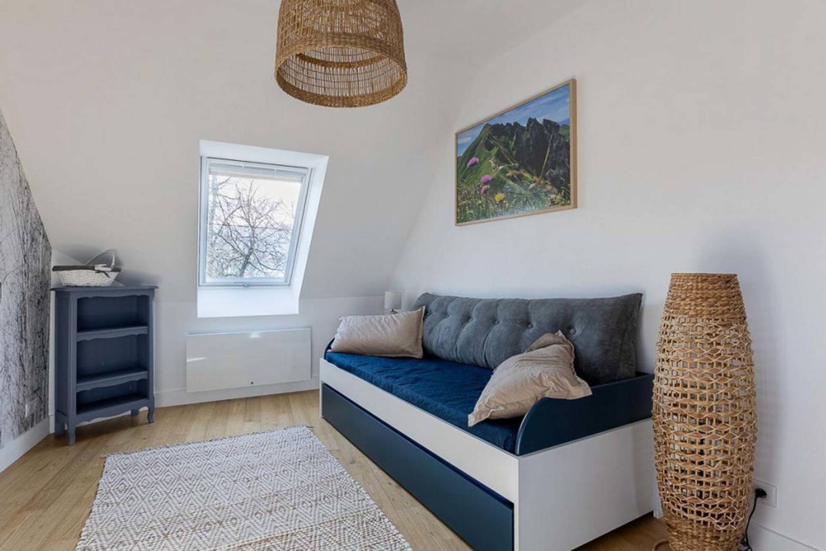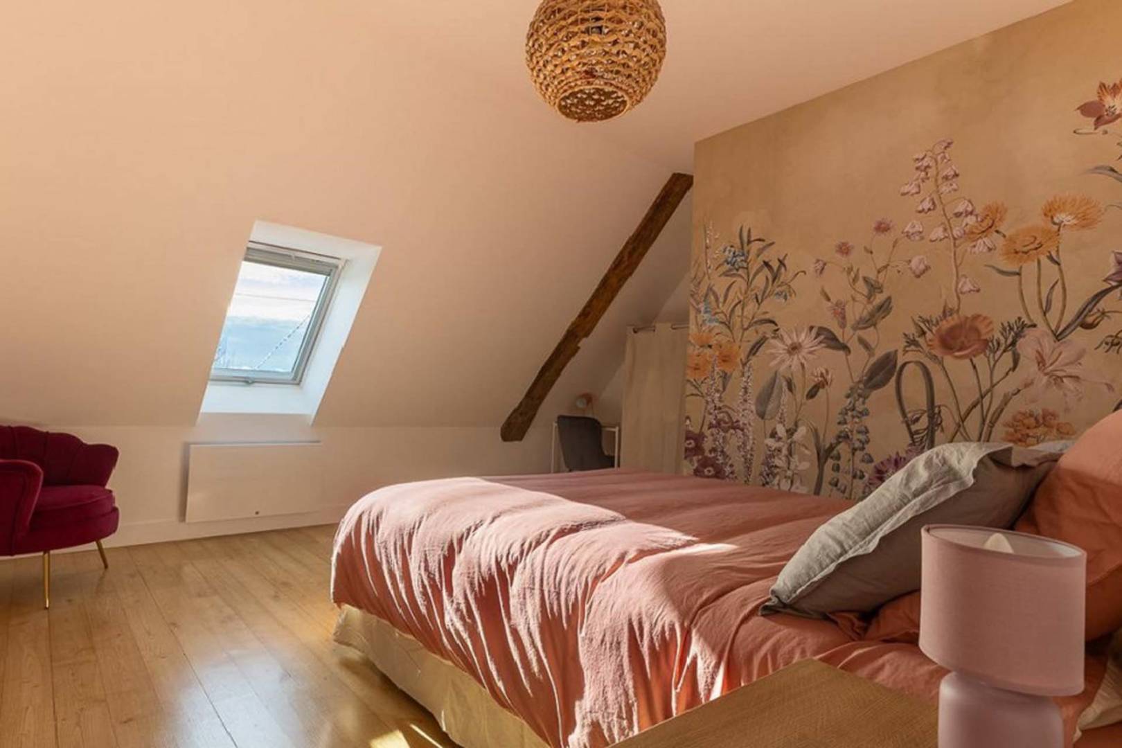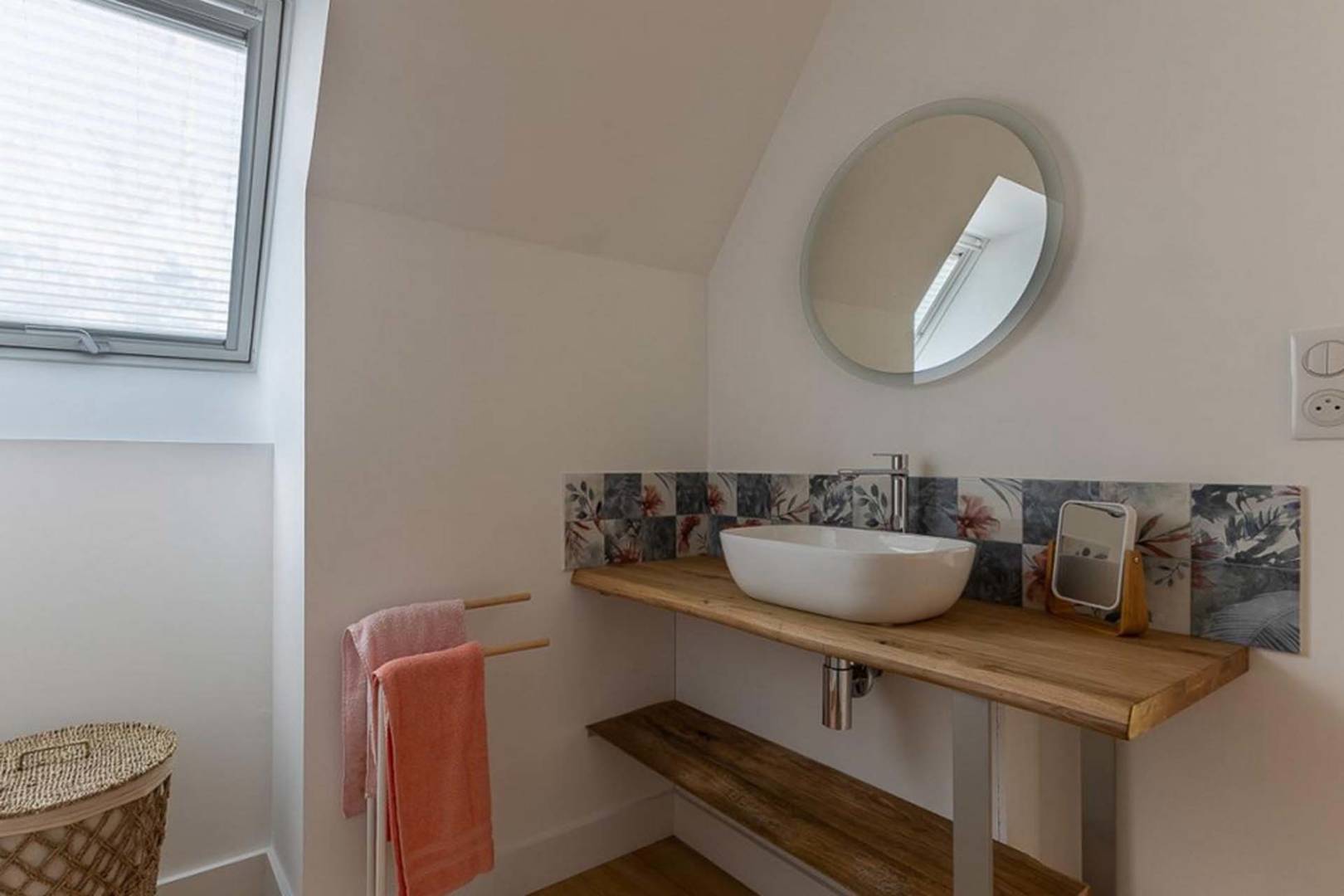 Le vaste salon avec sa cheminée en pierre et ses poutres apparentes invite à la convivialité, tandis que la cuisine entièrement équipée et la salle à manger offrent un espace idéal pour partager des repas chaleureux.
