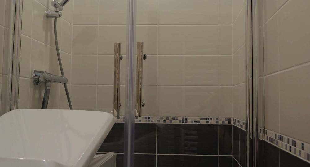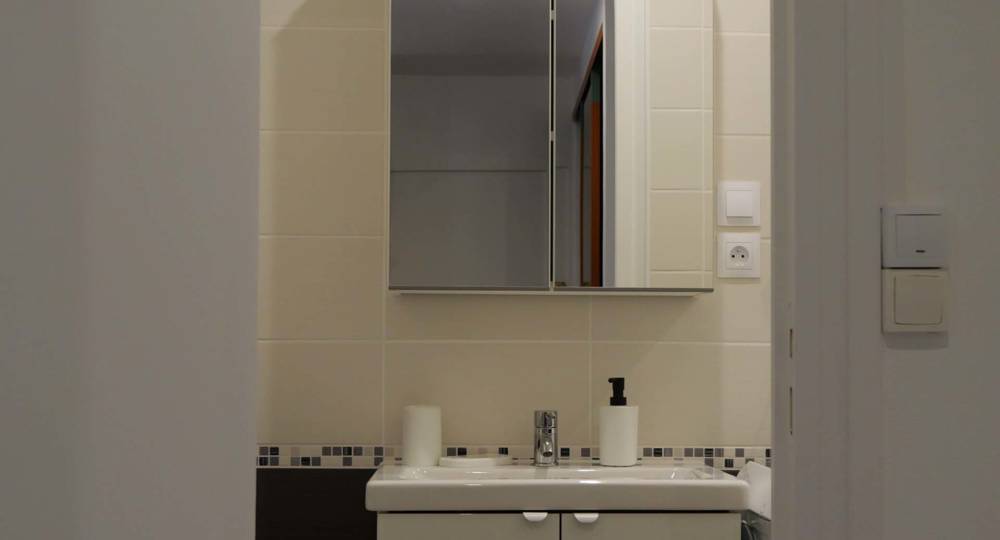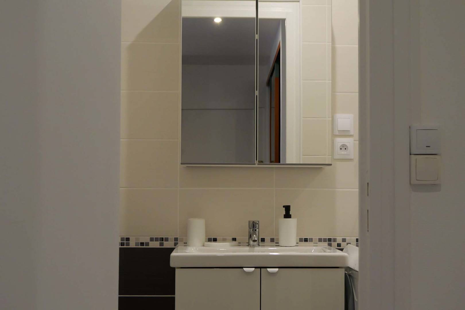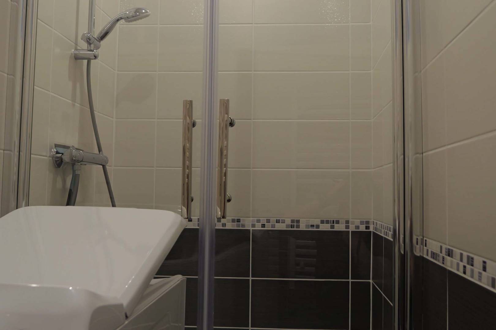 Salle de bain avec lavabo, lave-linge et grande douche de 100×80.