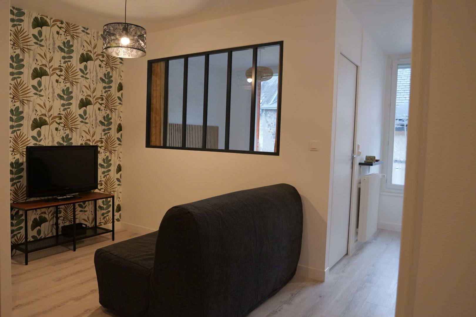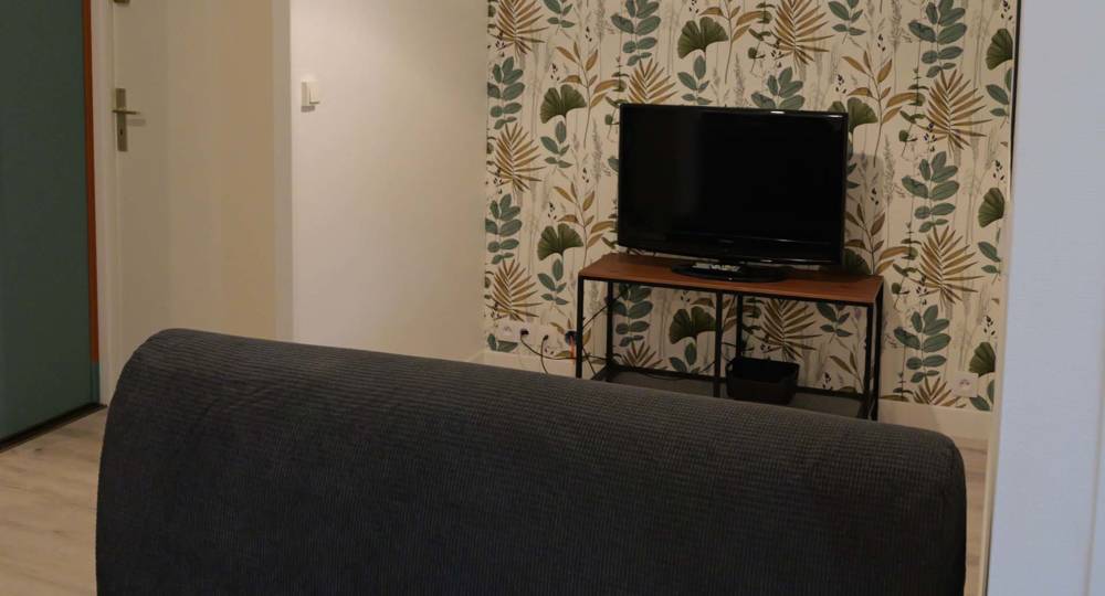 Salon avec canapé convertible BZ grand confort et grand téléviseur.