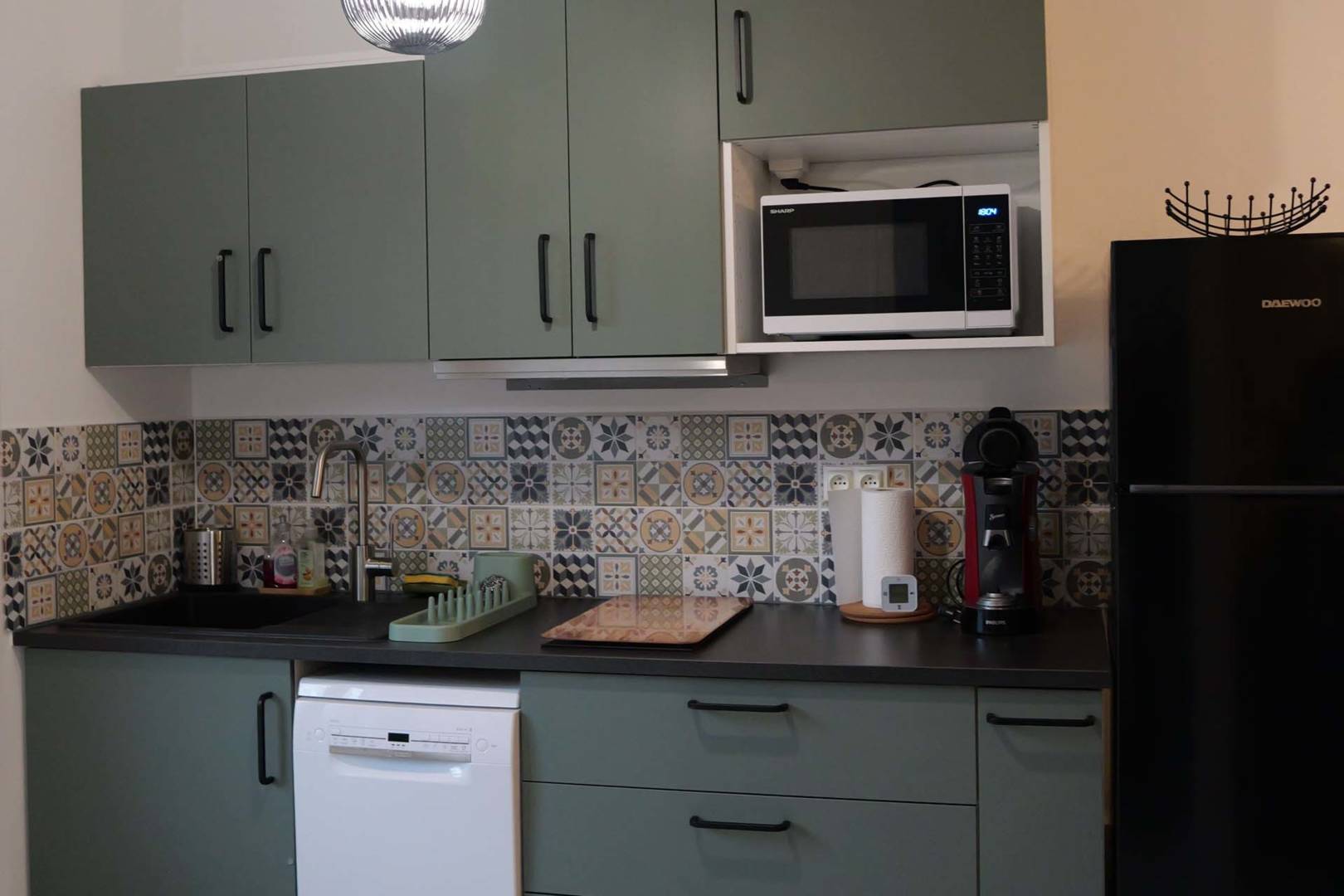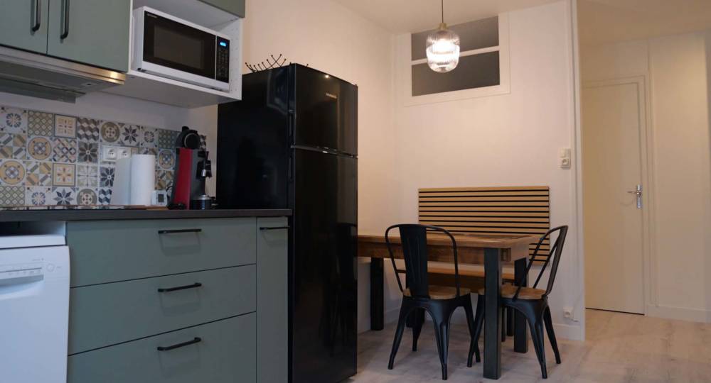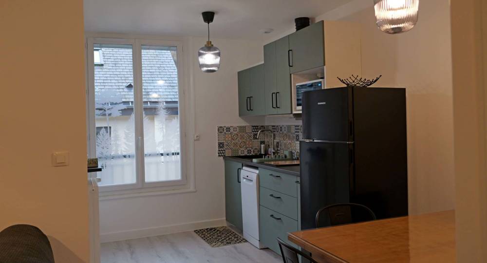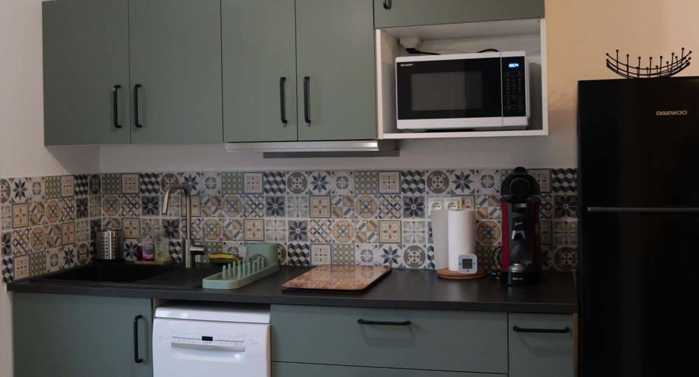 Cuisine tout équipée avec micro-ondes, lave vaisselle, table de cuisson induction et frigidaire mixte congélateur.