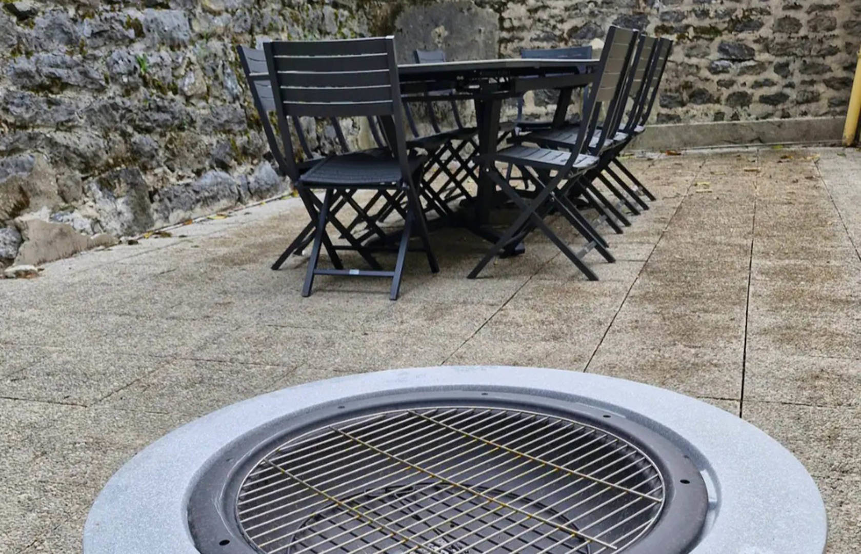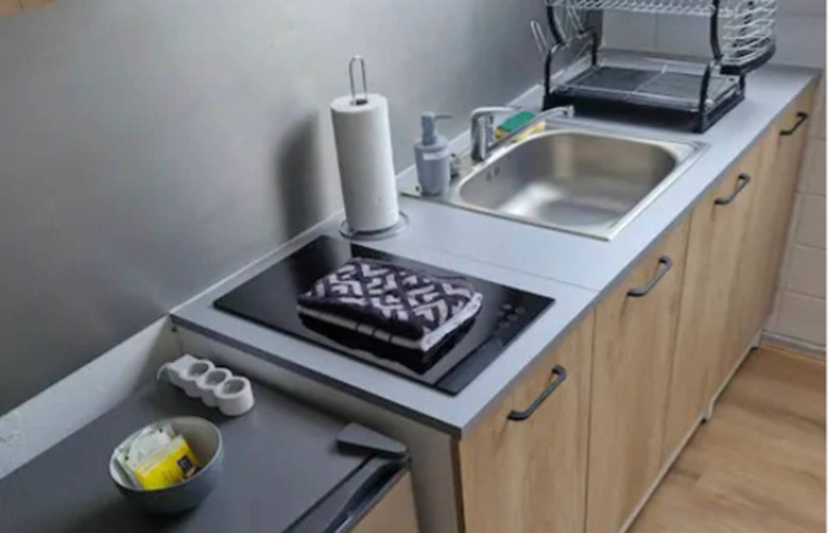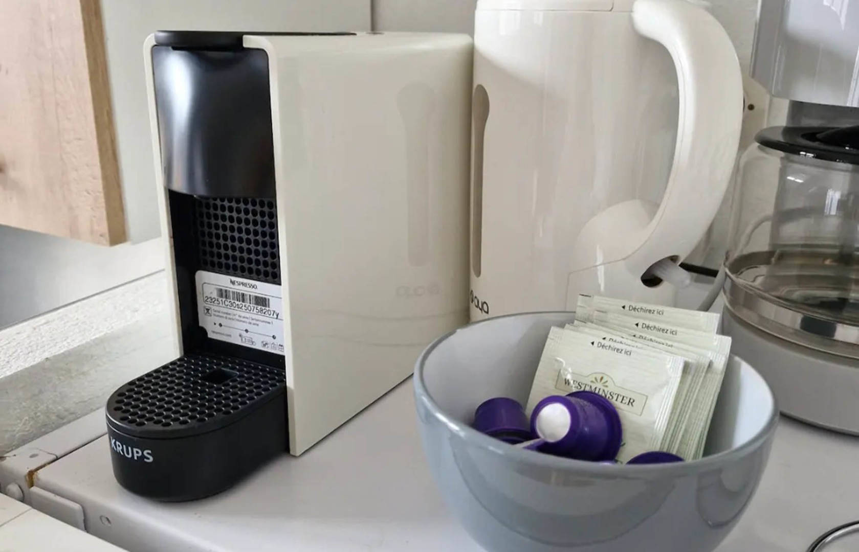 Une pièce à vivre avec cuisine équipée (micro-ondes / cafetière / bouilloire / grille-pain / appareil à raclette) et une table à manger,(…)