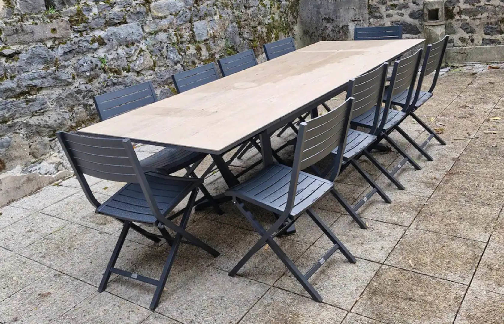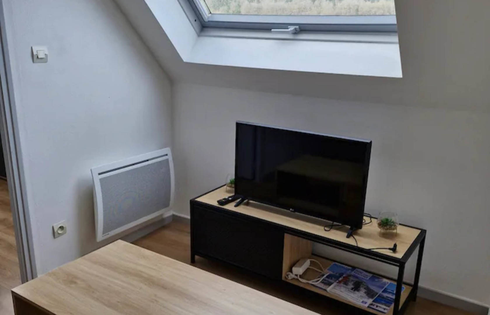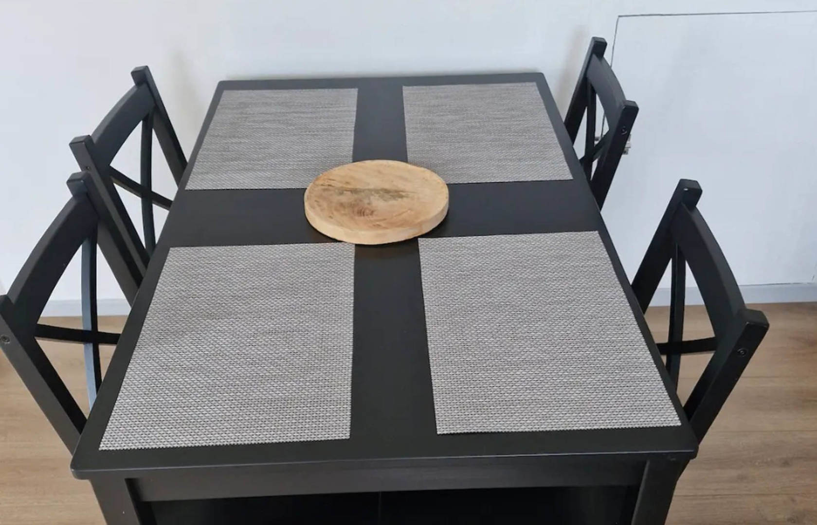 Une pièce à vivre avec cuisine équipée (micro-ondes / cafetière / bouilloire / grille-pain / appareil à raclette) et une table à manger,(…)
