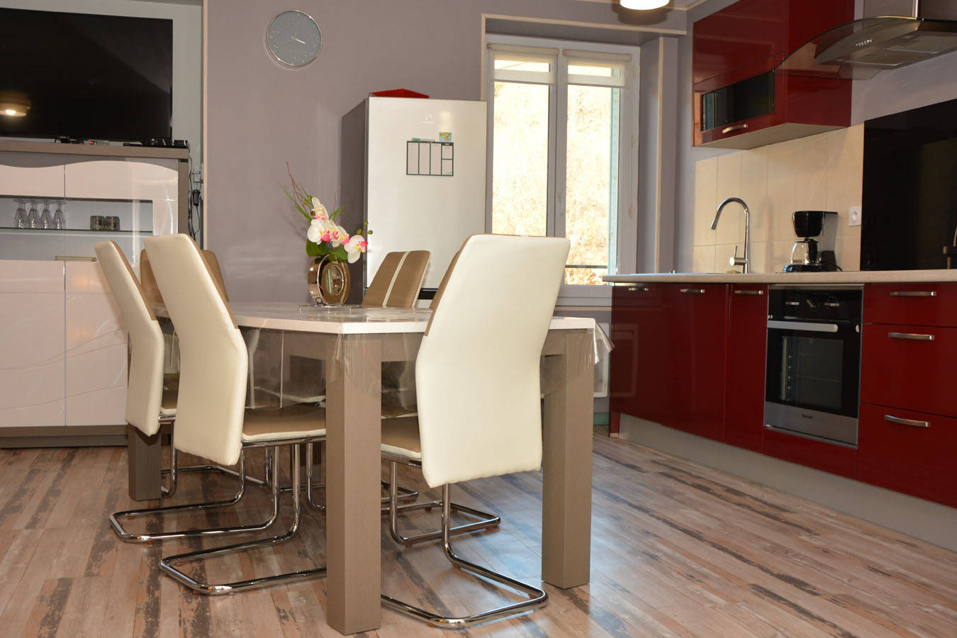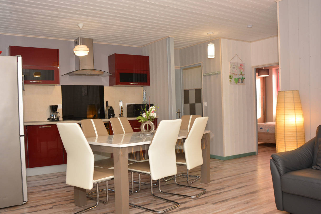 La grande pièce de vie se compose d’une cuisine équipée (réfrigérateur, congélateur, lave-vaisselle, four, cafetière, bouilloire, grille-pain, service à raclette).