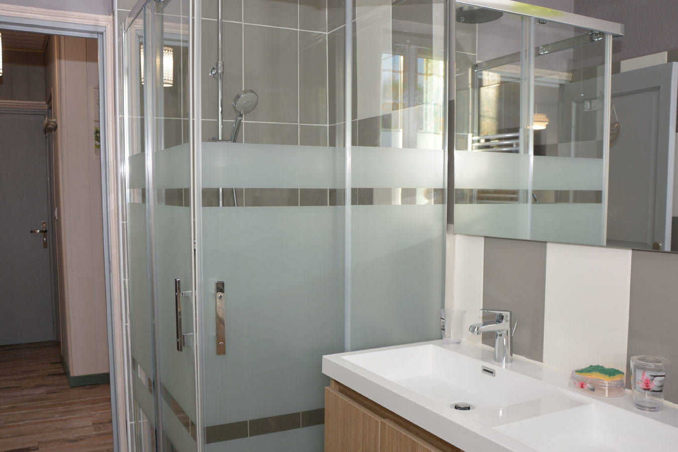 La salle d’eau dispose de 2 vasques et d’une douche (avec sèche-cheveux). Le WC est séparé.