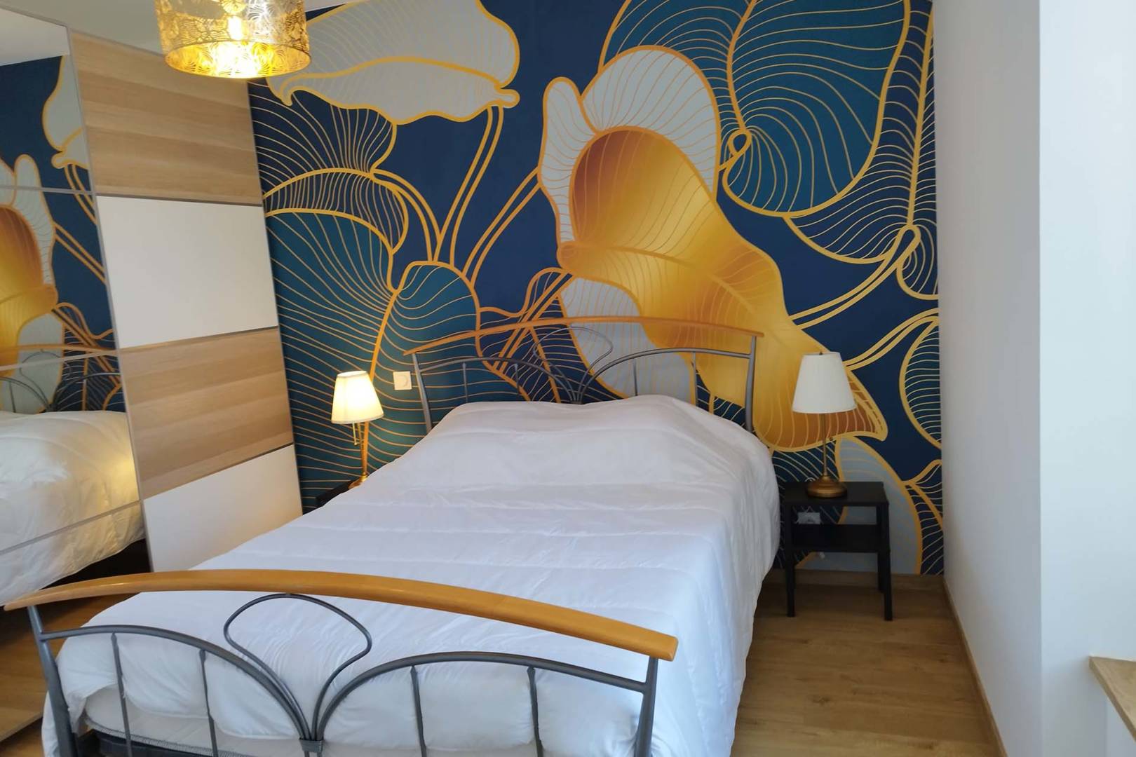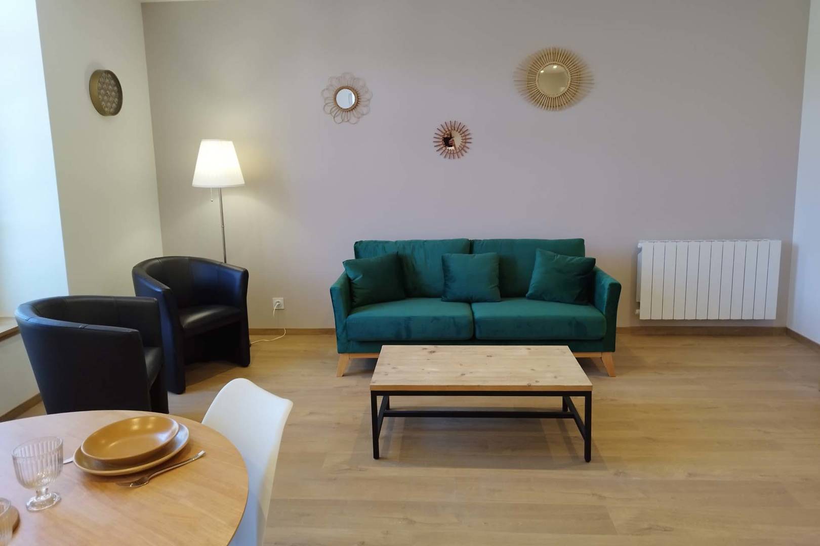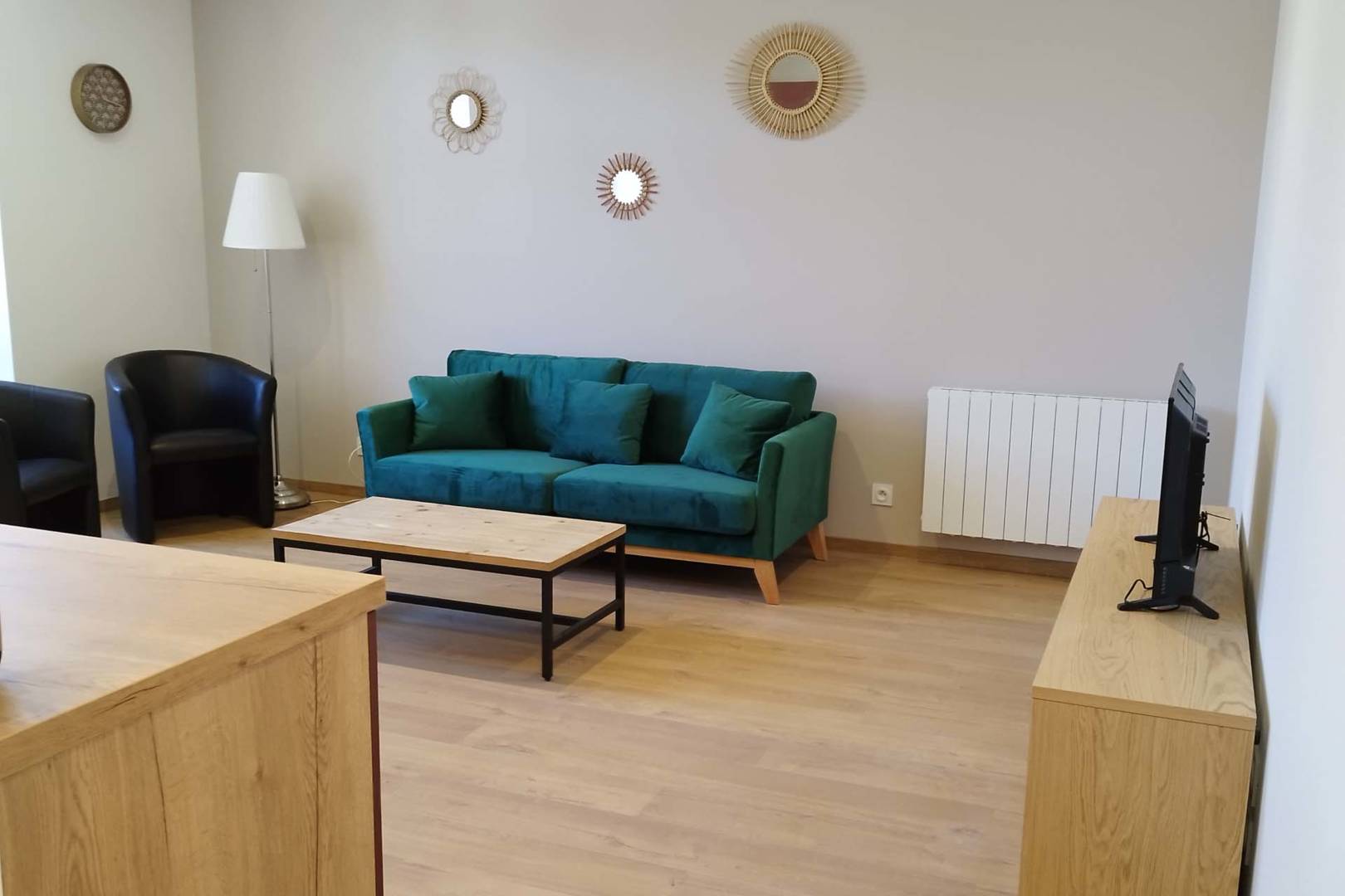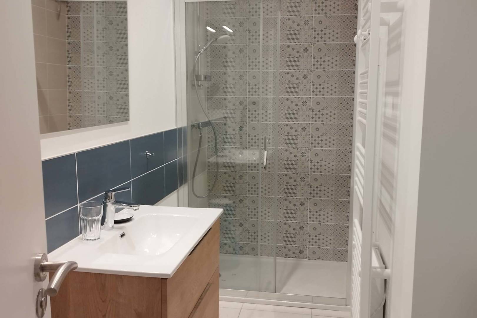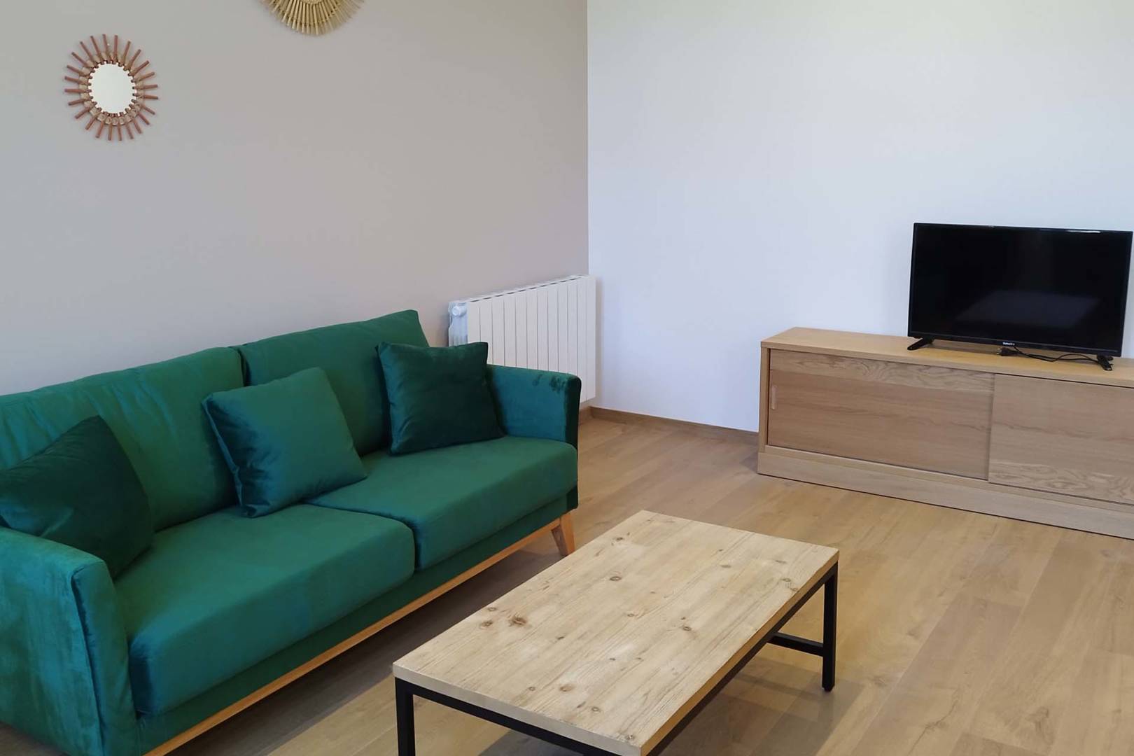 Salon avec 2 canapés, table basse et TV. Une chambre avec un lit de 140 et dressing. Salle d’eau avec douche à l’italienne, machine à laver et radiateur sèche serviettes.