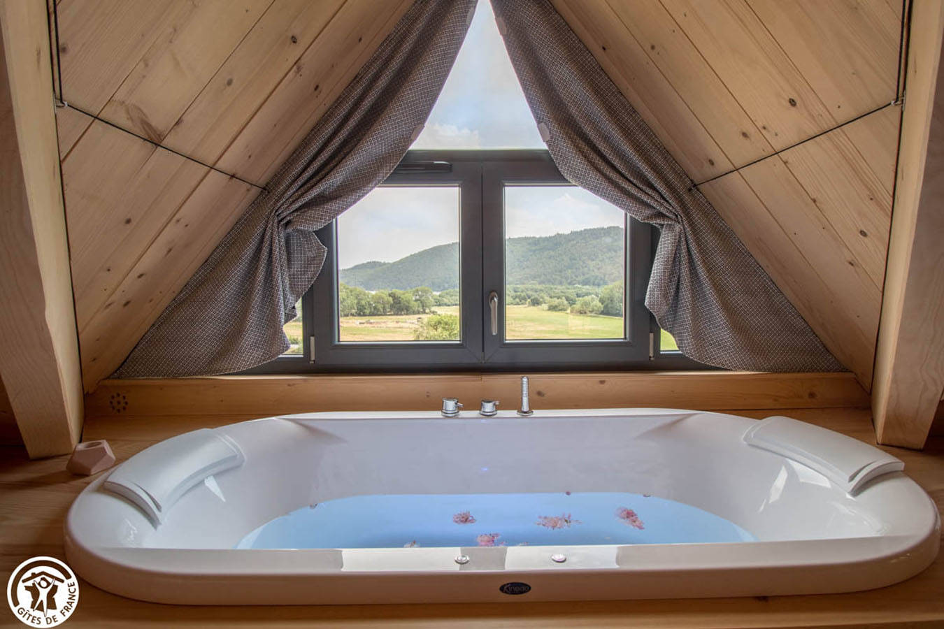 – un espace nuit avec un lit 160, cocon de sérénité et de bien être avec baignoire balnéo donnant sur le Lac Chambon.