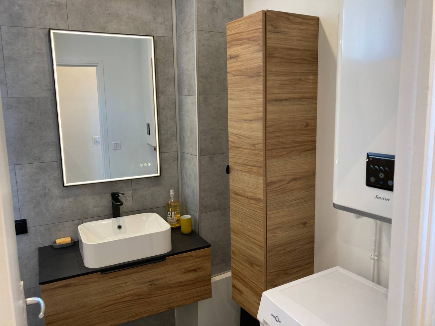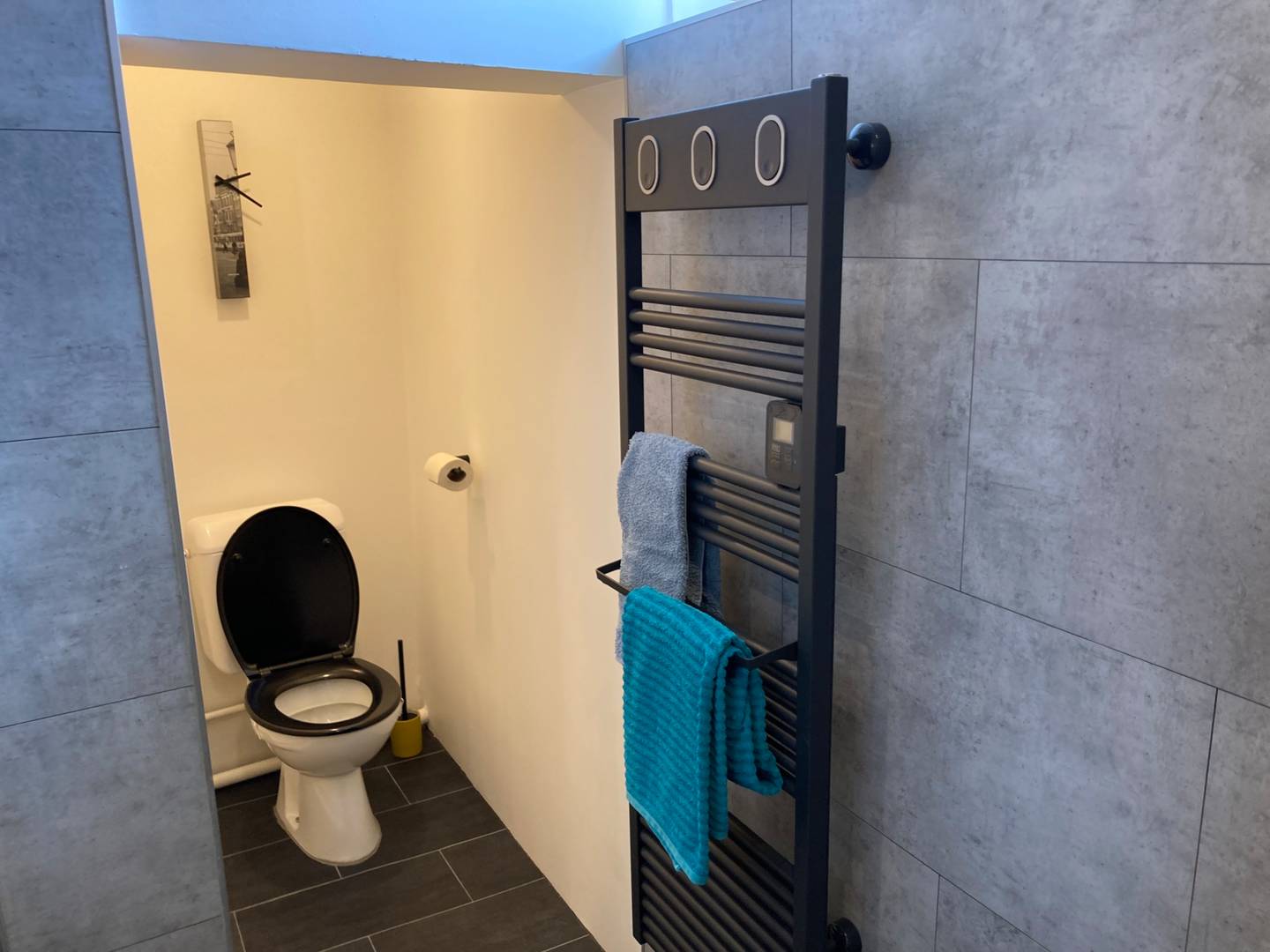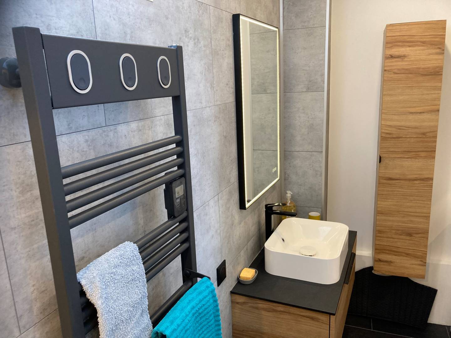 Salle d’eau avec rangements, meuble vasque, douche, sèche-serviettes, wc.