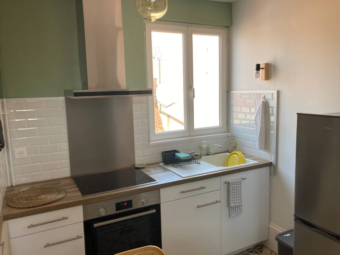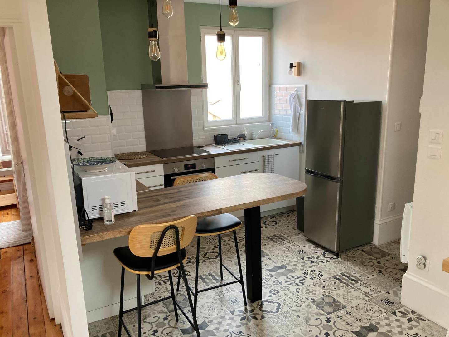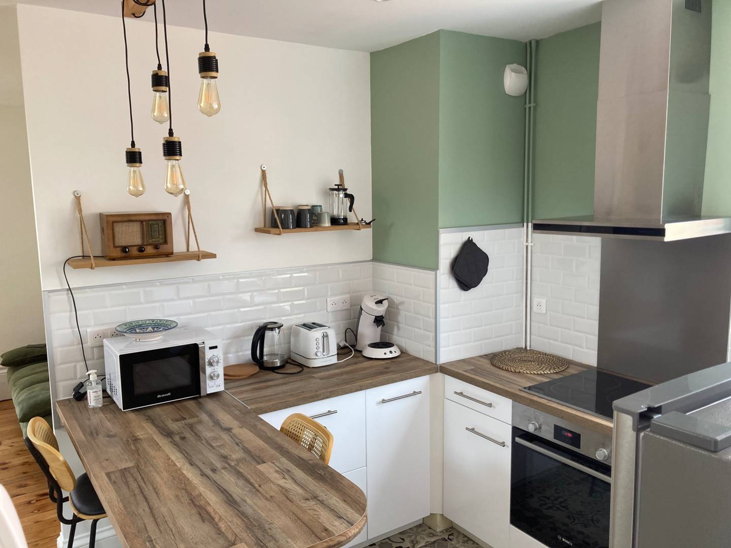 Cuisine lumineuse, toute équipée, îlot et 2 tabourets hauts avec dossiers, ouverte sur un petit espace bureau et le salon. Vous pourrez vous délasser sur un canapé, lire, jouer à la console, regarder la télévision ou vos plateformes de streaming personnelles (télé connectée et box internet avec fibre).