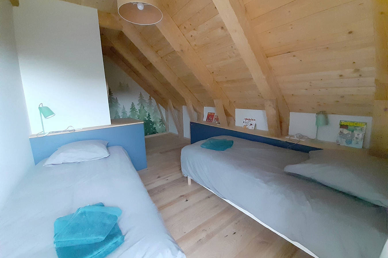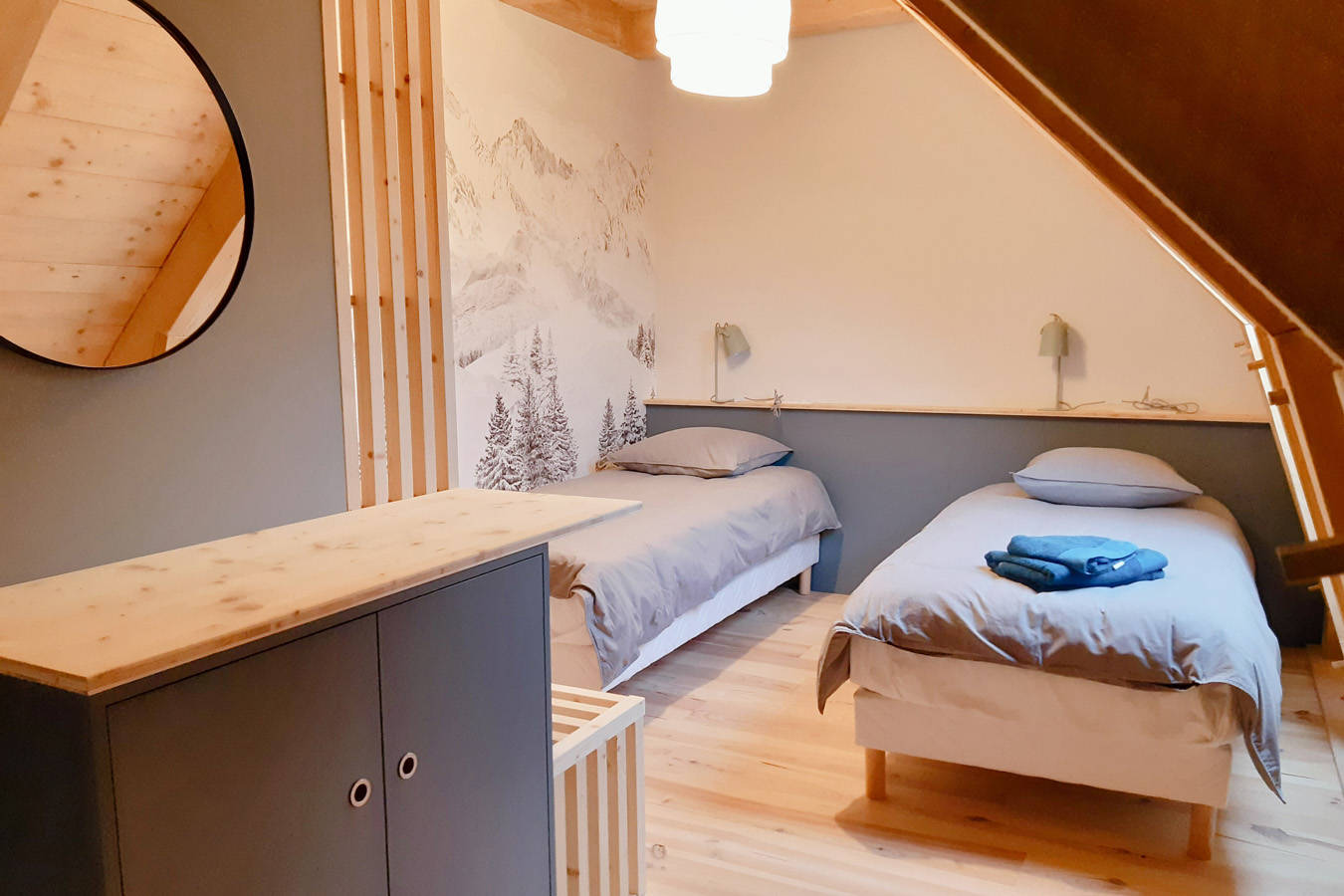 Au 1er étage sous les toits, trois chambres propices aux doux rêves et deux salles de bain dont une privative à la chambre parentale. Les poutres apparantes avec vue sur les montagnes font le charme de ces espaces de nuits.