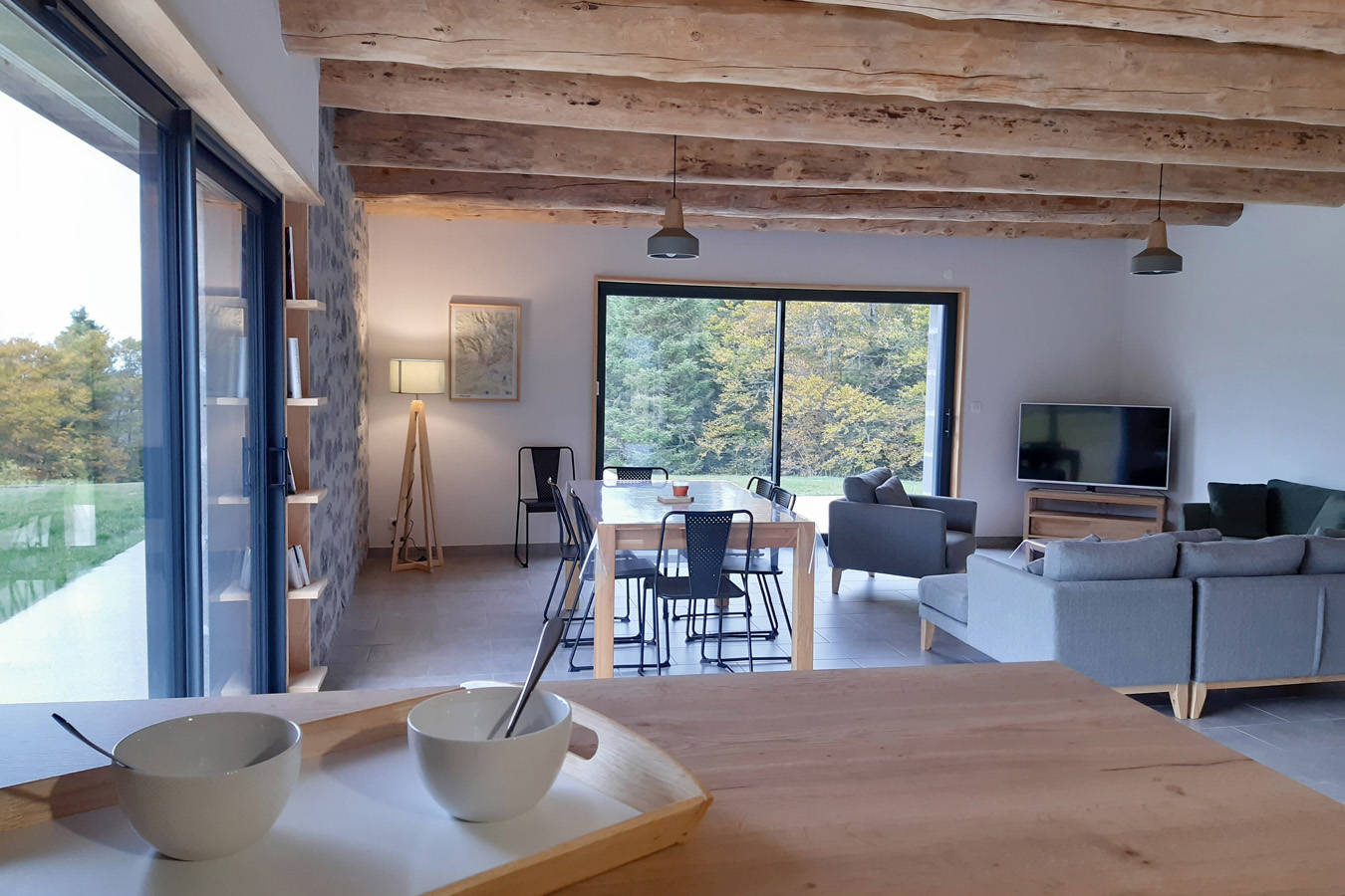 – Un salon séjour qui s’ouvre sur la terrasse avec vue imprenable sur le Sancy ; une table de la salle à manger pouvant accueillir jusqu’ à 12 personnes.