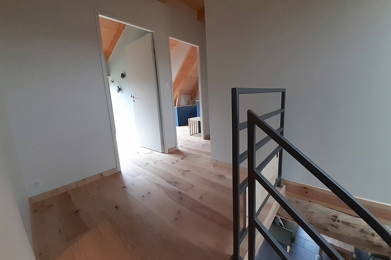 Au 1er étage sous les toits, trois chambres propices aux doux rêves et deux salles de bain dont une privative à la chambre parentale. Les poutres apparantes avec vue sur les montagnes font le charme de ces espaces de nuits.