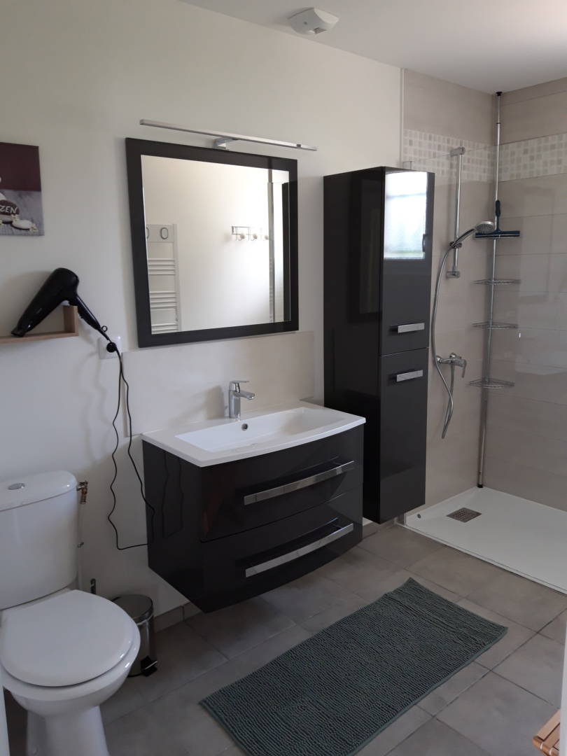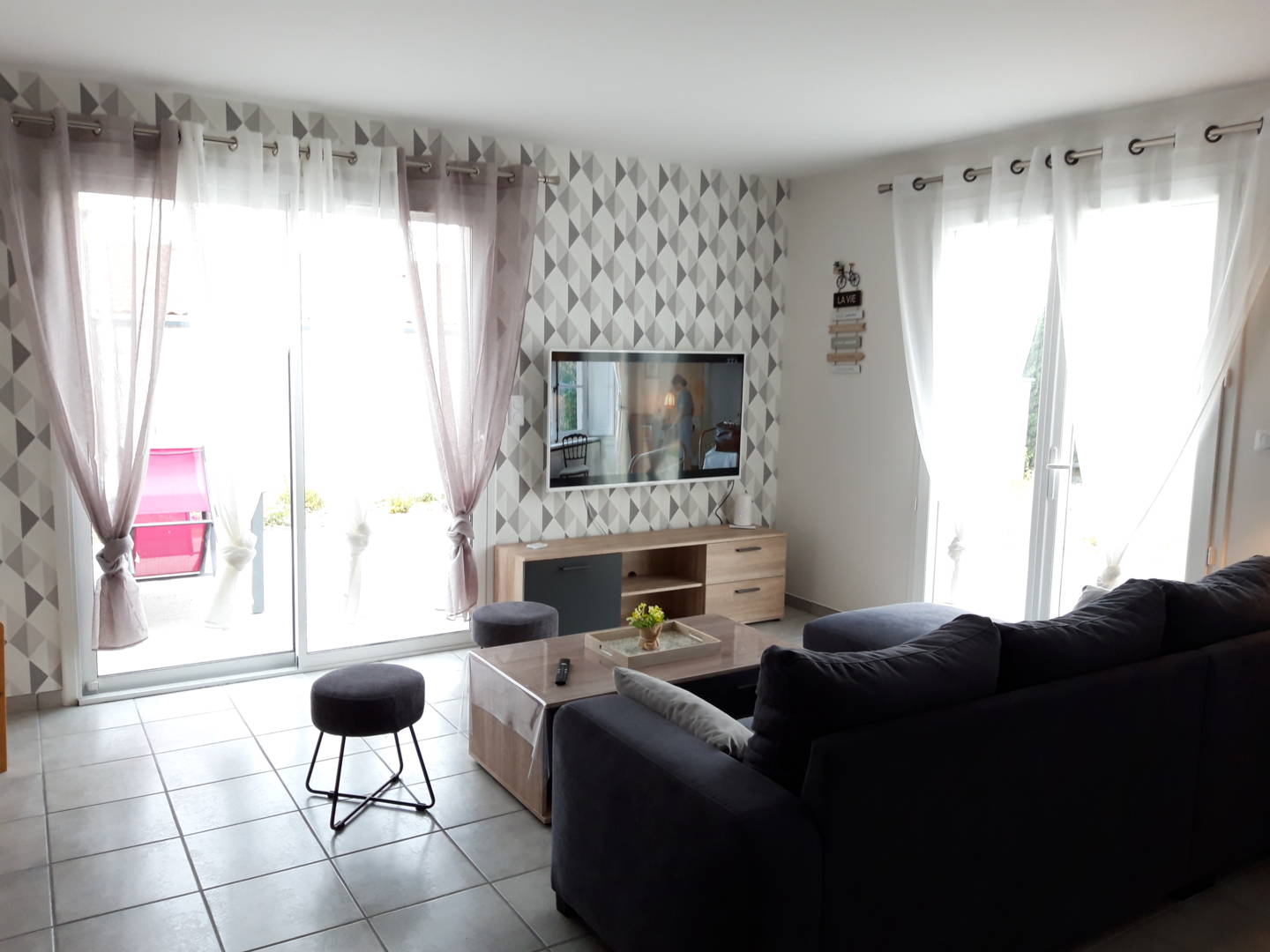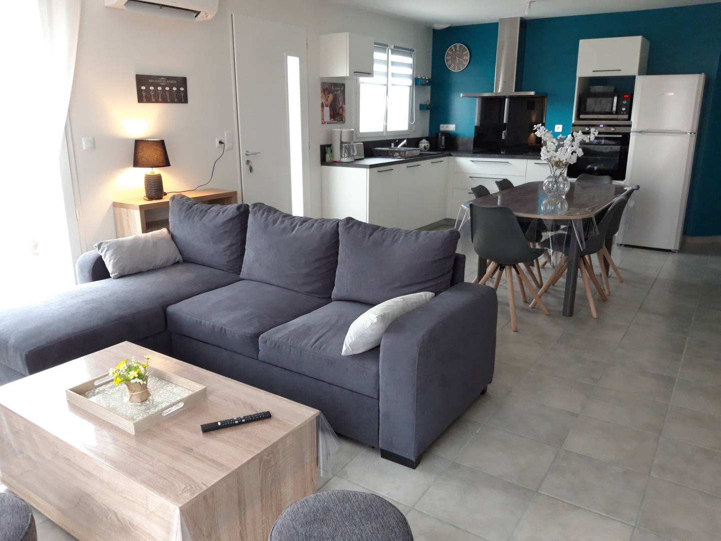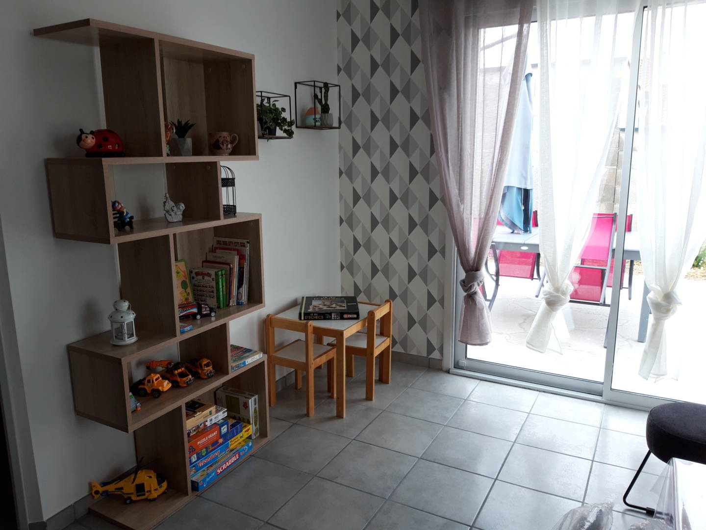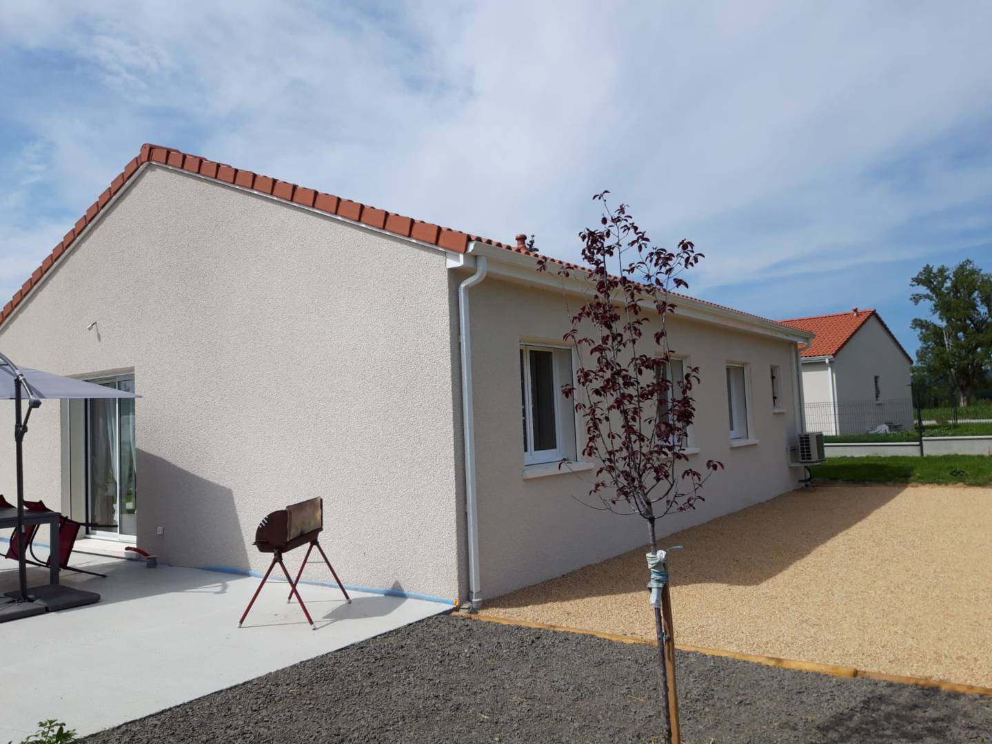 Maison plain pied avec clim réversible. Elle est composée d’une pièce principale avec cuisine équipée, d’un salon, d’une salle d’eau/wc, 3 chambres avec dressing, d’un garage avec un lave-linge, une terrasse aménagée et un jardin avec un terrain de pétanque et jeux enfants.