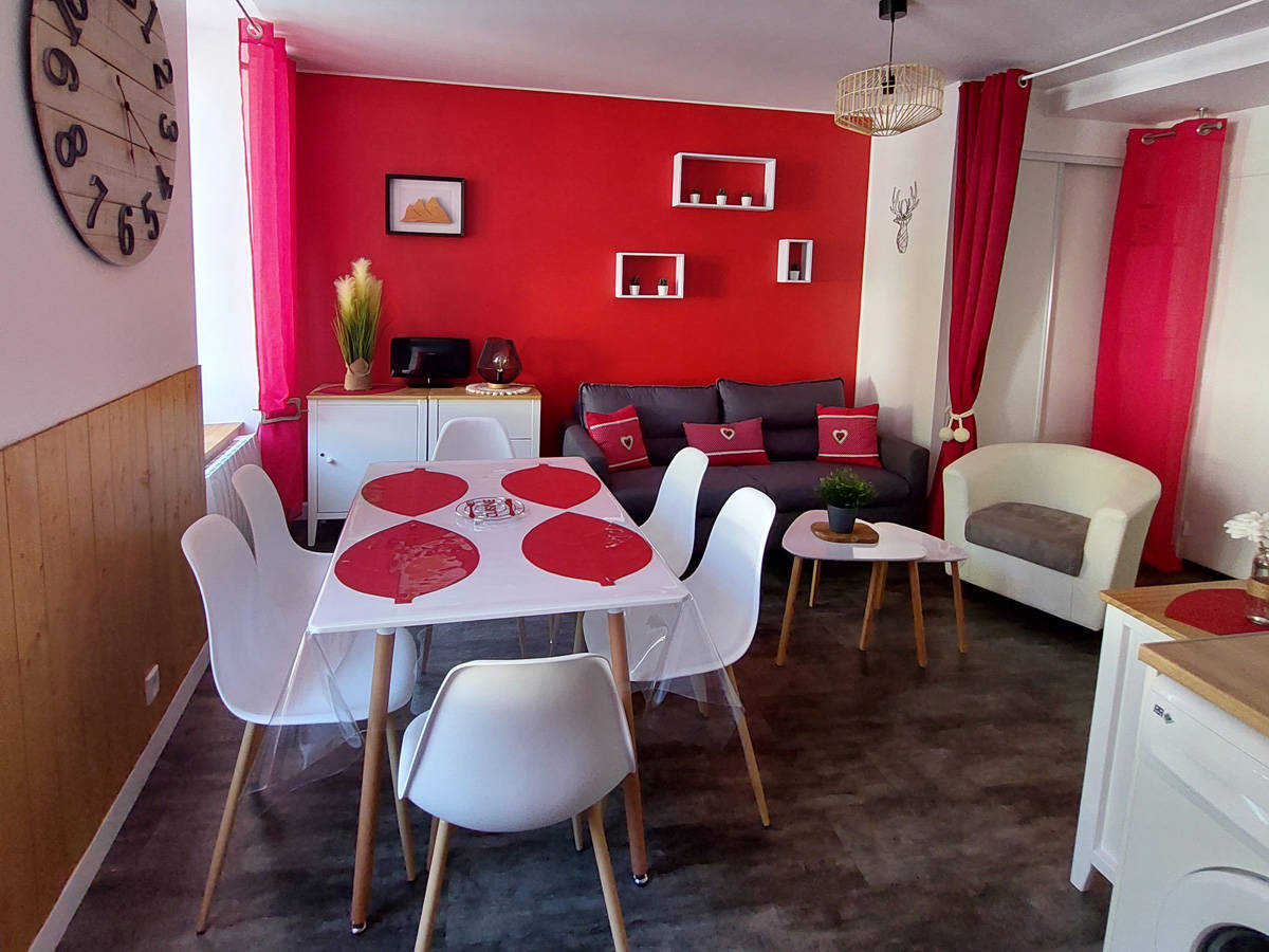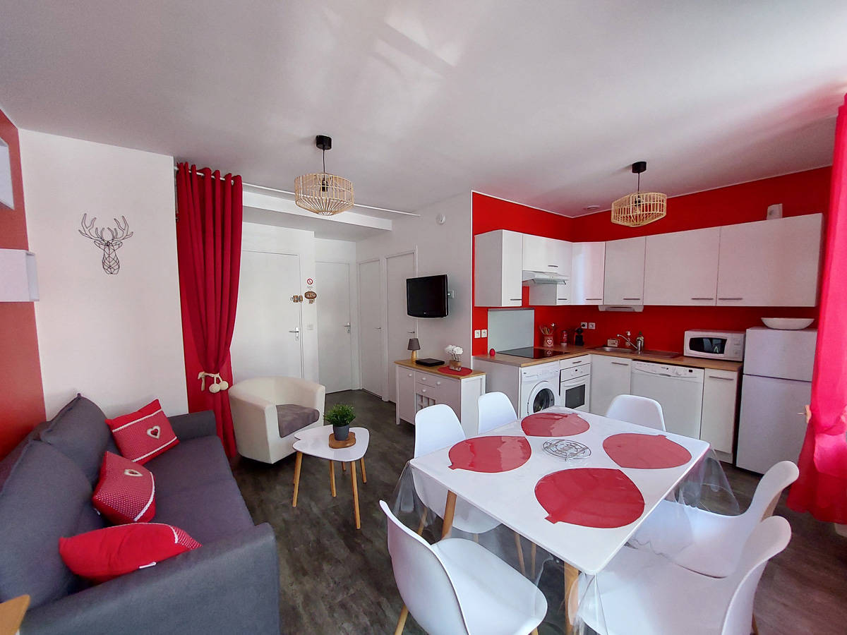 Cet appartement comprend : – un espace ouvert salon, salle à manger, cuisine avec un canapé lit 140/190 – Cuisine équipée, plaques vitro céramique -1 chambre avec lit double 140/190 et 1 lit superposé 90/190 -1 salle de bain -1 WC séparé -Wifi gratuit -Casier à ski individuel dans le couloir de la résidence.