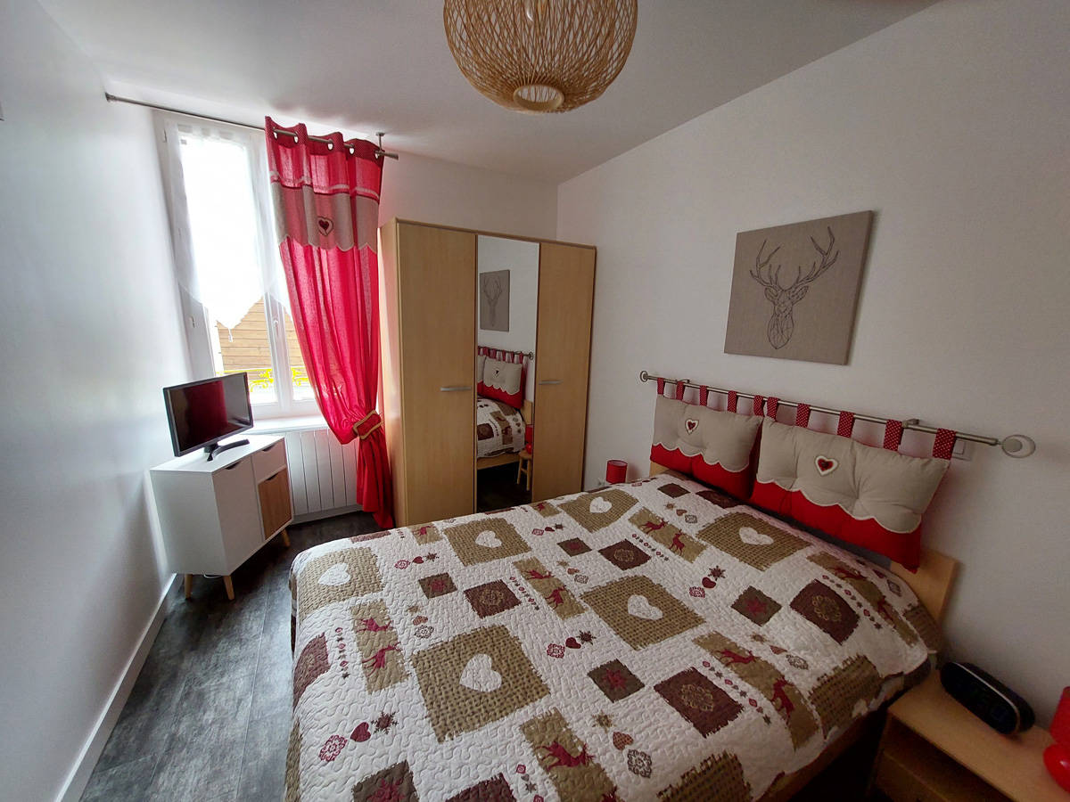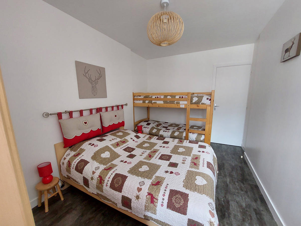 Cet appartement comprend : – un espace ouvert salon, salle à manger, cuisine avec un canapé lit 140/190 – Cuisine équipée, plaques vitro céramique -1 chambre avec lit double 140/190 et 1 lit superposé 90/190 -1 salle de bain -1 WC séparé -Wifi gratuit -Casier à ski individuel dans le(…)