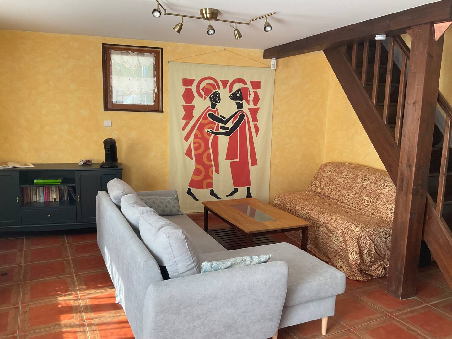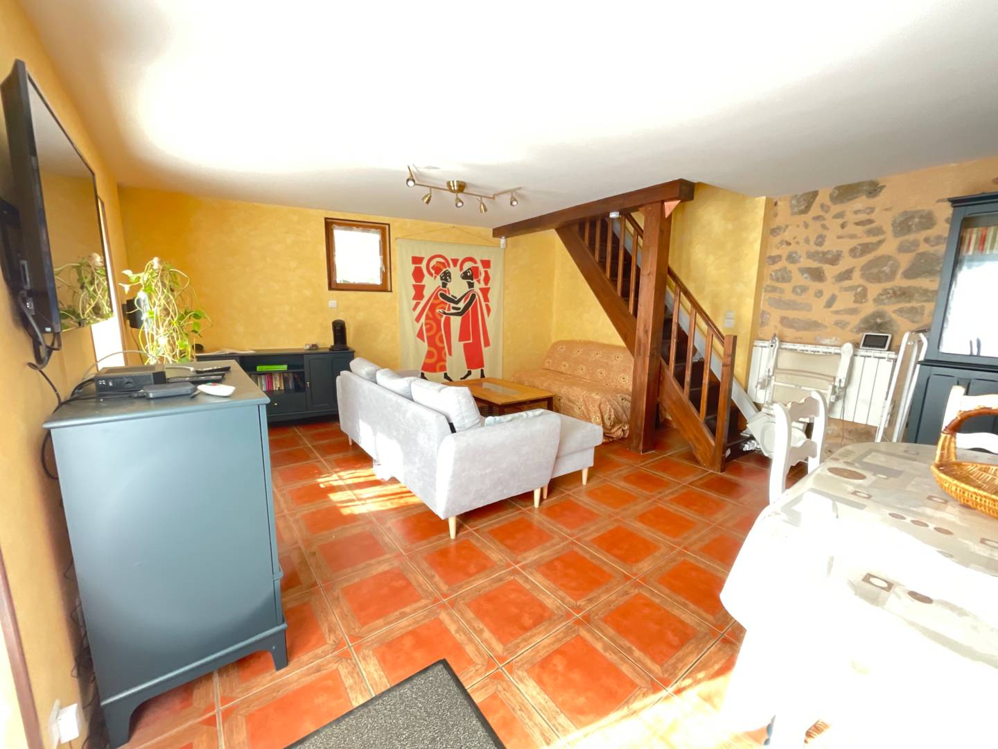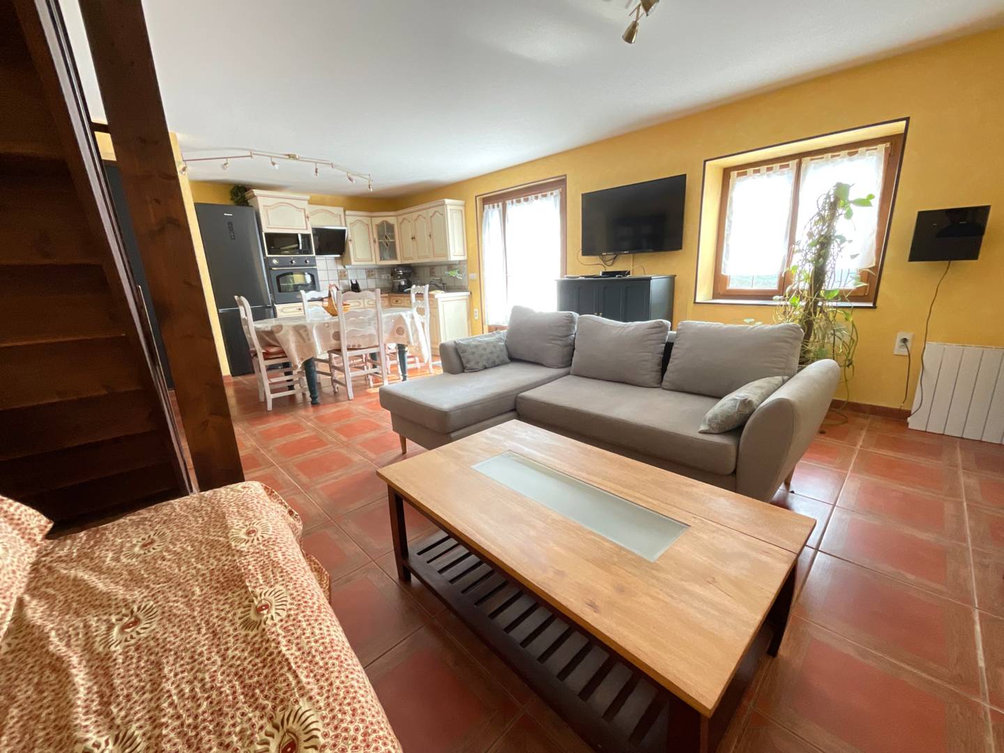 Au rez-de-chaussée : grand séjour avec espace cuisine, espace salle à manger et espace salon (avec canapé convertible). A l’étage : deux chambres et une salle de bain.