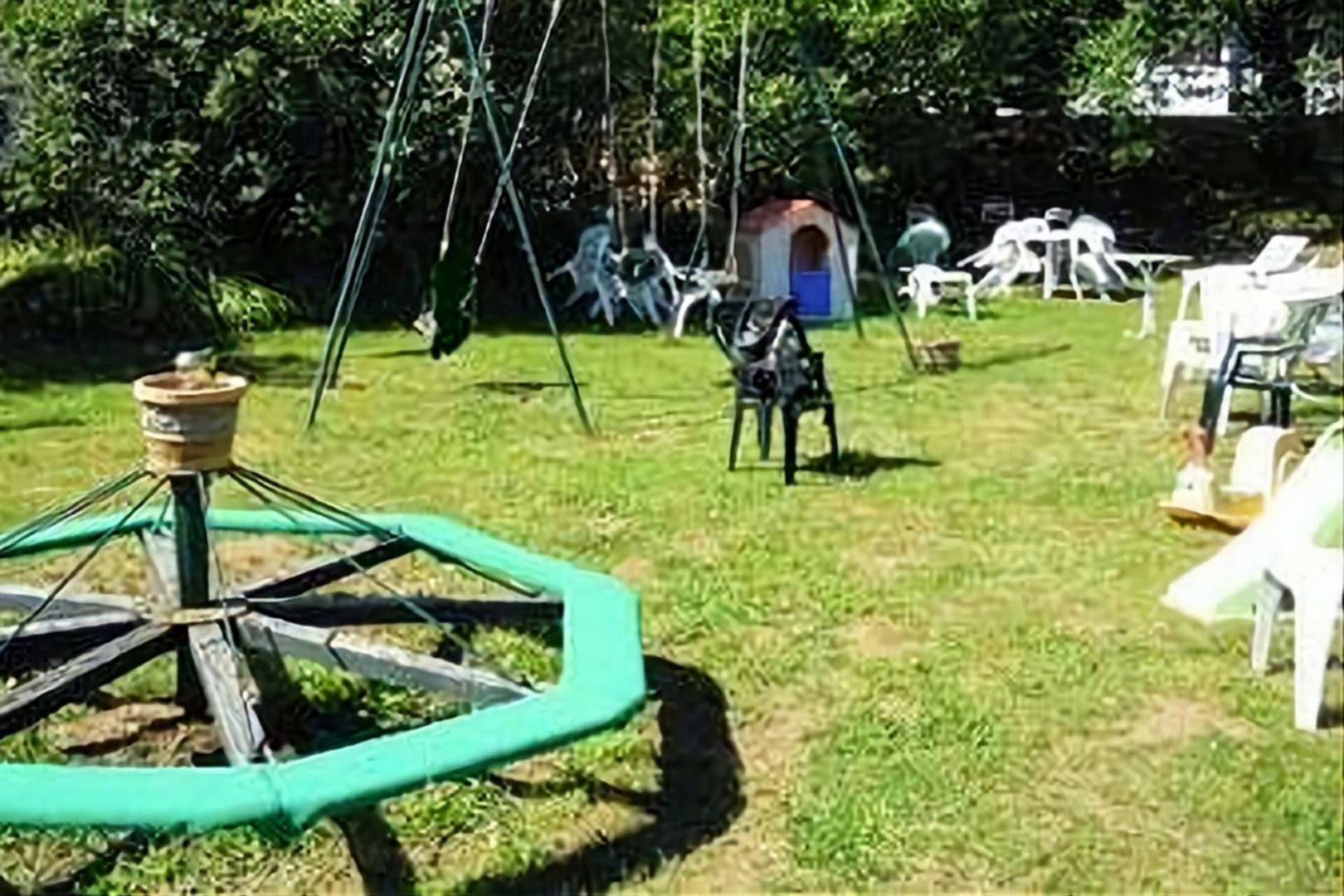 Cour avec jeux pour enfants, transats, terrain de pétanque et barbecue