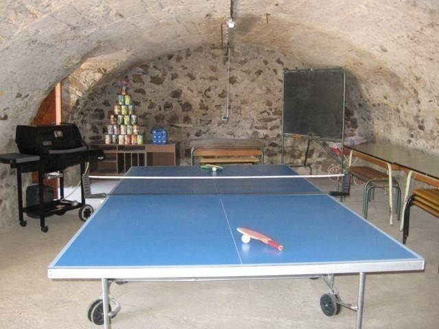 Ainsi, les deux balcons correspondent à deux entrées. Les chambres, réparties de part et d’autre du gîte sont donc bien séparées. Au rez-de-chaussée, une grande voûte fait office de salle de jeux (avec table de ping-pong, tableau noir,…) et on peut, en toute sécurité, y entreposer du matériel et y abriter vélos et motos.