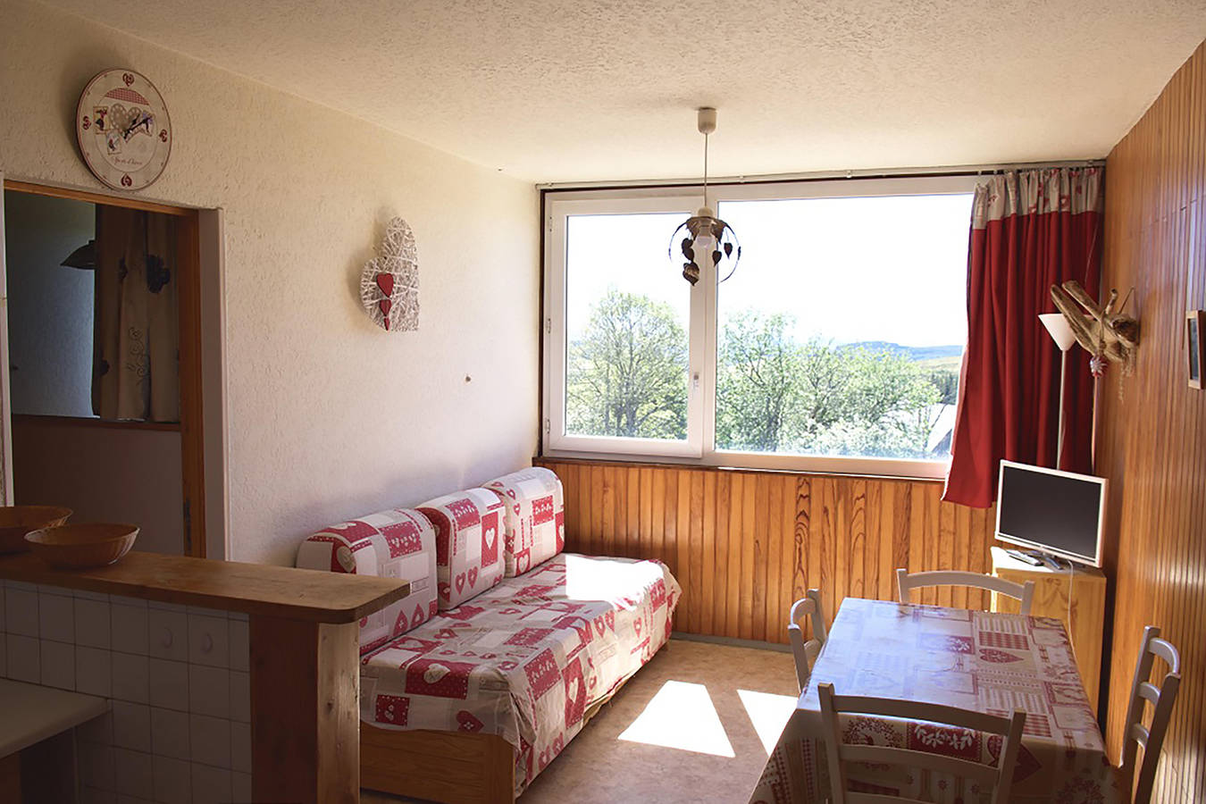 Pour profiter d’un moment de détente à la montagne cet appartement lumineux coquet, décoration soignée, exposition plein sud avec une vue sur les Monts du Cantal, est composé d’une pièce à vivre fonctionnelle, une chambre fermée. Il dispose de 4 couchages avec un salle d’eau ( cabine de douche)et WC… IL est situé au 2ème étage côté Sud et RC côté Nord.