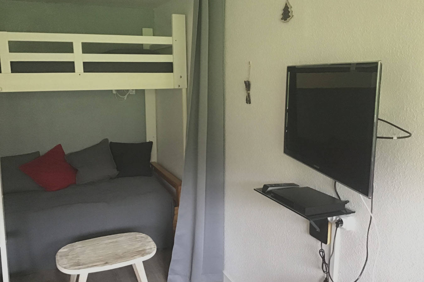 Ce logement avec grand balcon avec vue sur le Massif du Sancy est composé d’une pièce de vie de 21 m², d’une chambre, d’un coin nuit avec un lit mezzanine une personne et au dessous lit une personne transformable en 140 cm, d’une cuisine aménagée et équipée, d’une salle de(…)