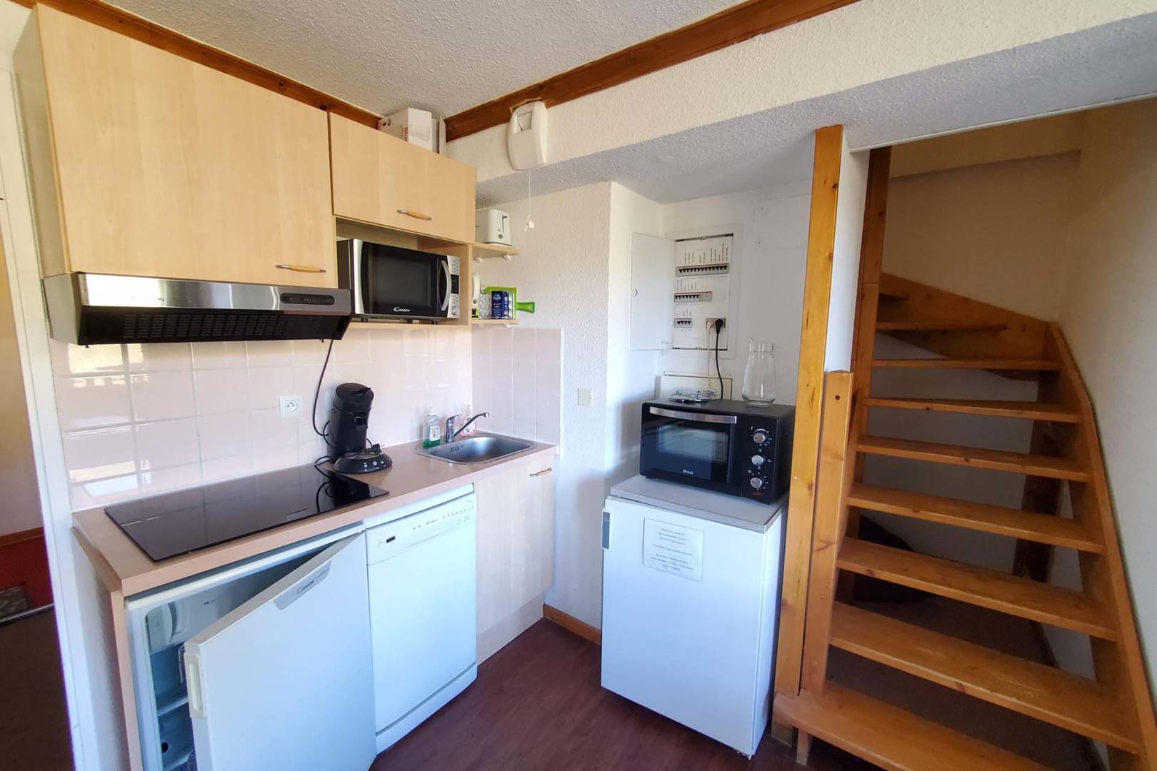 La cuisine américaine, est équipée avec réfrigérateur, micro-ondes, lave-vaisselle, vaisselle/couvert, ustensiles/cuisine, grille-pain et bouilloire.
