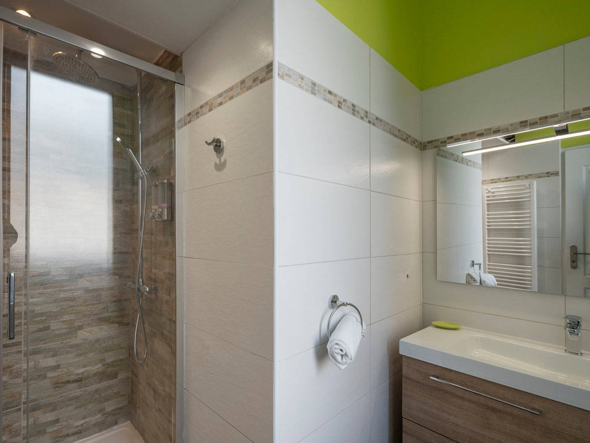 L’appartement possède également un WC indépendant, et une salle de bain avec une grande douche.