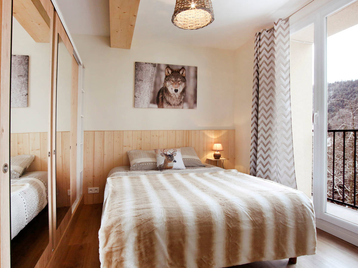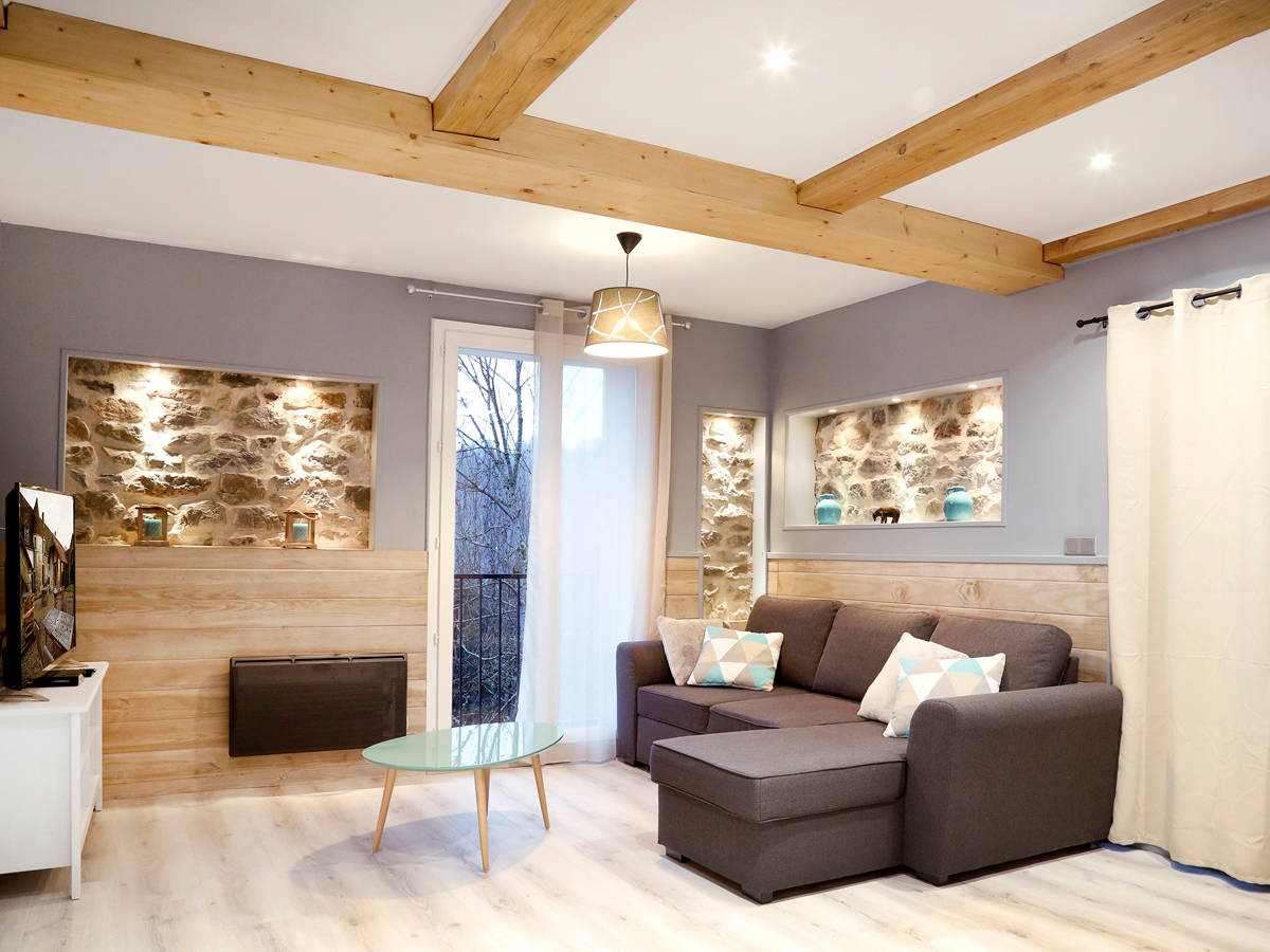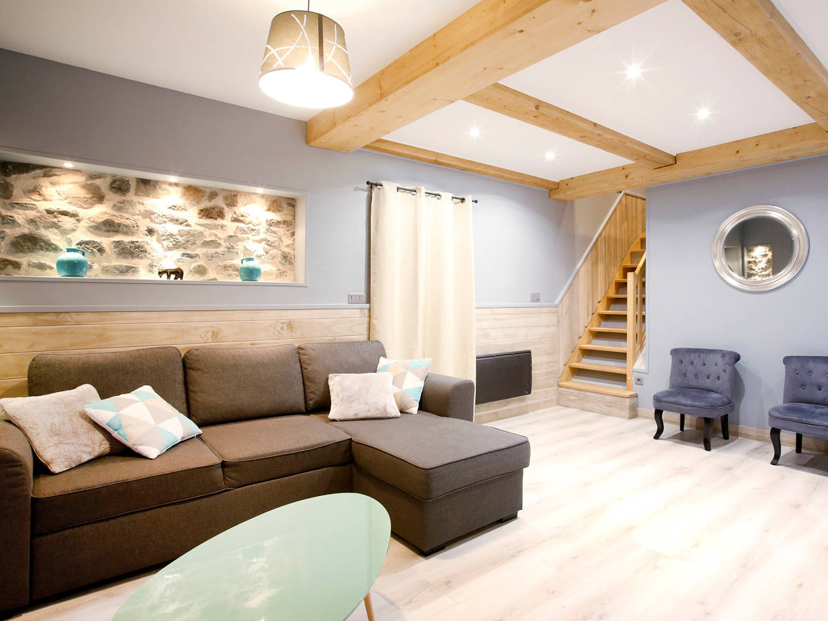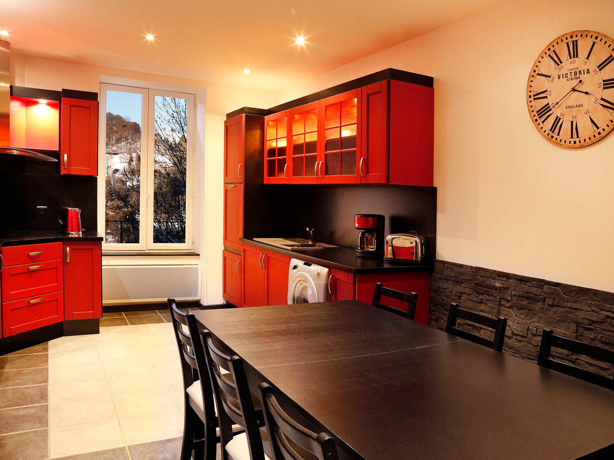 Au RDC sur 25m², salle à manger / cuisine entièrement équipée, grand placard de rangement. Au R-1, un espace de 50m² composé d’un salon de 20m² avec canapé d’angle convertible, TV 120 cm, wifi, lecteur DVD ; d’une chambre avec lit 140 x 190 + grand placard penderie ; d’une chambre 2 x 2 lits superposés 90 x 190 ; d’une salle d’eau avec double vasque, douche, sèche-serviettes ; d’un WC séparé. 2 balcons avec vue sur le Mont-Dore et le Sancy. Cour 8m² en façade.