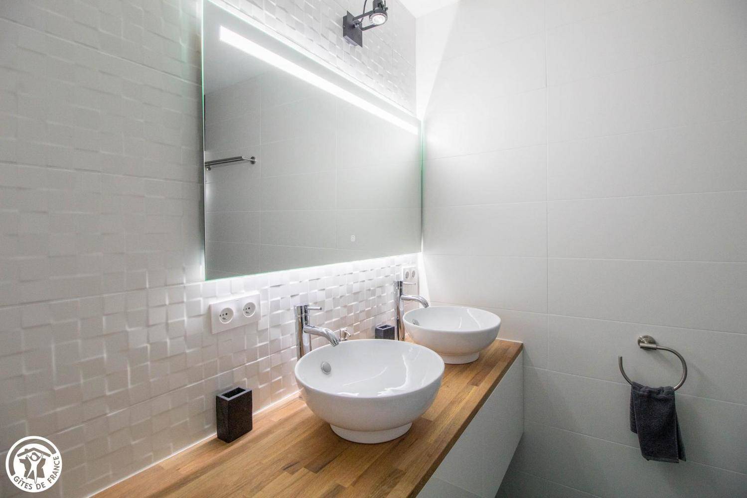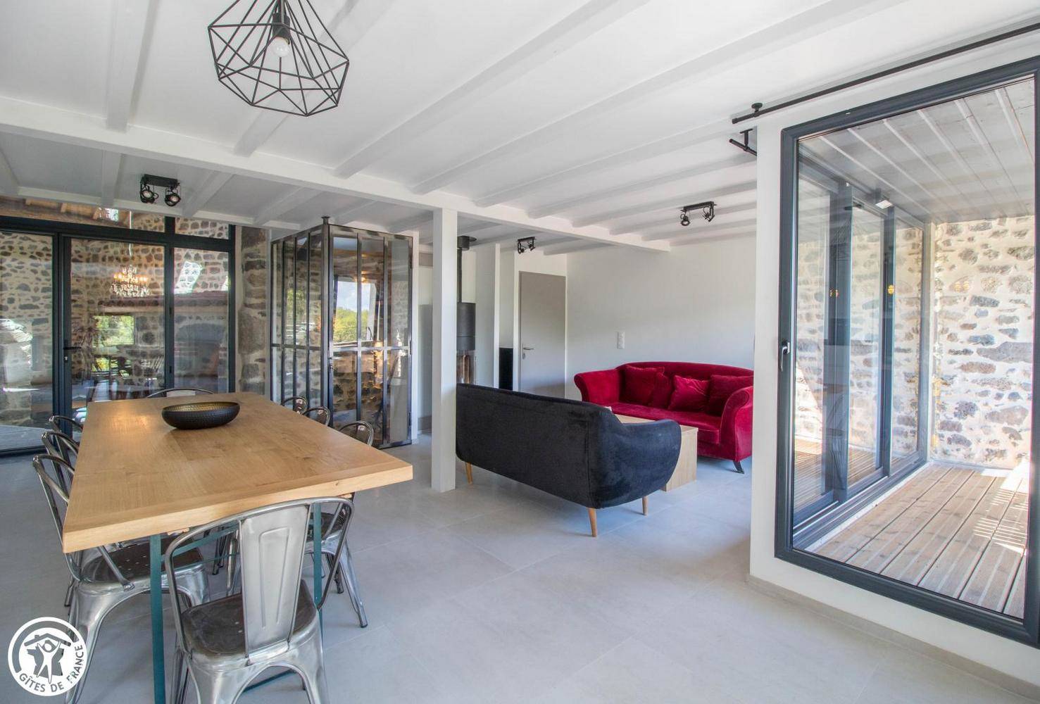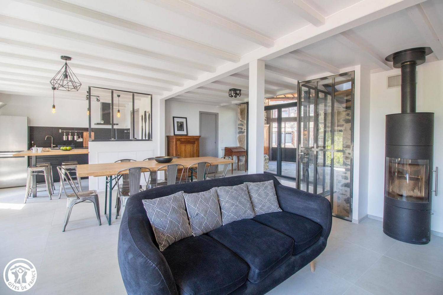 Elle se compose au rez-de-chaussée d’une spacieuse pièce à vivre baignée de lumière grâce aux nombreuses verrières donnant sur l’extérieur et sur le grand jardin d’hiver : cuisine ouverte et espace salon avec poêle à bois (ballots de bois mis à votre disposition gratuitement à votre arrivée), wc indépendant, terrasse(…)