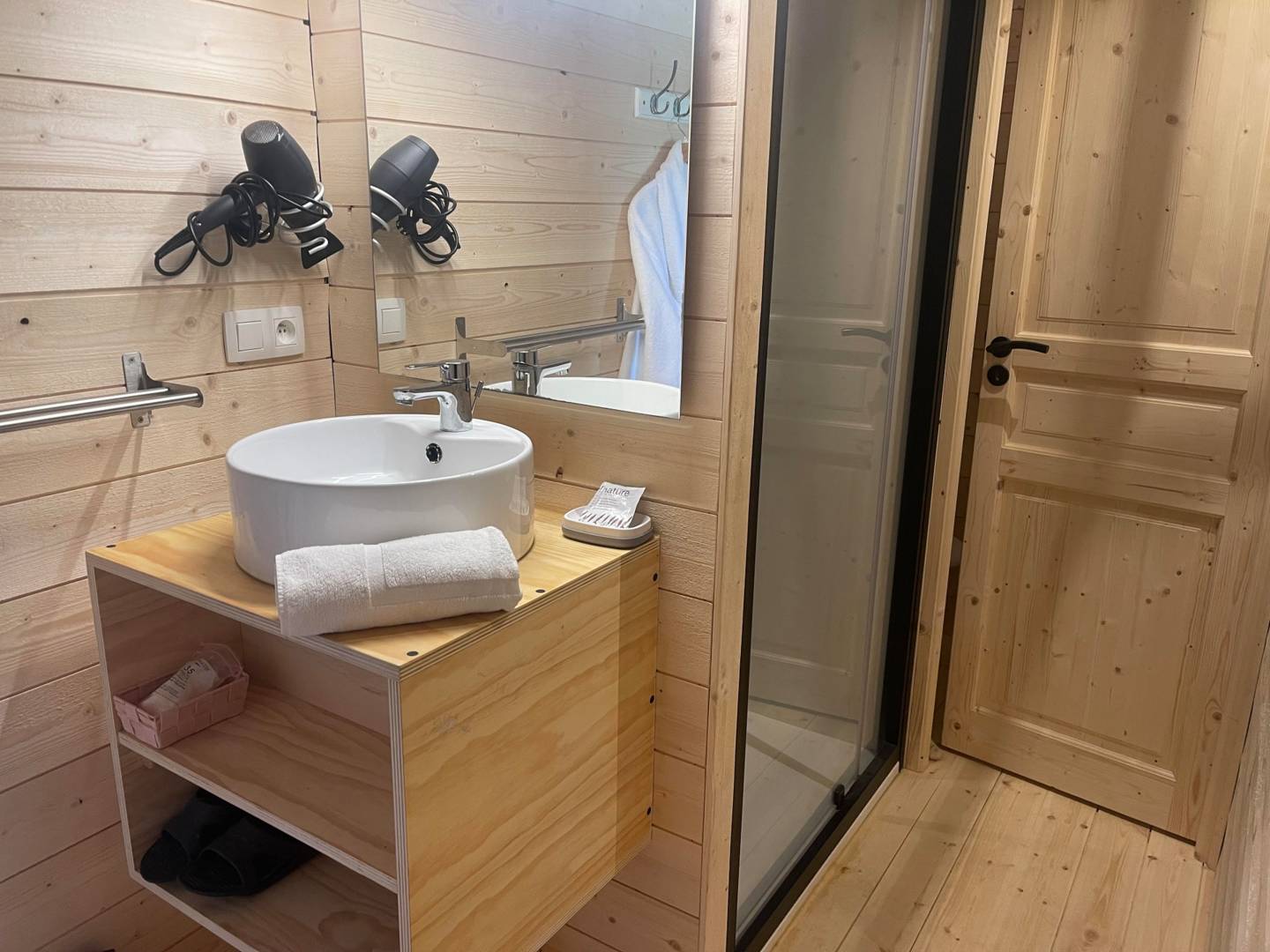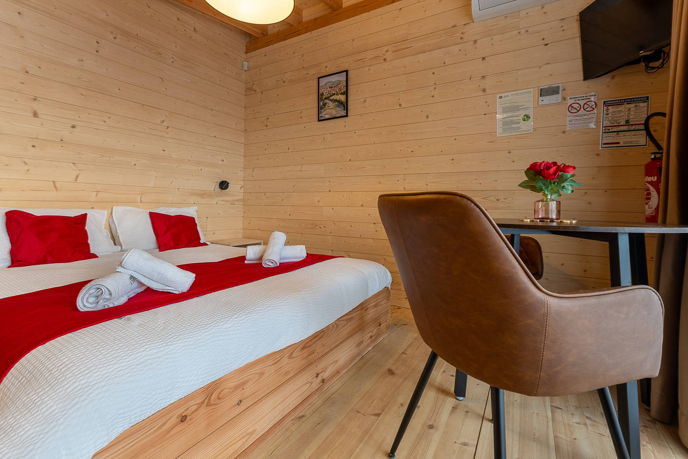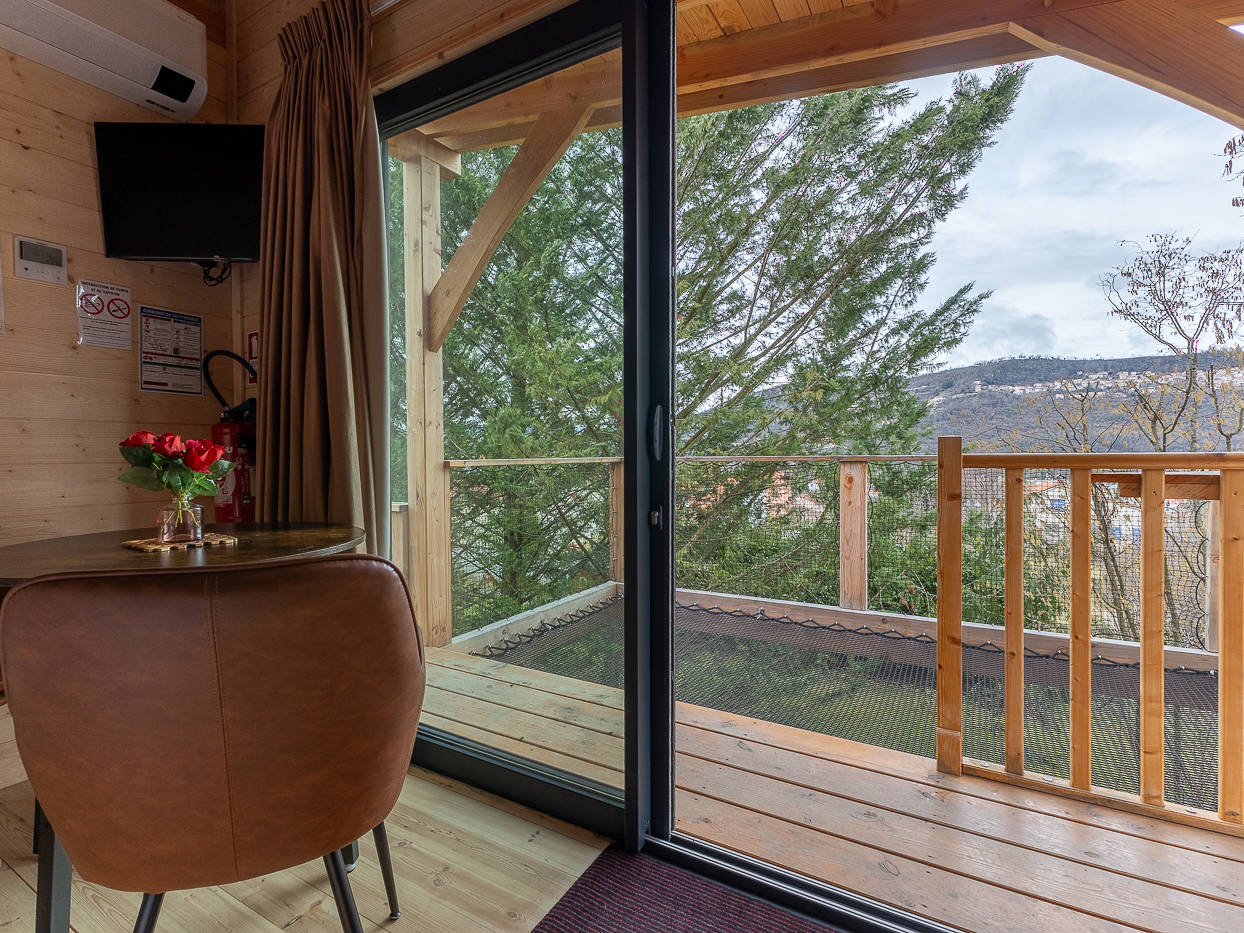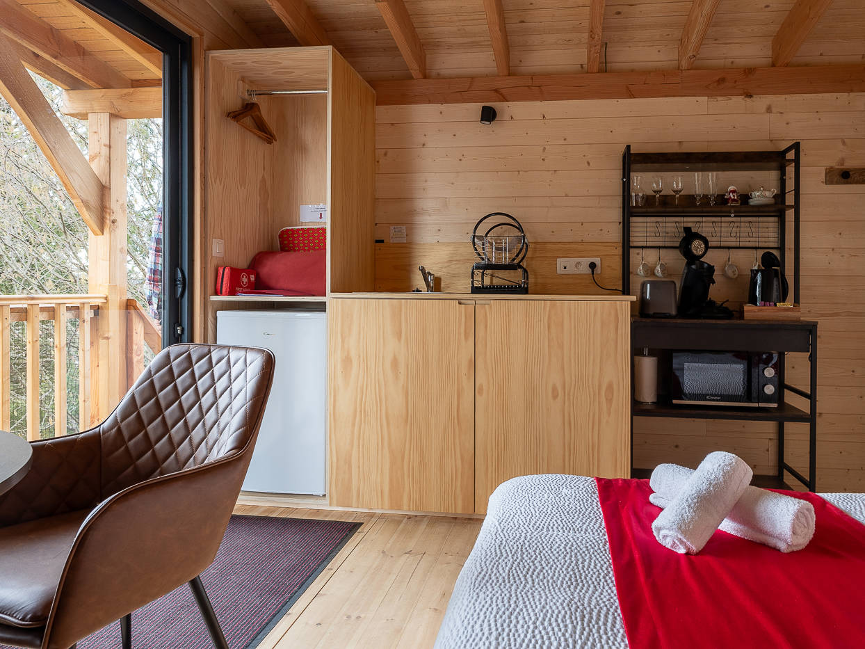 Perchée à l’abri des regards, la cabane offre une ambiance chaleureuse, soutenue par une climatisation réversible discrète et un Wi-Fi haut débit pour ceux qui souhaitent rester connectés.