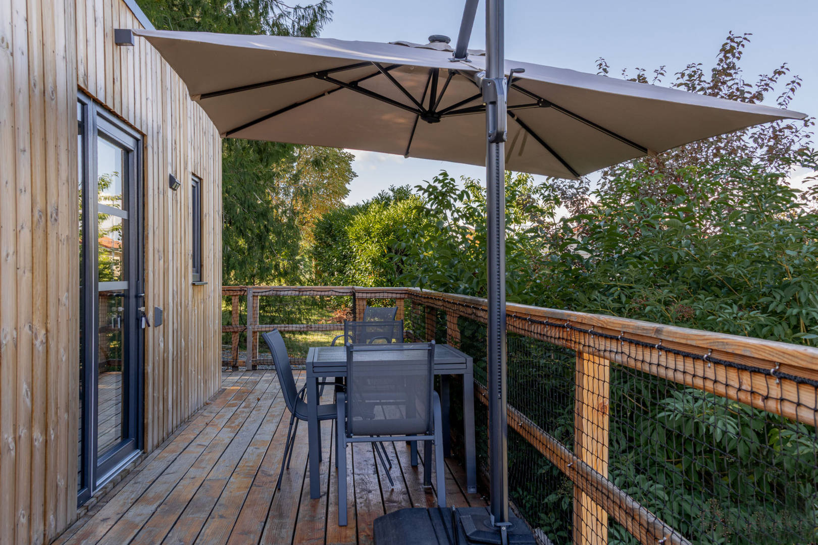 La terrasse de plain-pied, parfaitement intégrée à l’environnement naturel, devient un lieu privilégié de détente.