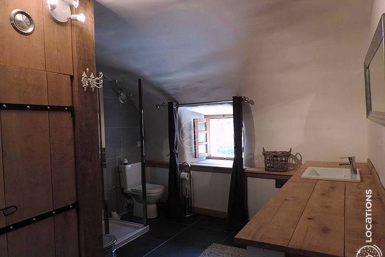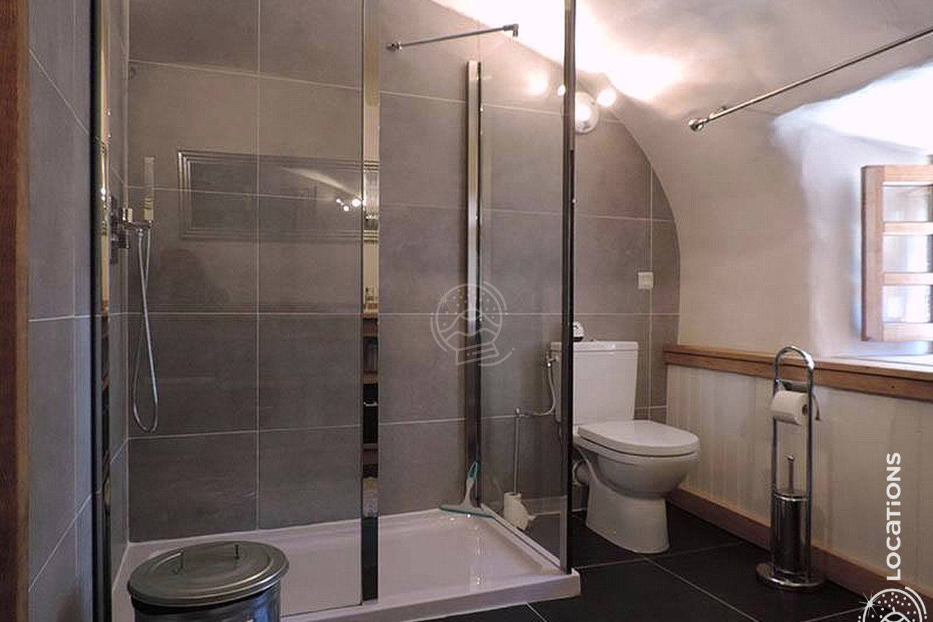 Il vous faudra en effet sortir de la maison et descendre en rez de jardin pour trouver cette belle pièce avec sa grande douche à l’italienne.