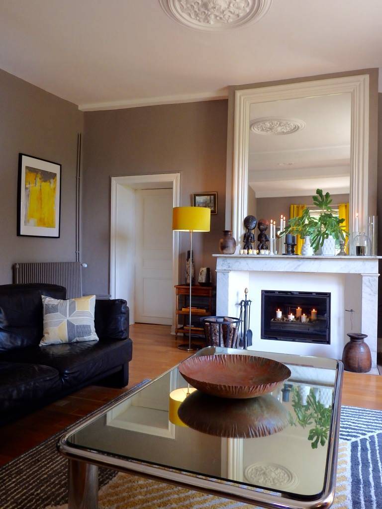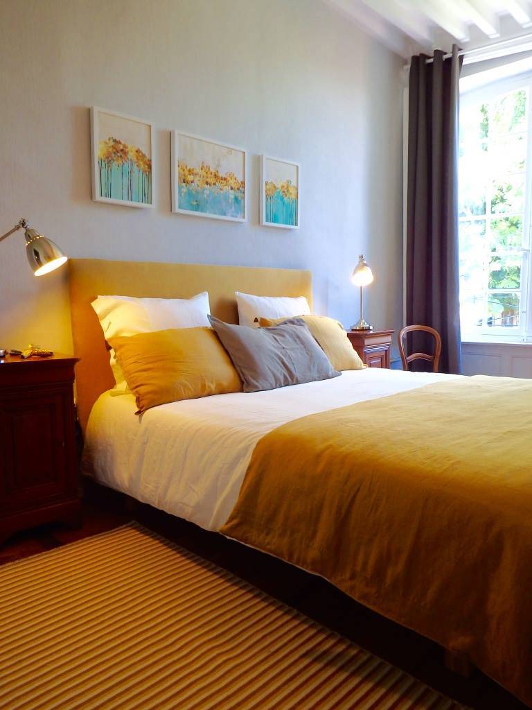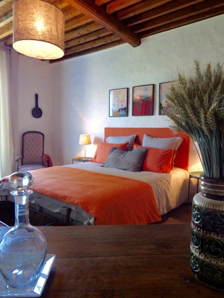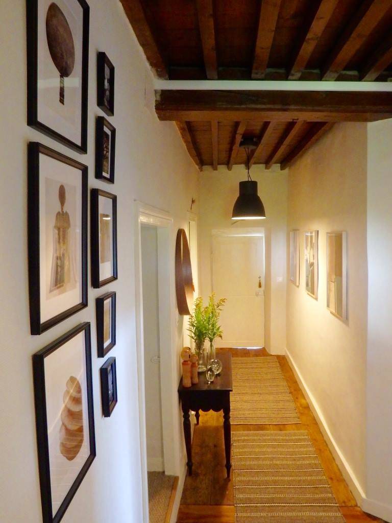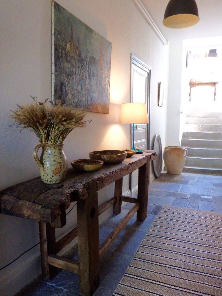 L’intérieur de la maison est un subtil mélange de modernité et de traditionnel (escalier et dalles en pierre de lave volcanique, cheminées anciennes, murs à pans de bois enduits à la chaux, planchers d’origine en chêne, plafonds voutés ou bien à la française, tomettes…). Les meubles d’époque, pièces design et objets coup de cœur chinés sont mis en valeur dans une atmosphère “maison de famille”.