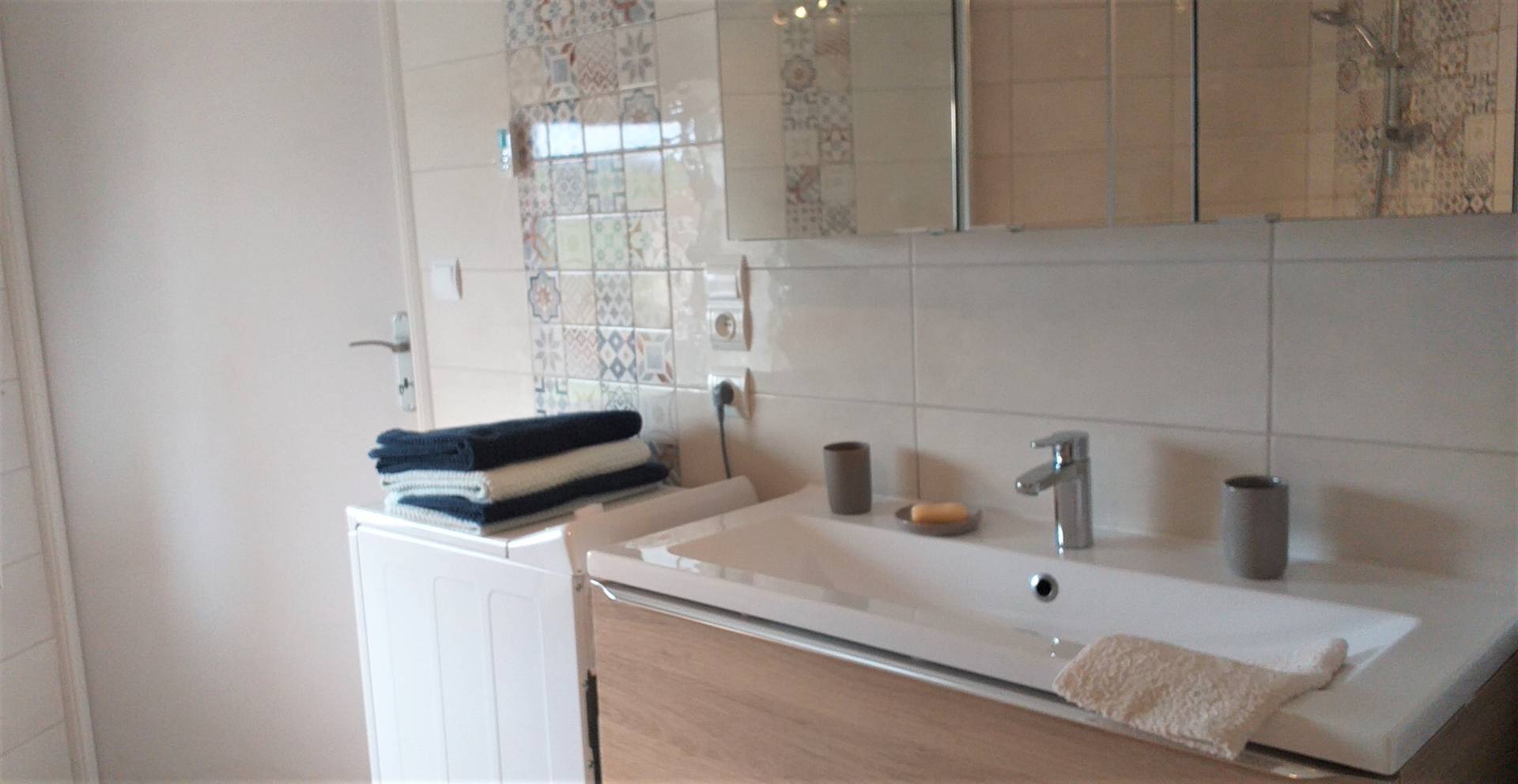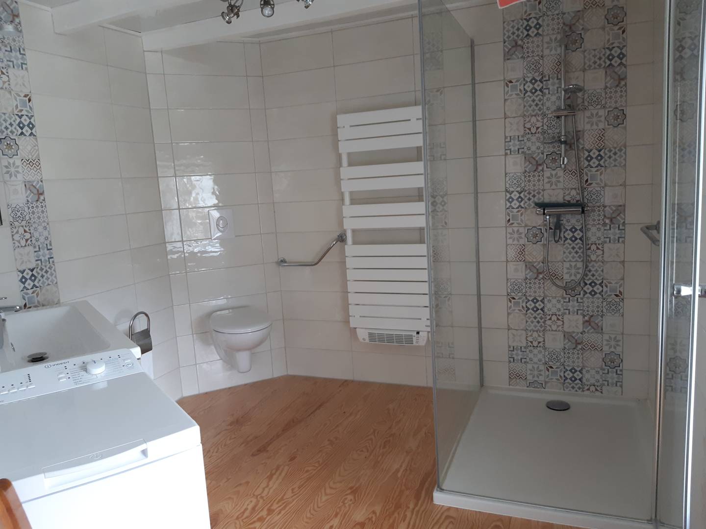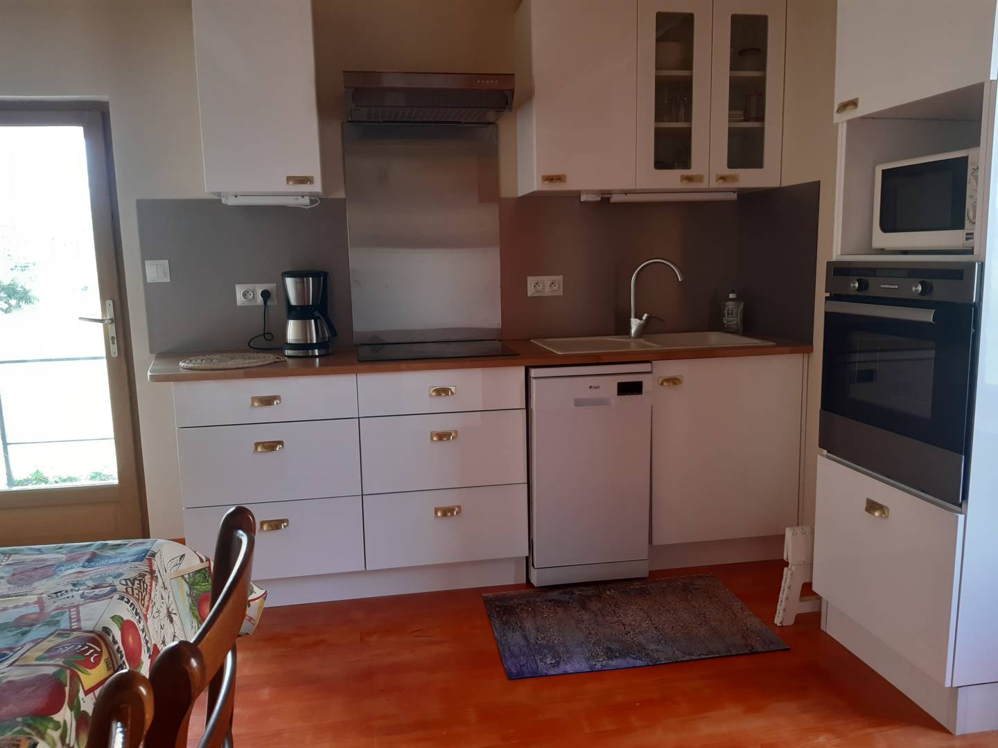 Vous entrez directement dans la cuisine toute équipée : table de cuisson induction, four pyrolyse, lave-vaisselle, réfrigérateur(…)
