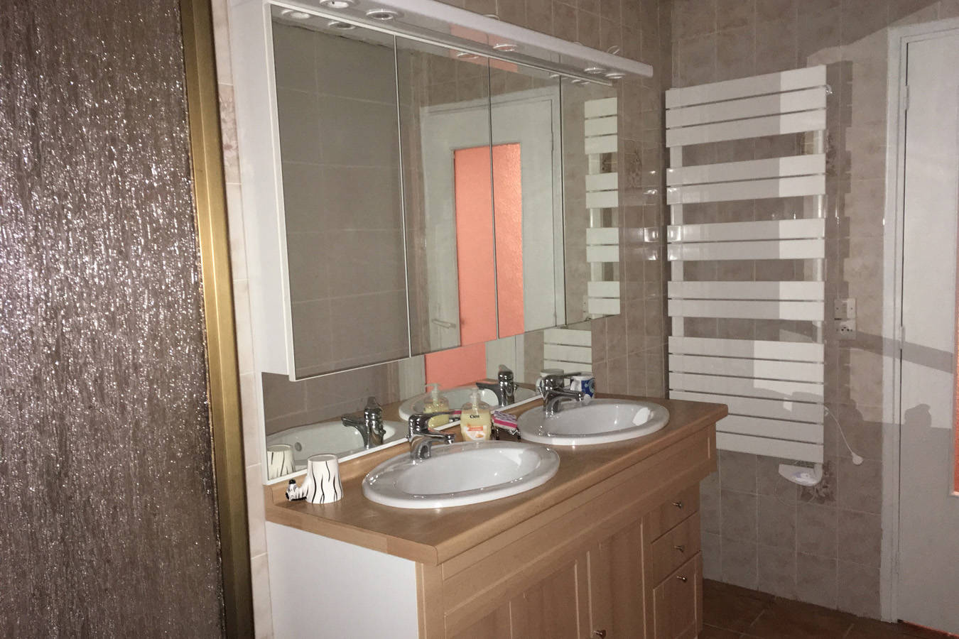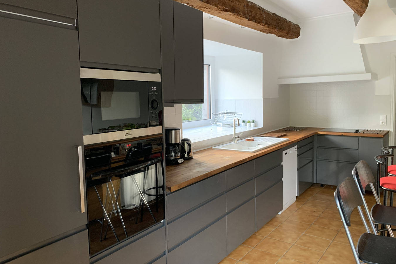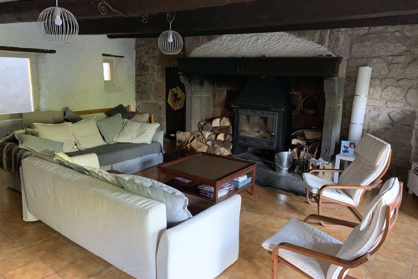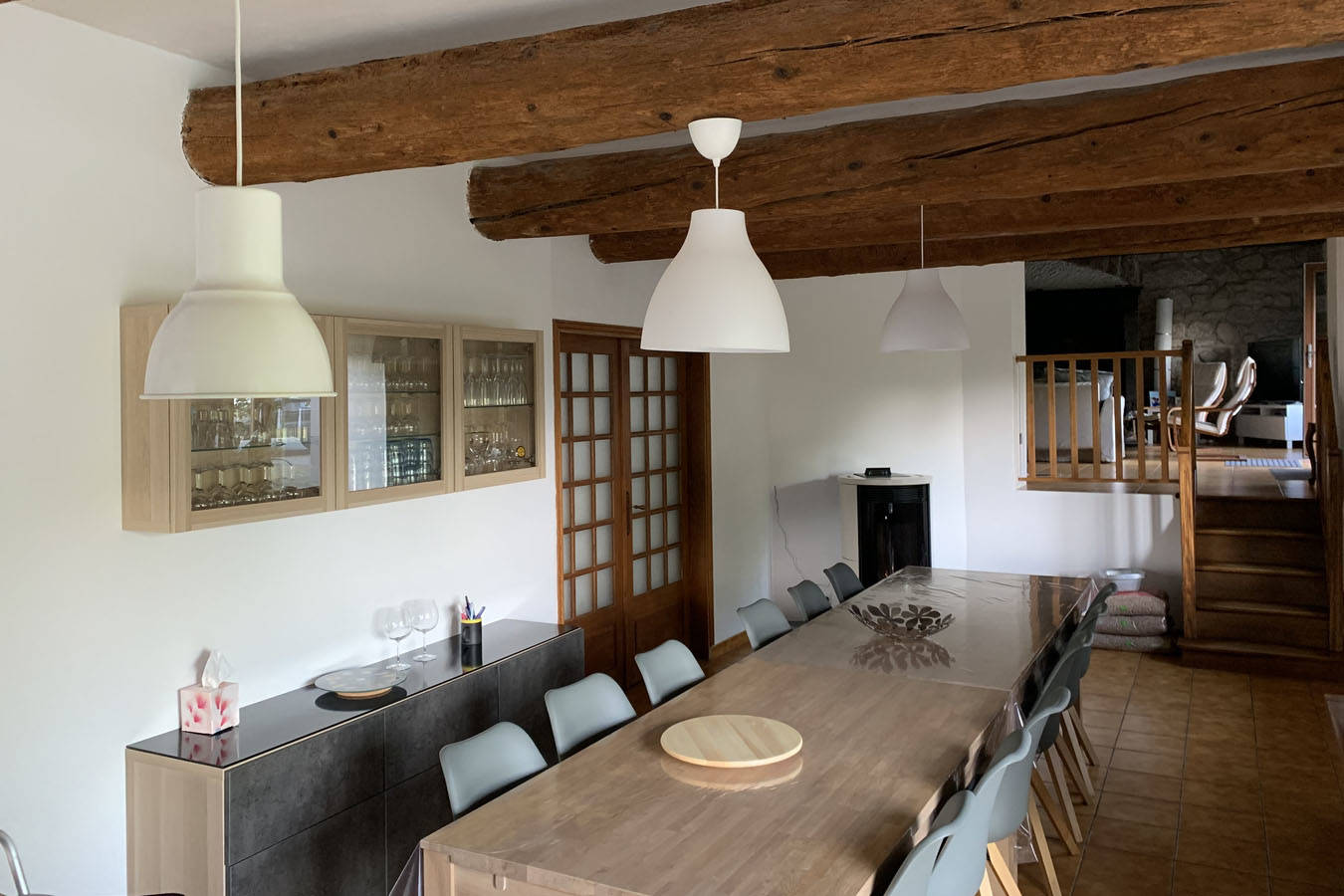 Maison de caractère, rénovée avec cheminée dans le salon et poêle à granulés dans la salle à manger (bois et granulés fournis), 3 salles d’eau (douche au RDC et baignoire à l’étage), 3 WC.