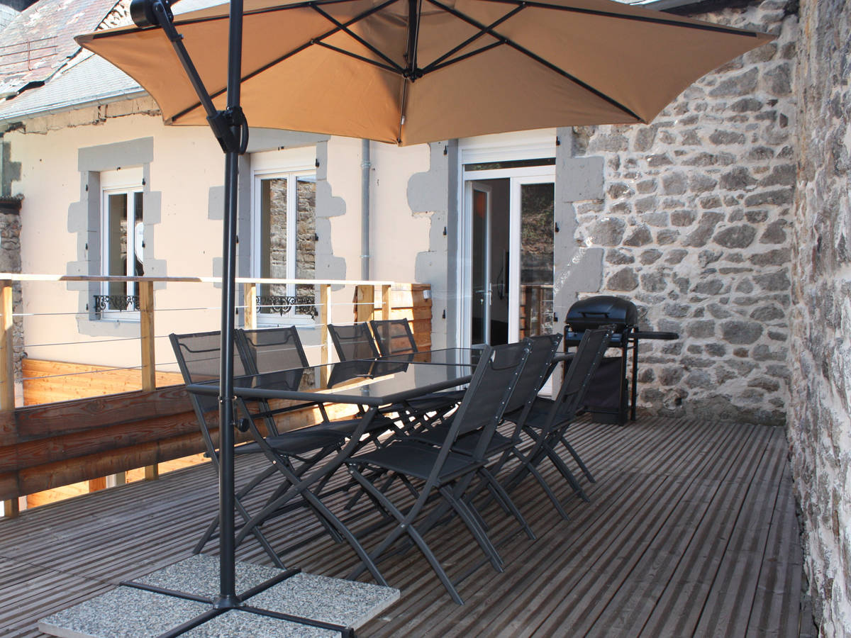 – Grande terrasse en bois (25/30 m²) avec accès direct par la pièce de vie : tables et chaises de jardin, Barbecue gaz fourni.